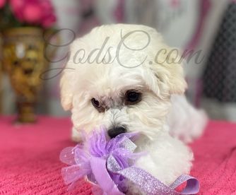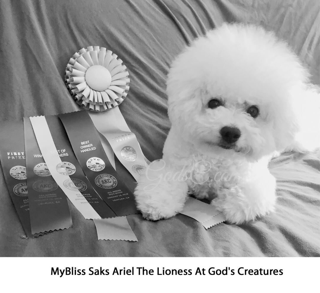 I'm Elizabeth B., the breeder behind God’s Creatures located in Apple Valley, CA. We breed according to the Bichon Frise AKC breed standard. We test eyes, hips, & patellas (kneecaps) with OFA. All our dogs are raised in our home. We compete in AKC events such as obedience, rally, conformation, and also test to achieve trick dog title and canine good citizen title.