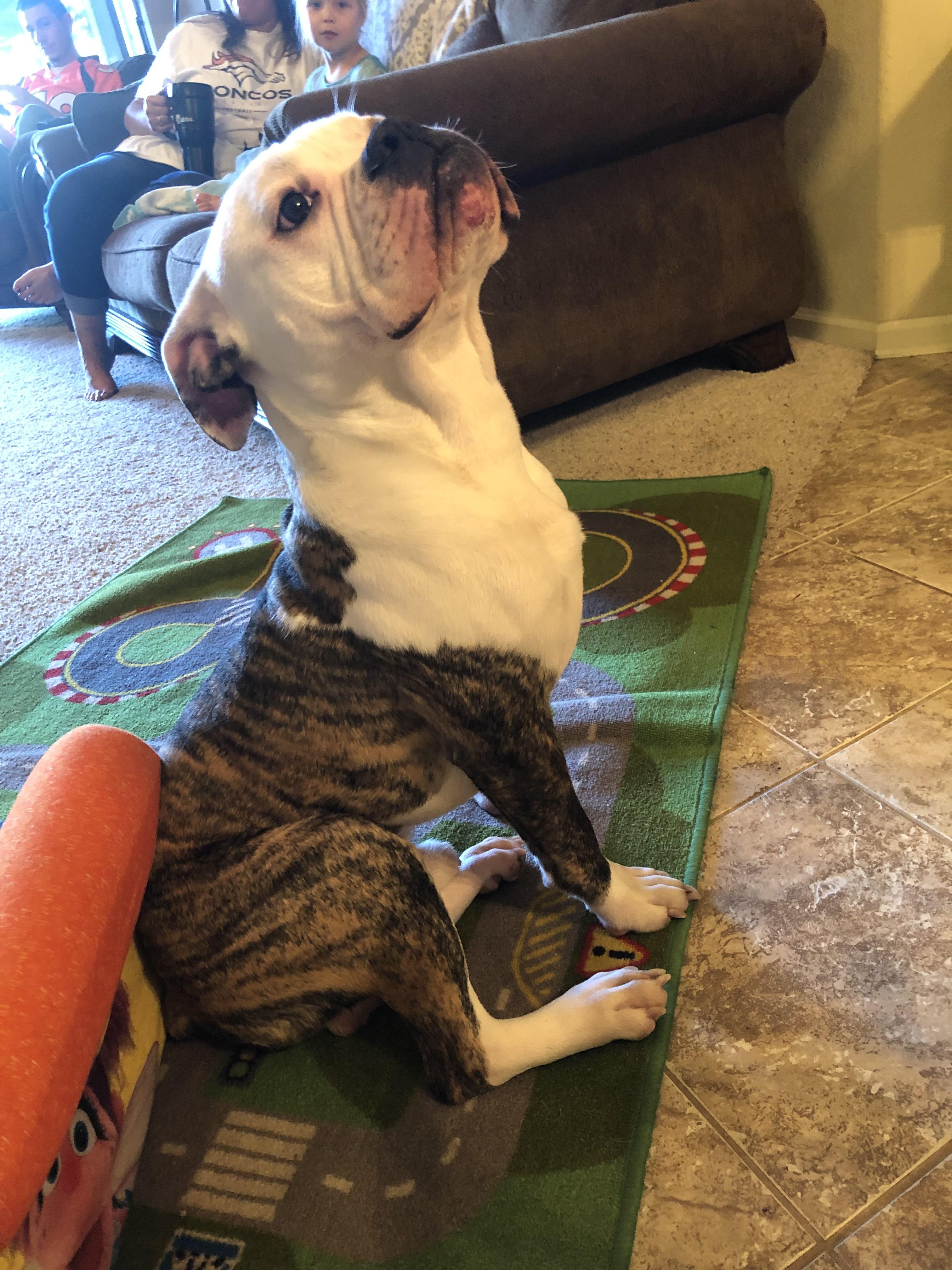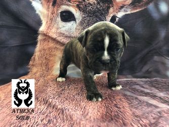 Athena is a female Olde English Bulldogge almost 7 years old. Carefully selected as a great representative of her breed, Nicole decided to make her part of their program. Nicole has passed Good Dog’s screening process, which involved a review of their breeding practices, environment, and the mental and physical health of their dogs.