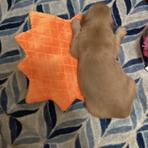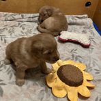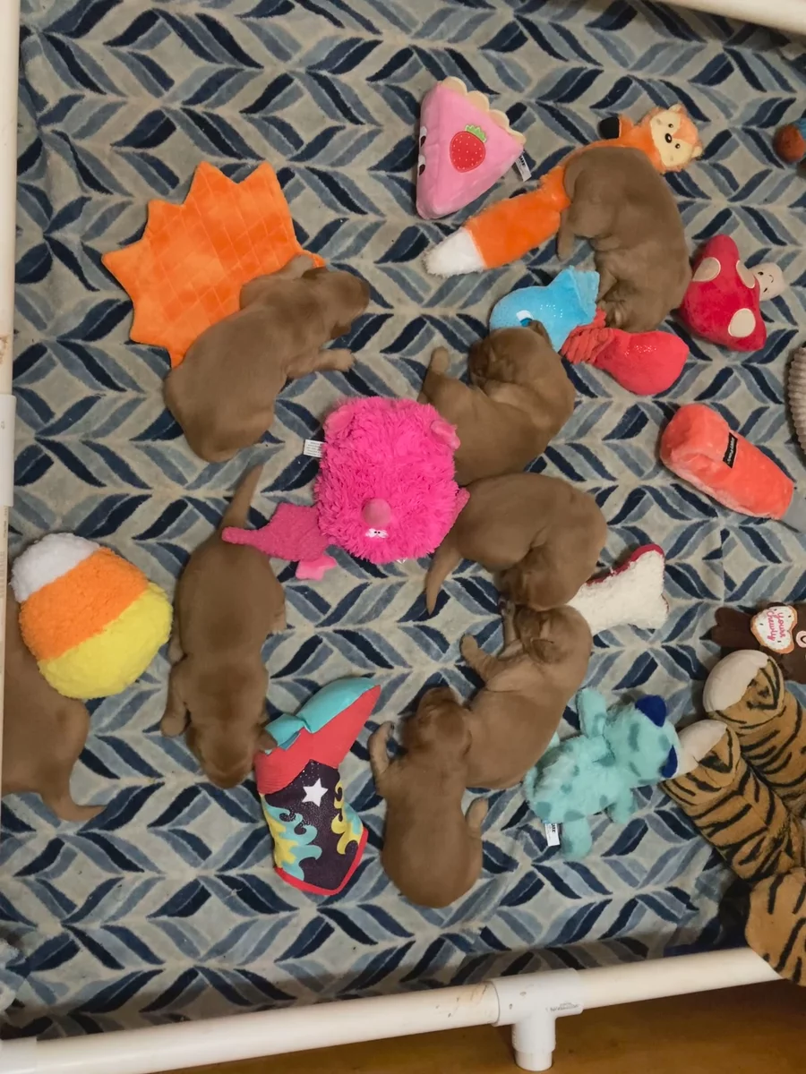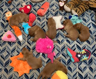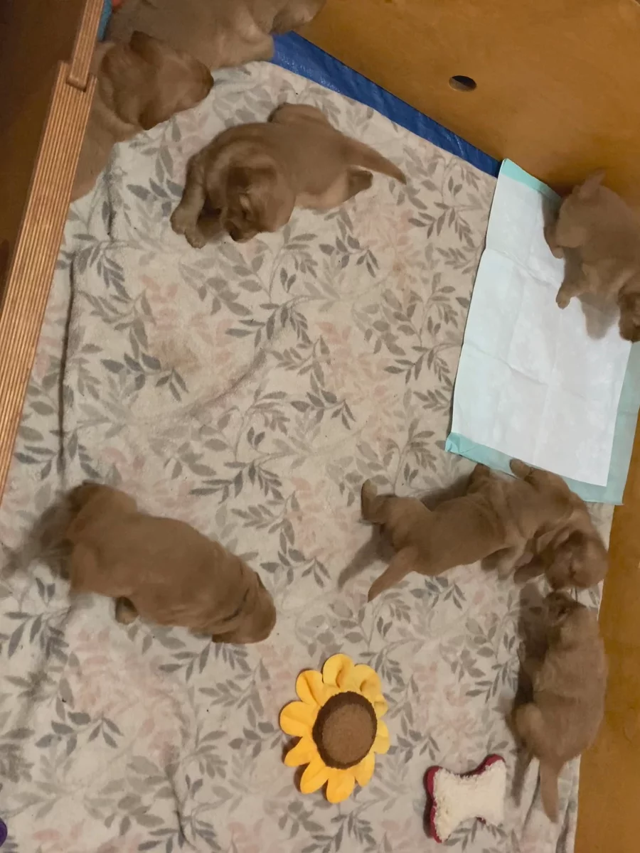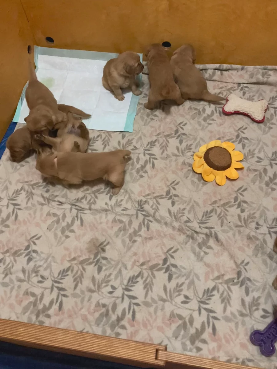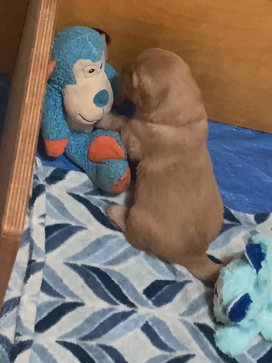Our Valentine’s girls are 2+ weeks old. They can really get around. I’ve put a wee wee pad in for them, and several are already using it! They are putting their energy into mobility and learning about their environment. They have just started to explore the variety of toys available to them and play with each other.