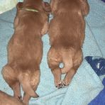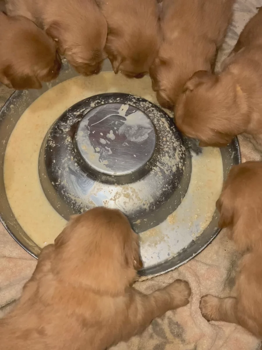 The puppies have been started on food. It is a homemade recipe created for healthy minds and bodies, and then put into a blender. Right now they eat twice a day plus mom. They will be having three meals a day next week and until after they go to their forever families. They are coming into the living room during the day to get used to new sights, smells and become accustomed to a higher activity level. They are truly amazing at using their wee wee pads.
