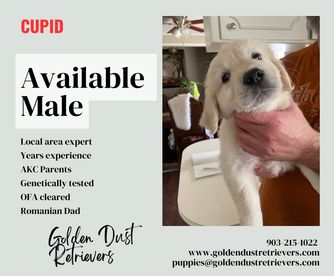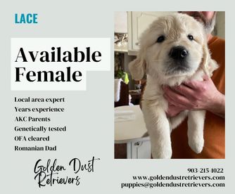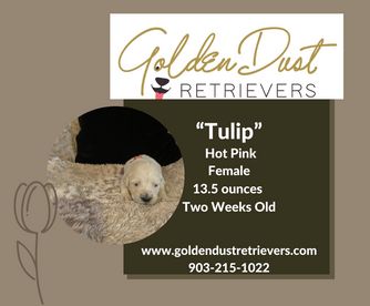 I'm Amity R., the breeder behind Golden Dust Retrievers located in Longview, TX. We hold ourselves to high standards for the integrity of our program. All of our puppies are socialized, nurtured, and loved! Our mission is to improve the breed through selective breeding and ample health testing. We believe that with the collective efforts of other responsible breeders, we can improve the future of the breed.