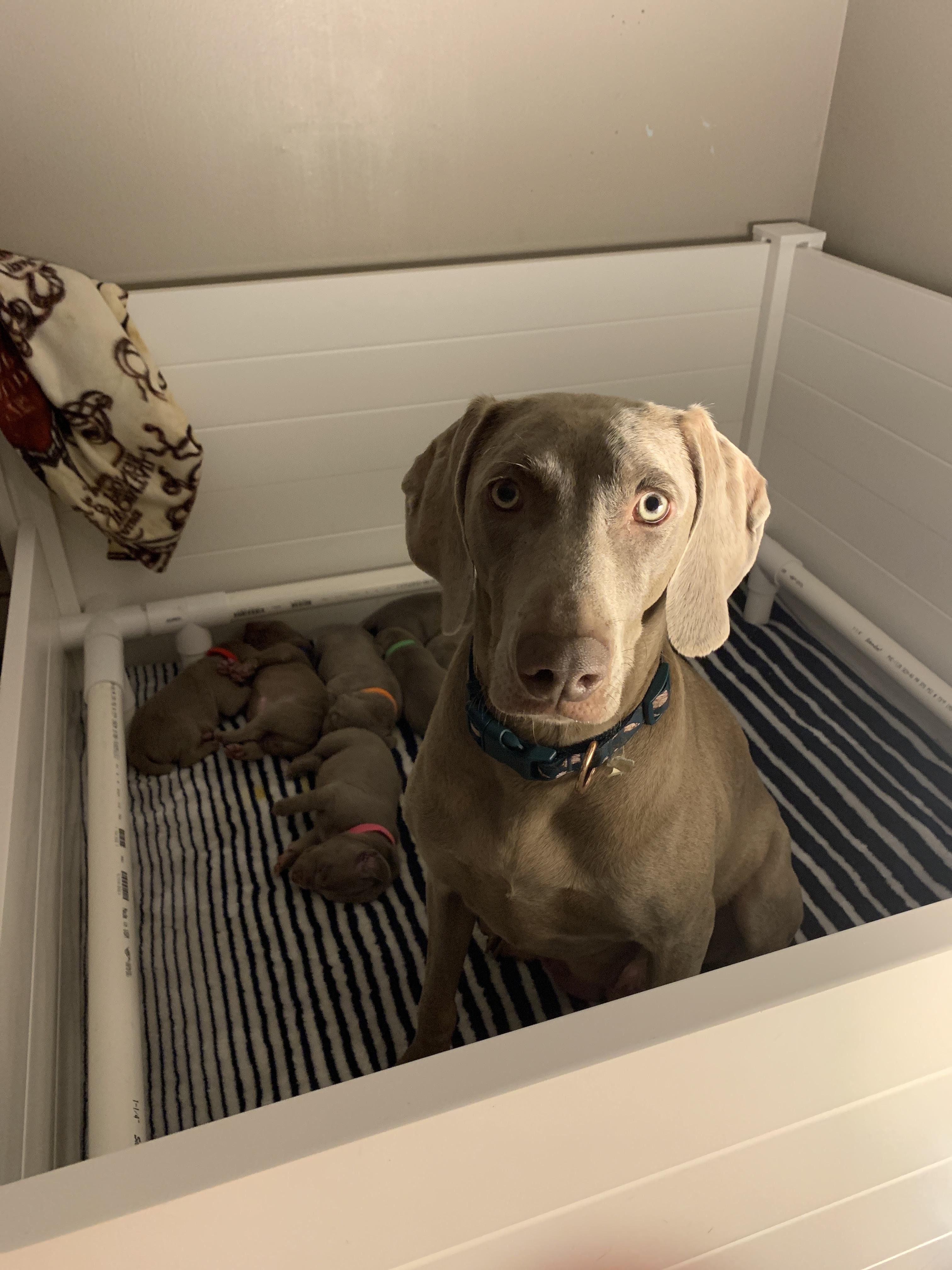 My parents bred Weimaraners my entire childhood. My mother had Weims growing up and loved them. When I was about 3, my parents bought me my first two dogs that would later become some of our best. Seana was an import from Germany. She had it all: size, brains, and excelled in both the show ring and in the fields hunting. She was the reason I decided to breed Weimaraners.