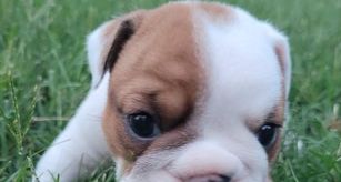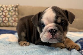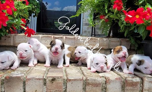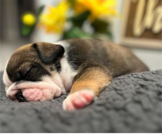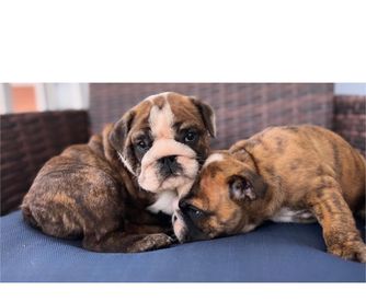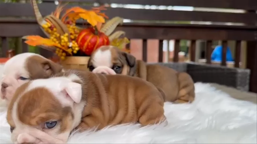 Bulldog puppies include white, red brindle and white, red brindle, red and white, fawn and white, and brindle. Colors will vary depending on the parent dogs.