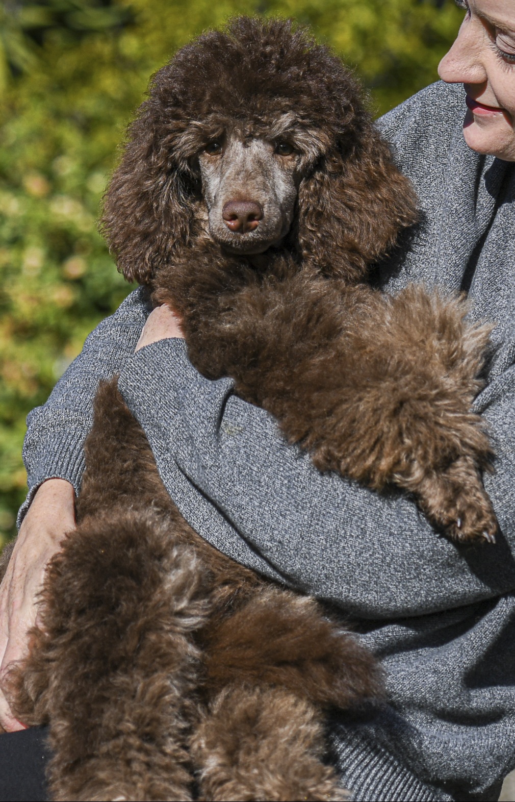 Bambi is an AKC brown parti Poodle. She weighs 9 lbs and is miniature height but comes from toy lines. (Her Mom was 6 lbs.) She is my least barky dog and she wishes to be held for most of the day. She's amazing with children of all ages as well as with adults.