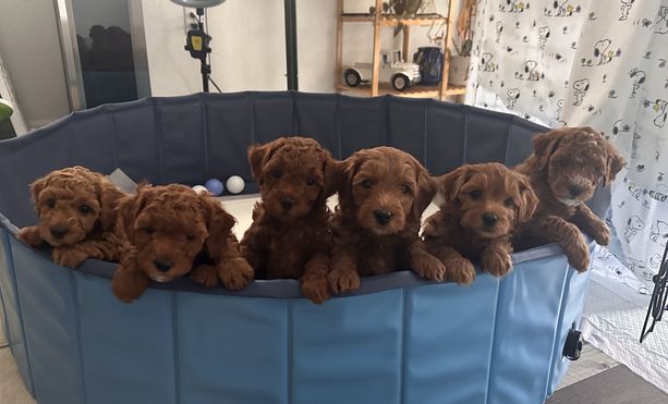 On April 28, Joy became a mama to six beautiful babiesโthree boys and three girlsโeach one born and raised right here in our home. These puppies have been showered with love, snuggles, clean spaces, and gentle socialization from day one. We believe in raising dogs that are happy, healthy, and deeply loved, because we know thatโs the kind of family theyโll soon join.