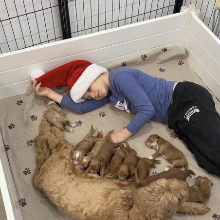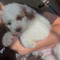For almost five years I have always been helping my aunt with her labradoodles, I would drive 30 min to help her wash, groom, welp puppies, train and prepare them for their new homes. I fell in love with these dogs and wanted to have my own. After tons of research, help and some experience, I got my first poodle from Mary.