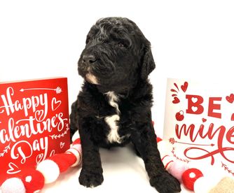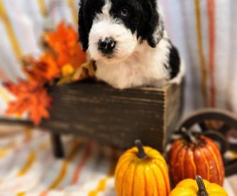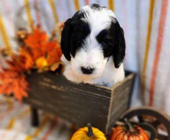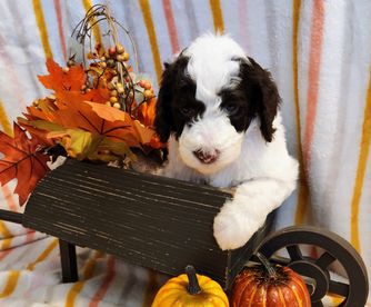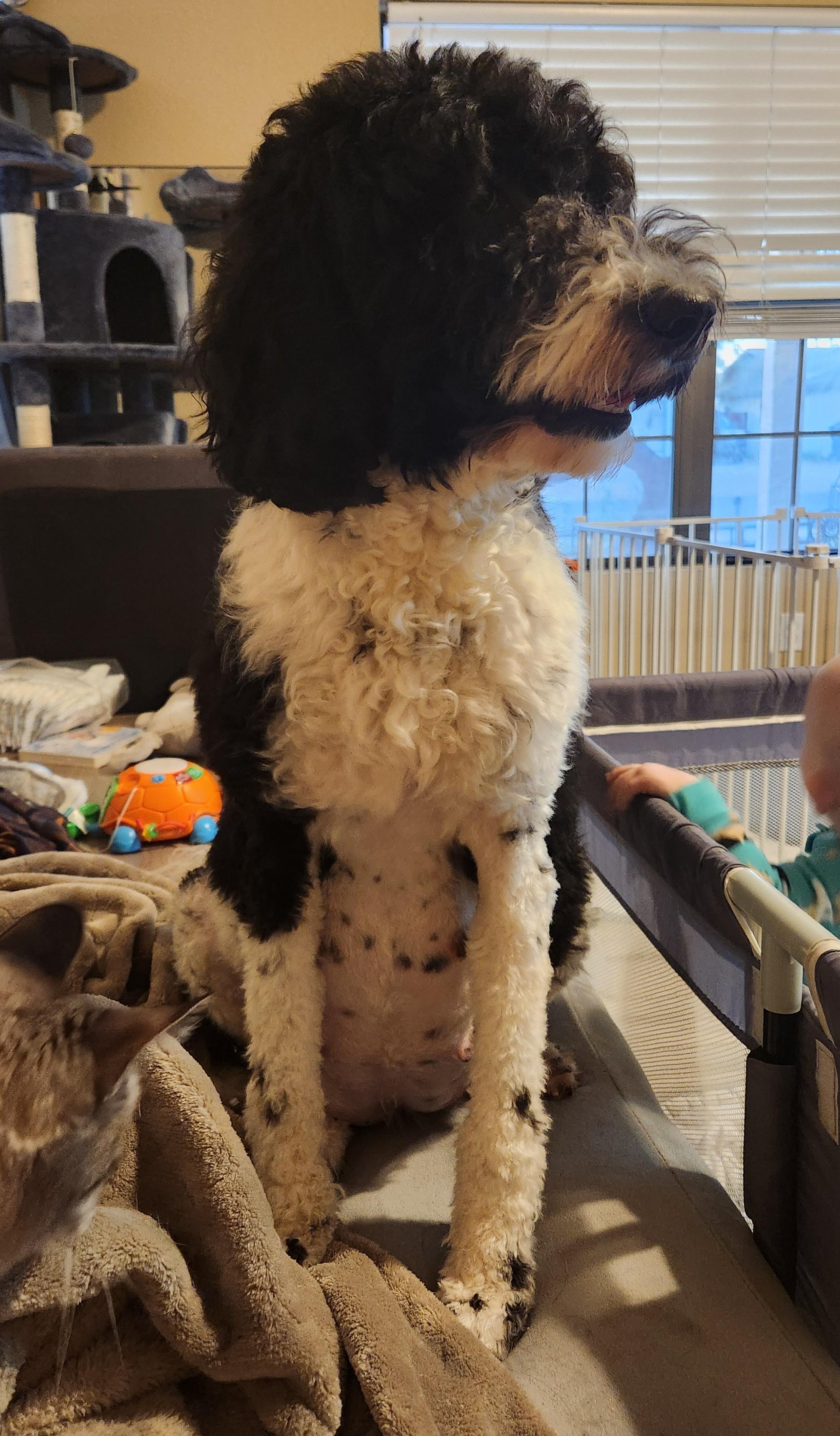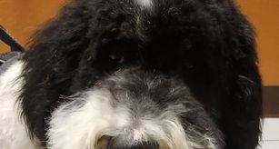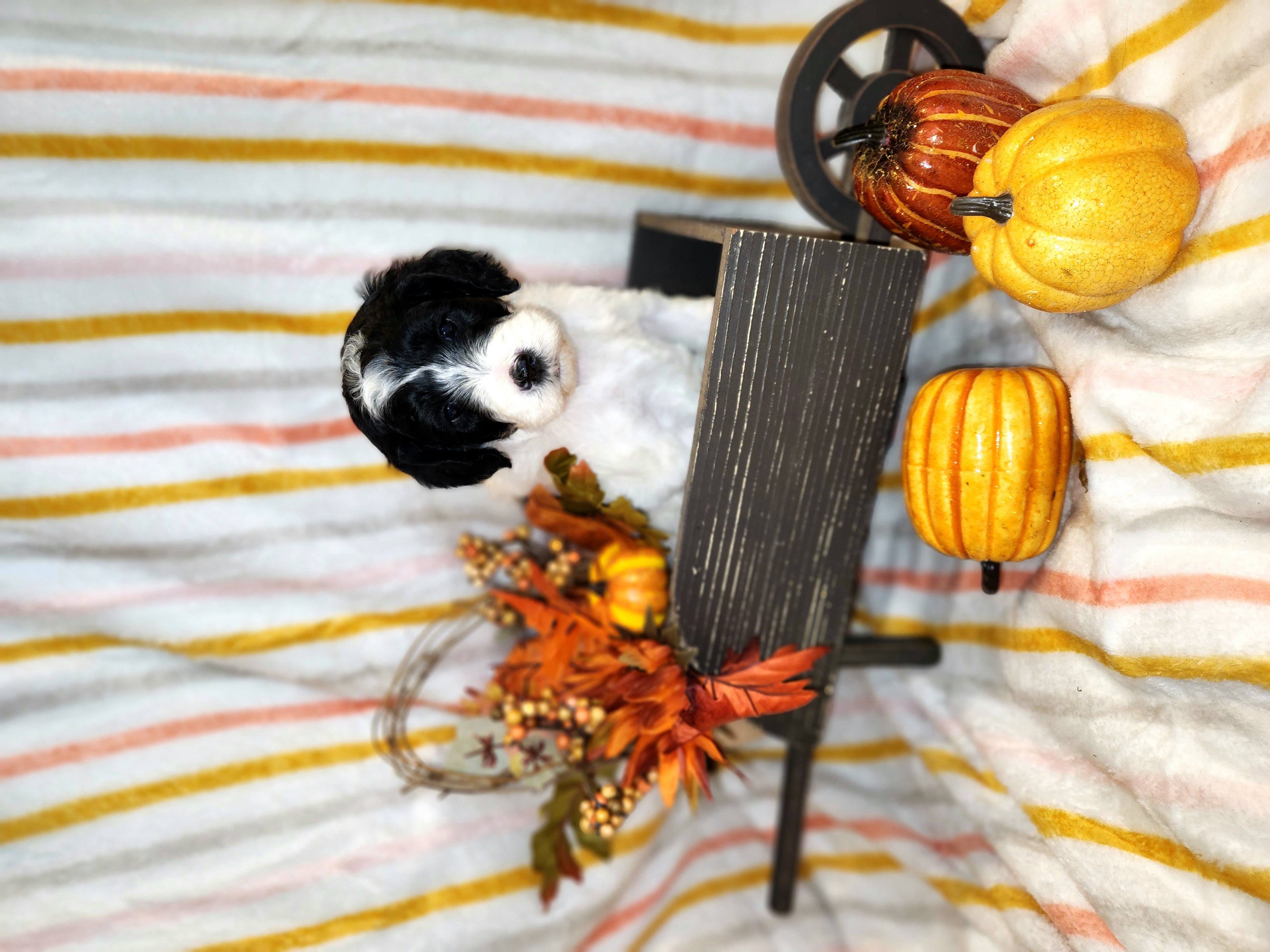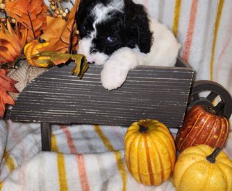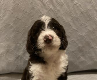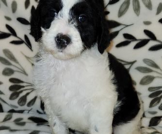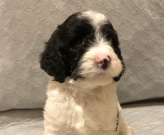 Molly is a multi-generational 28 lb Goldendoodle that does not shed and has a wavy coat. She has a tuxedo pattern and is black and white