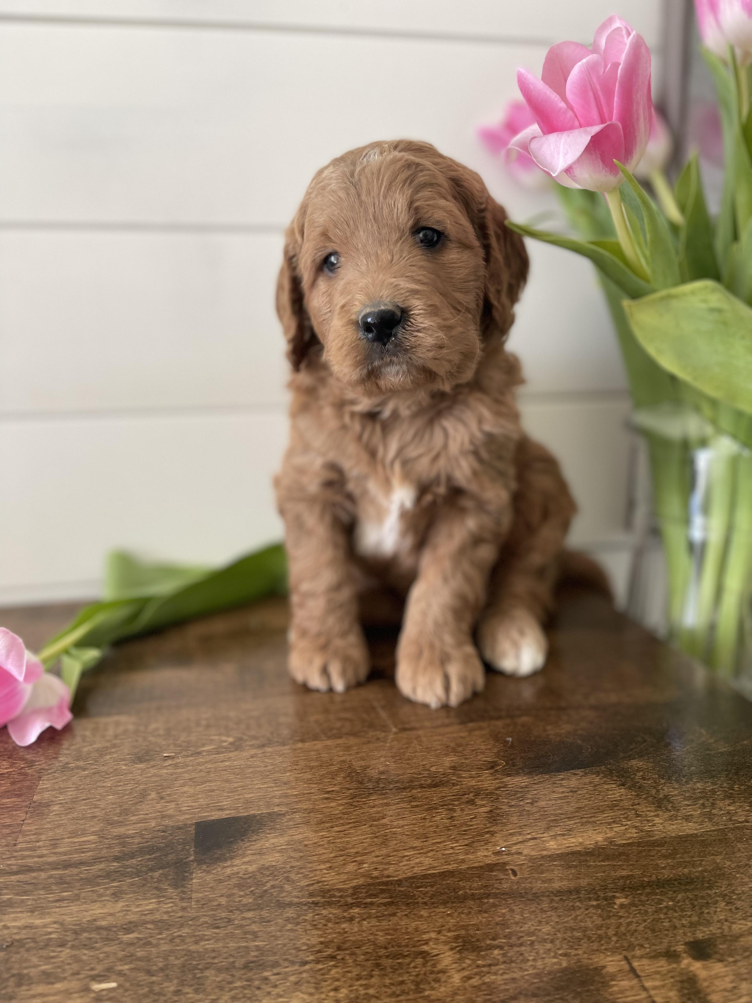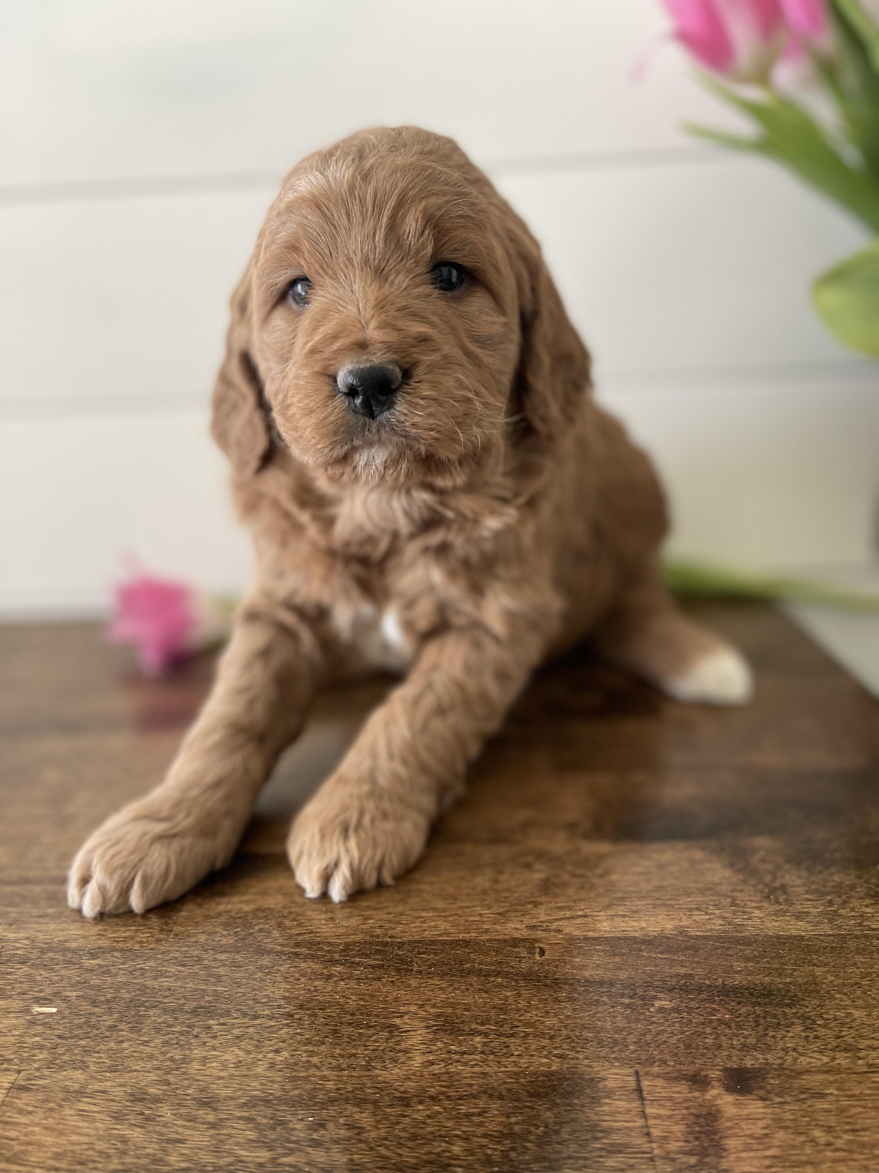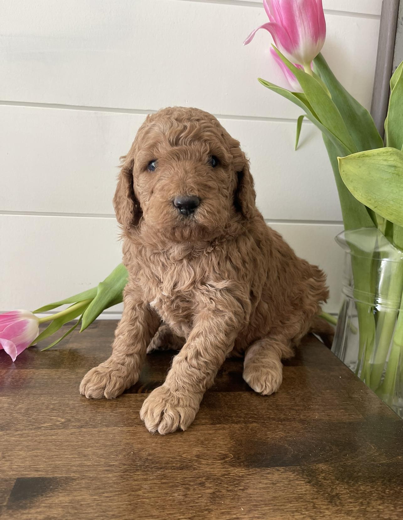 Our Goldendoodle puppies include red, chocolate, merle, and parti. Colors will vary depending on the parent dogs.