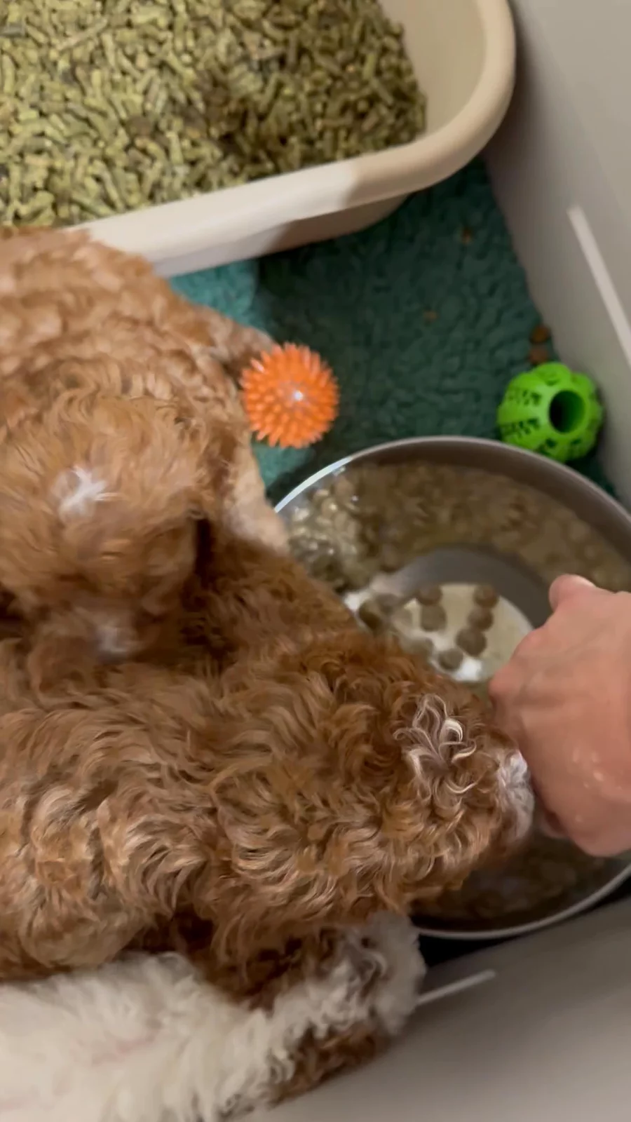 Potty training victory post! This whole crew of mini goldendoodles are doing absolutely amazing with their litter training. Almost 24 hours at this point with zero accidents for the entire group, and they’re not even 7 weeks old! People ask us a lot what litter training looks like, so I thought I’d share. Why litter? Simple - alfalfa pellets are grass. Literally compressed grass. We want our babies to learn early on that “outside” is where they need to take care of their business, but that’s not always safe before they build some immunity from their puppy vaccines. It’s also not always feasible to be accessible all day to take a new puppy outside every hour and a half. Litter training solves both problems - they learn to go on the “grass”, they have a clean and safe way to take care of business during the day when we aren’t available, and it transitions really easily to outdoor pottying on the real grass since they already associate the grass smell with their potty area. Sometimes regular pee pads work great, but we’ve found over the years that they can lead to confusion with other soft surfaces in the home - carpet and rugs, anyone? This is a win-win solution for all involved!