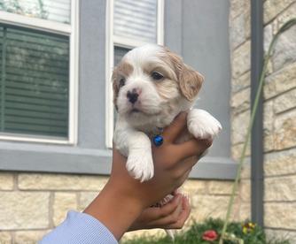Our puppies are buff and white. Colors will vary depending on the parent dogs.