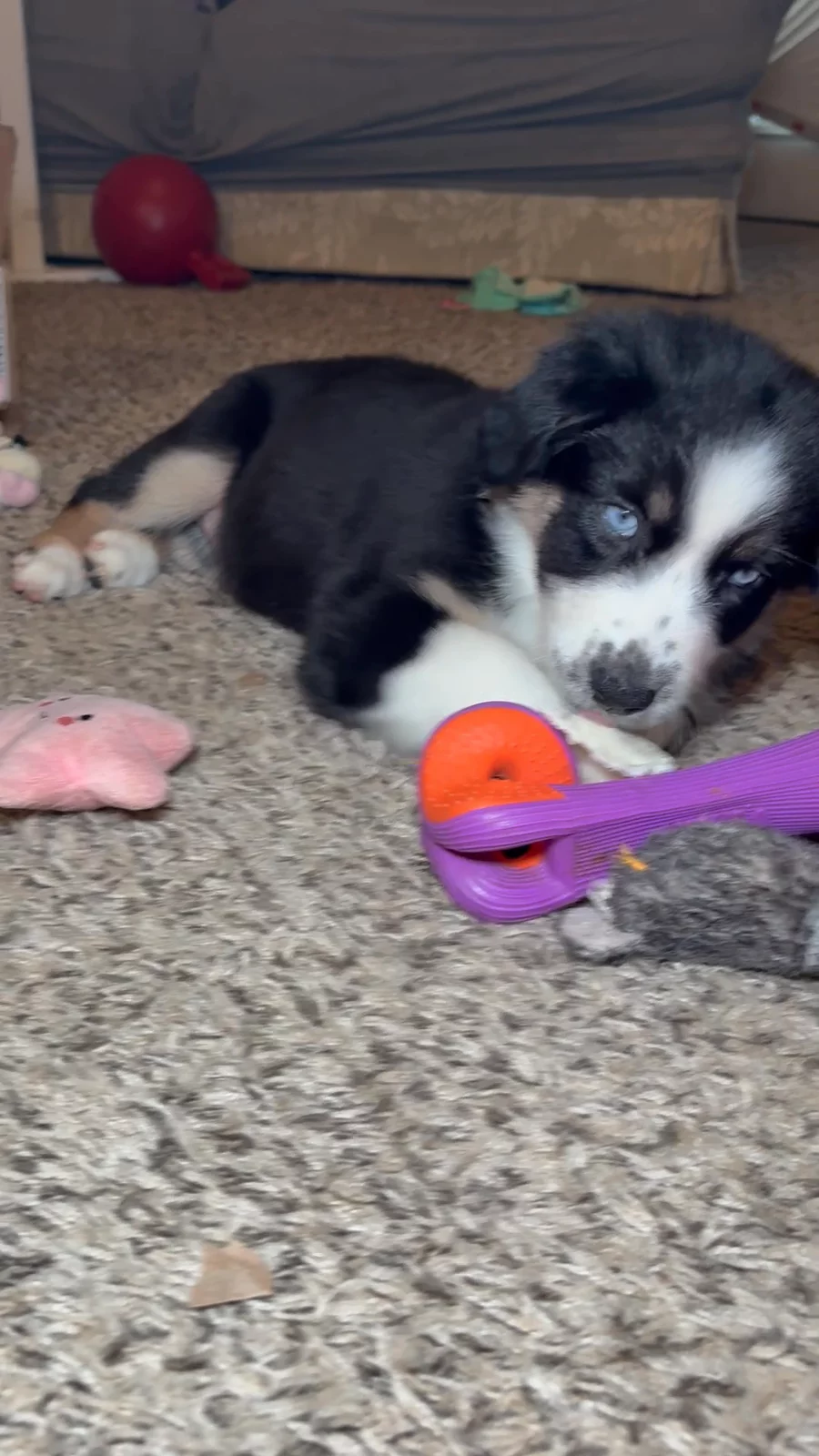 Karma is our stunning red Merle girl with a confident, loyal, and loving personality. She’s protective and attentive but has a warm, social nature that makes her wonderful with new people and families. Karma is affectionate, intelligent, and full of that classic Aussie spark — she knows what she wants and isn’t afraid to take charge, especially when keeping Khaos and the rest of the crew in line. She loves her daily runs, playing fetch, and having a job to focus on, making her a great fit for dog sports or active households. Karma’s drive and athleticism are perfectly balanced by her sweet, loyal temperament. She’s also great with cats — though every now and then, her herding instincts kick in and she’ll try to keep them “organized.” As a first-time mom, Karma has been incredible — gentle, nurturing, and devoted. She passes down her intelligence, strong work ethic, affectionate nature, and eye-catching red Merle coloring to her puppies, making them the perfect mix of beauty, brains, and heart.