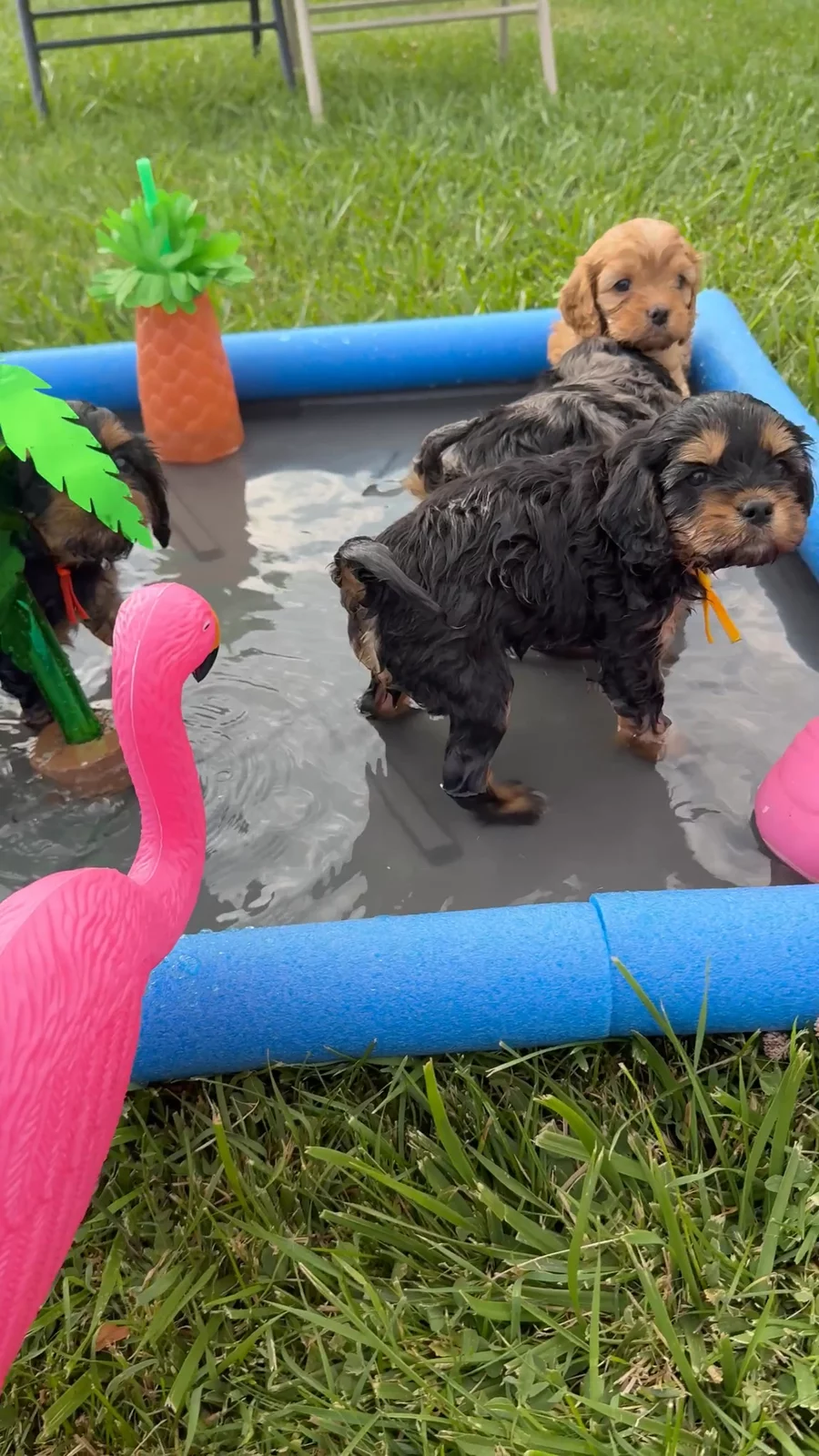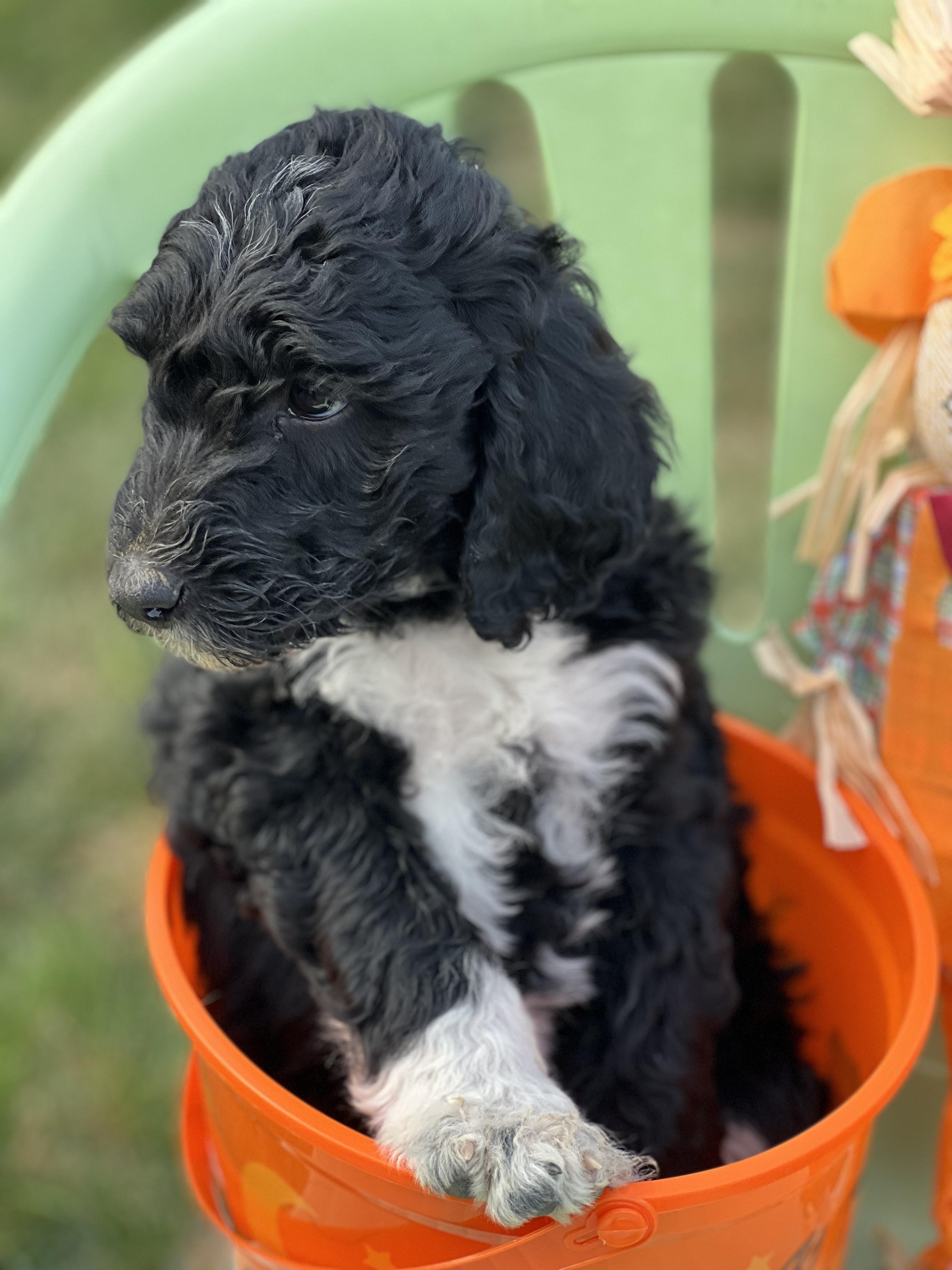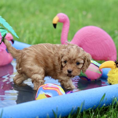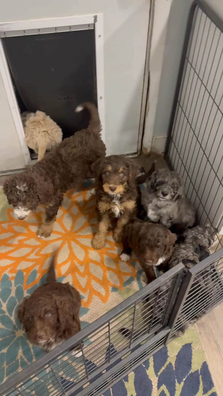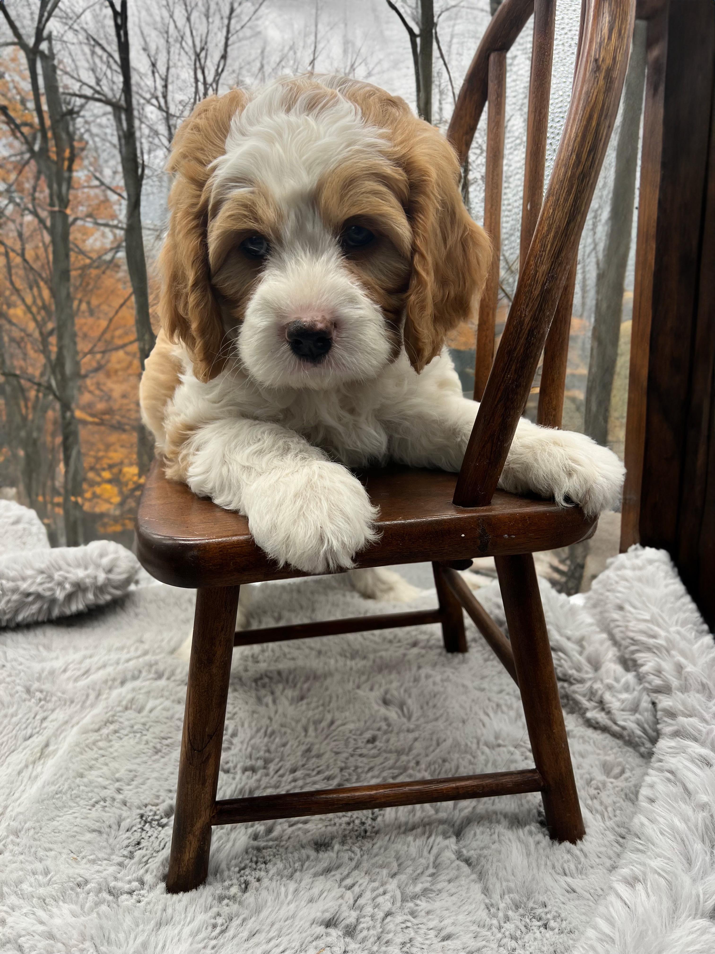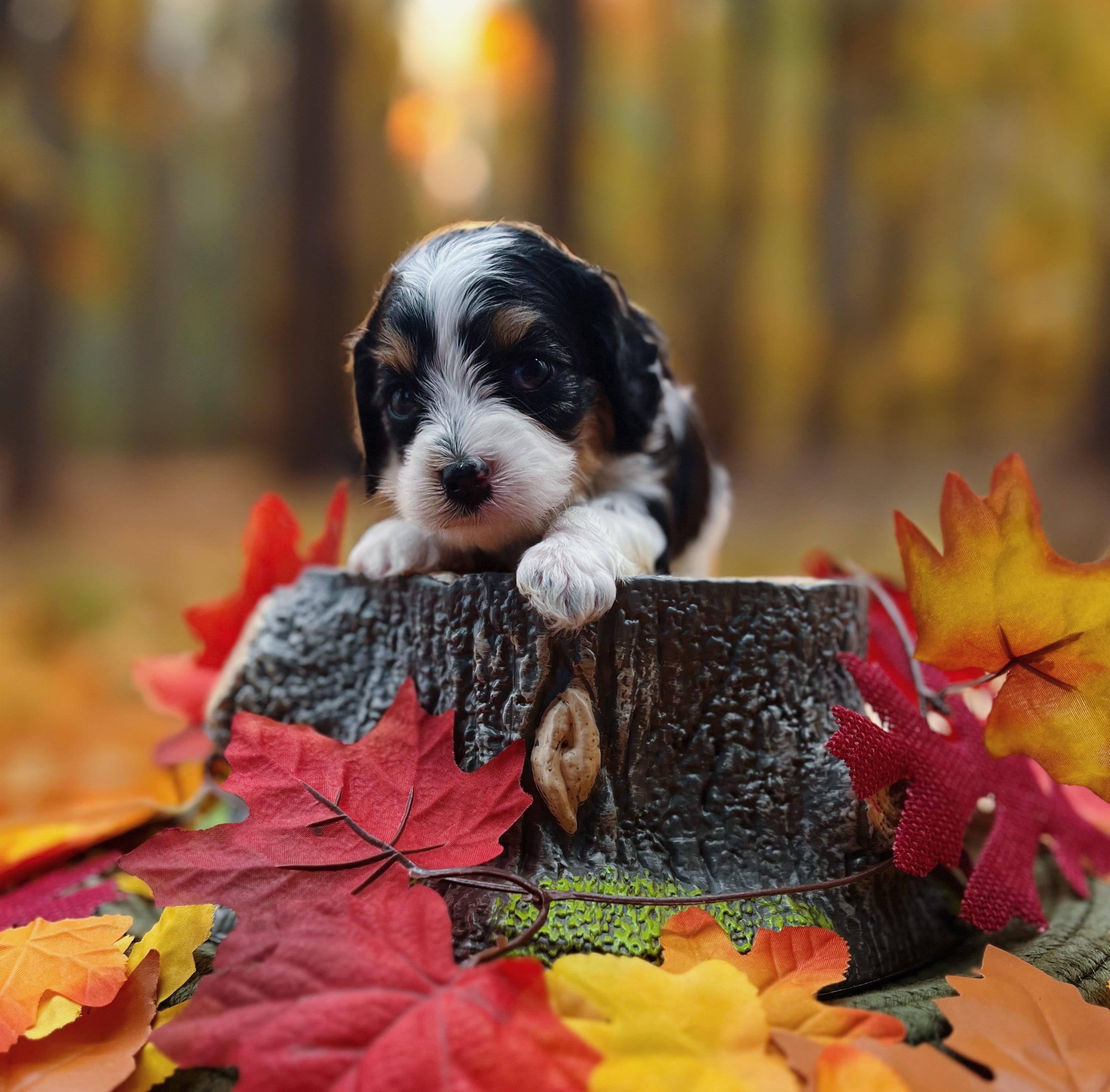Our Bernedoodle puppies are tri-color. Cavapoo puppies include merle, blenheim, tri-color, red, and black and tan. Goldendoodle puppies include cream, apricot, merle, and parti. Double Doodle puppies include black and apricot. Colors will vary depending on the parent dogs.