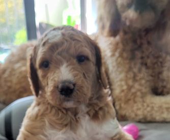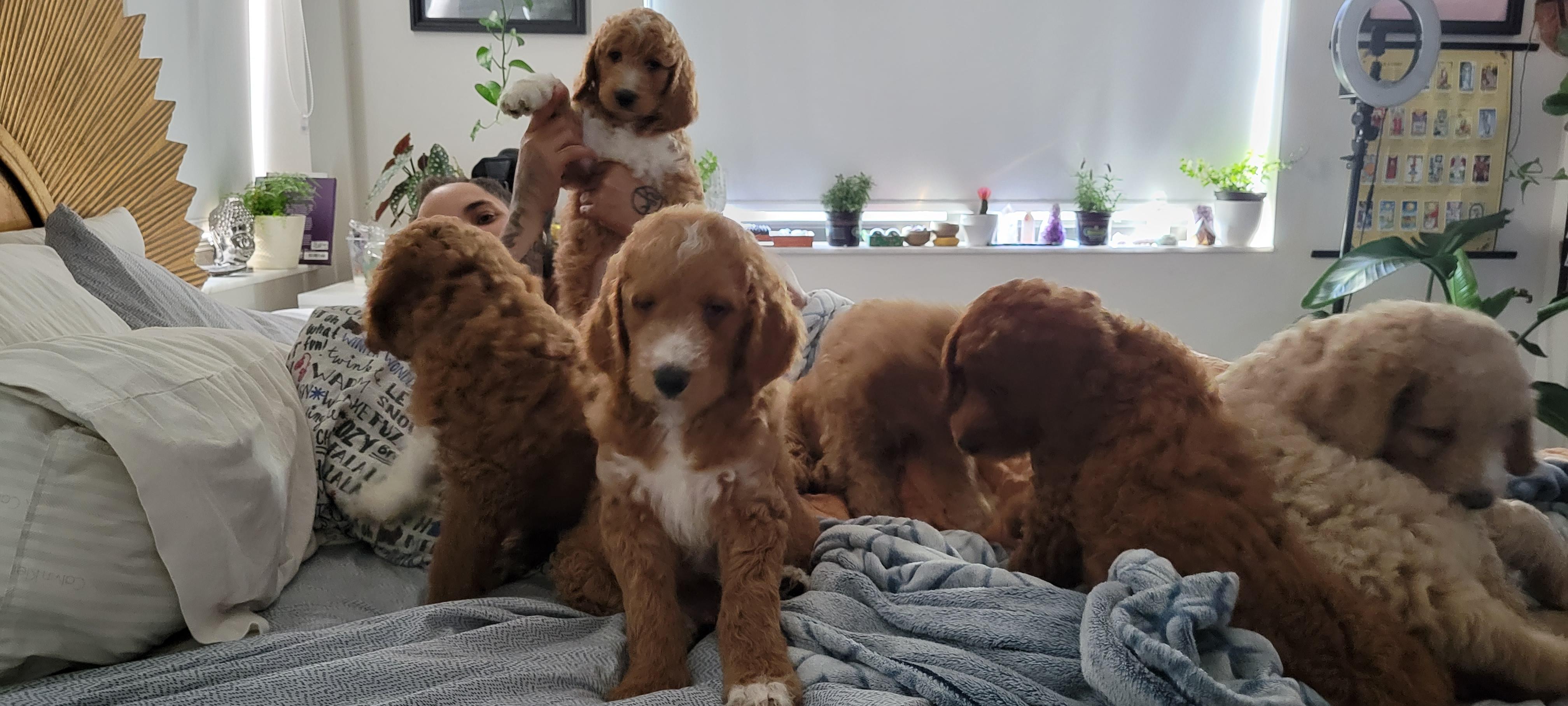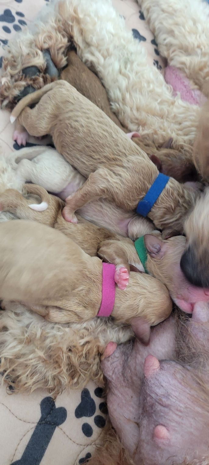 Our Goldendoodle puppies are cream. French Bulldog puppies are blue fawn. Colors will vary depending on the parent dogs.