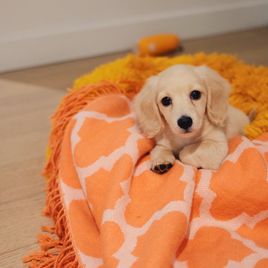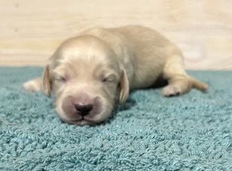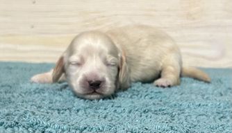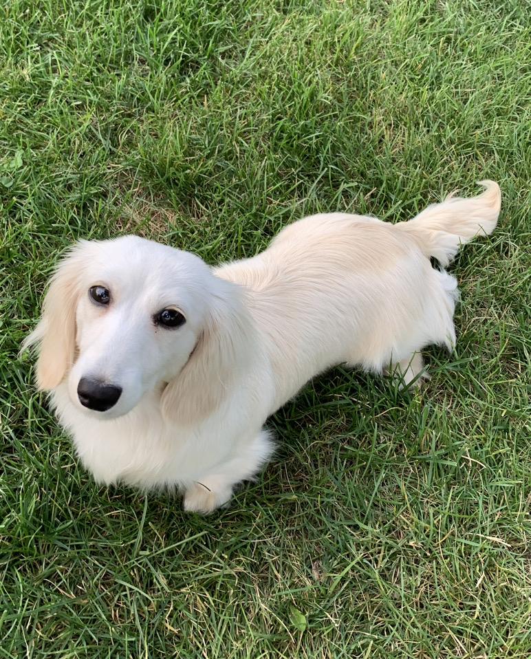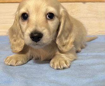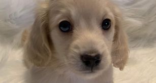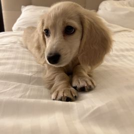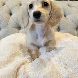 Beckett is a gorgeous clear cream hidden dapple miniature dachshund. He has a very calm, even temperment and is the son of our Liam whom produced many beautiful, well tempered pups before his retirement.