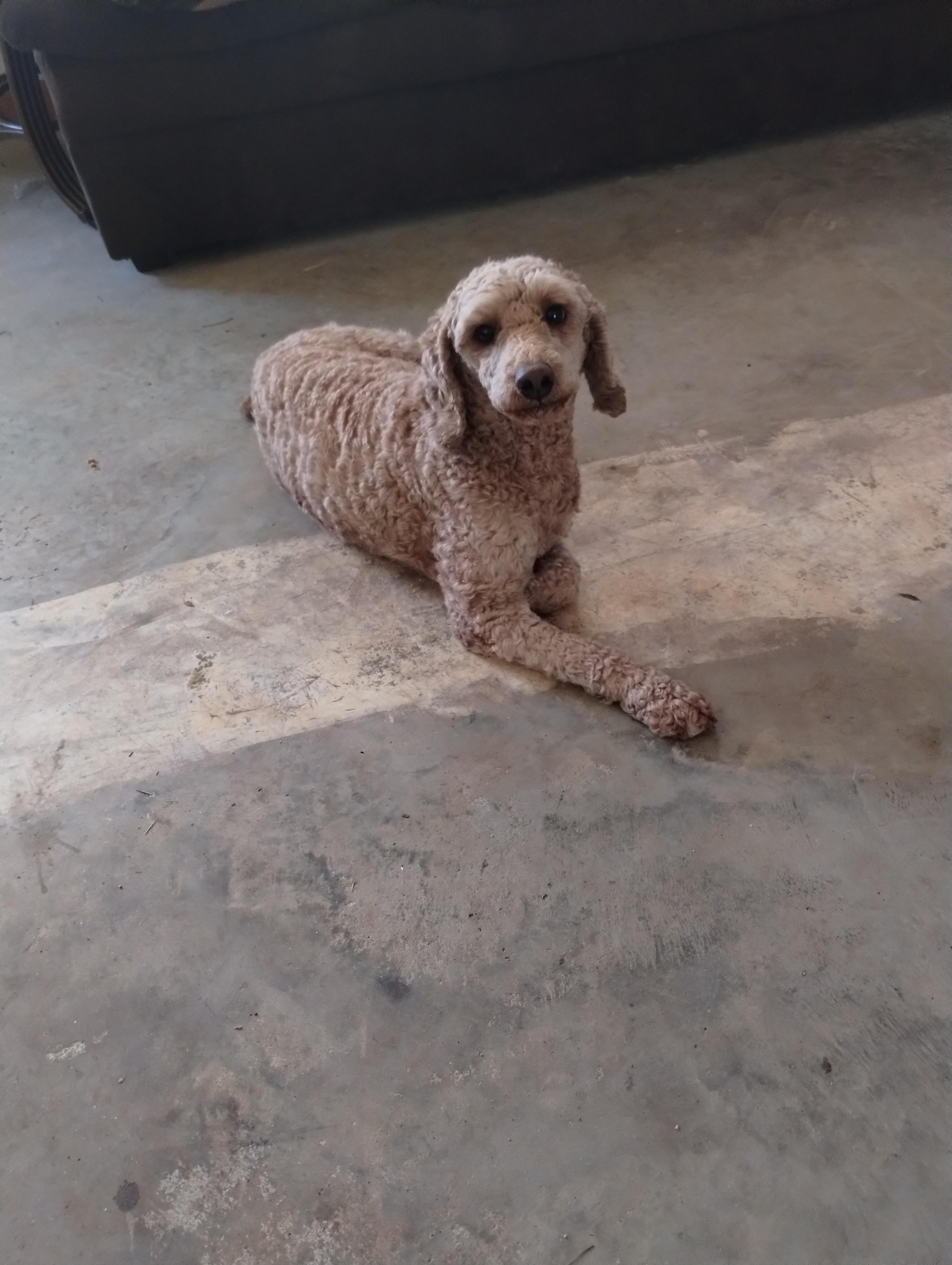 Maggie's is a beautiful loving poodle. She comes from a long championship bloodline. She is a sweetheart and a great mother. She loves to play, take boat rides and swim. She is also our loved farm dog and loves helping the family farm. Maggie is 14/15 inches.