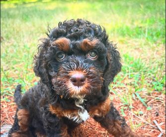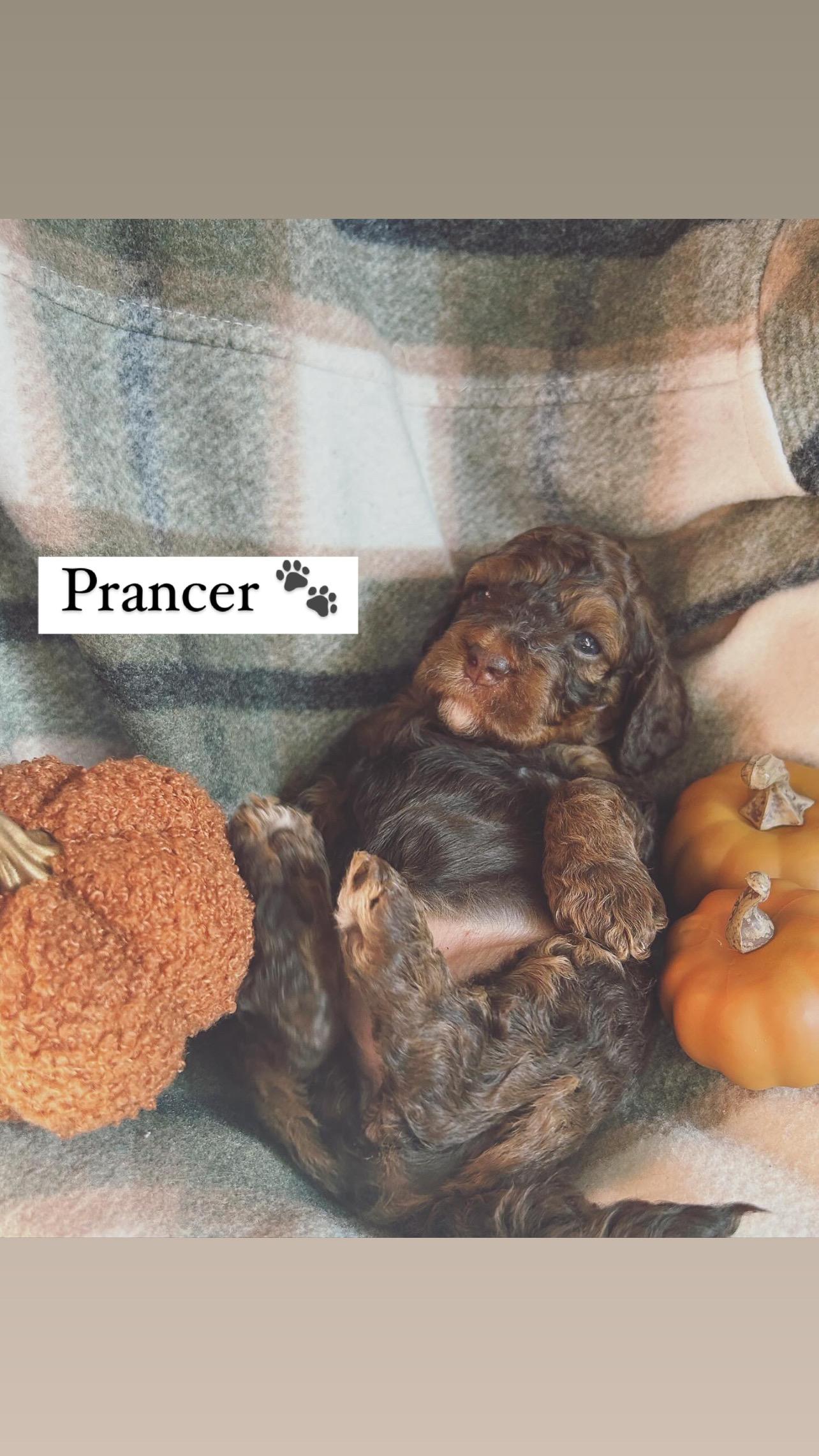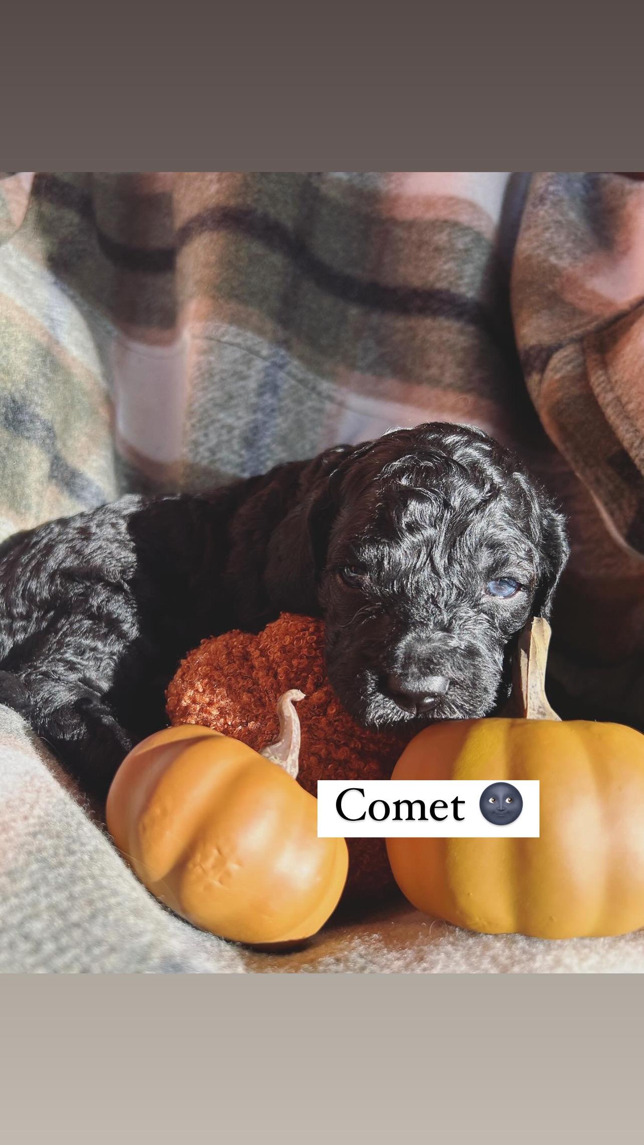Our Chocolate Parti girl w/ phantom markings & golden eyes, loose curly coat & very soft, resides in a guardian home. She is their very sweet girl just like her name 🍪. She dotes on her family of four with two hooman littles under 3! Much like her momma, Shandy, she is quiet & wants to be in the room with you at all times, with a slight mischievous & silly side 🐶