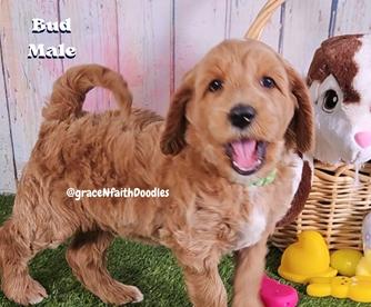 Our Labradoodle puppies are red. Goldendoodle puppies include red and parti. Colors will vary depending on the parent dogs.