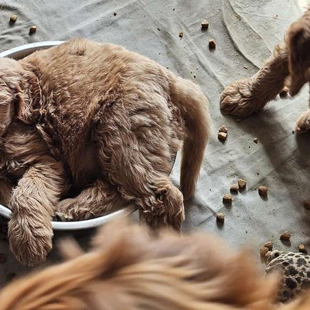 We have a poodle stud dog with an incredibly sweet nature and gorgeous red tuxedo markings. Our mama dogs also have incredible temperments and great genetics. We raise all of our pups in our living room. Every puppy gets ENS and is exposed to kids, cats, and the chaos of normal life. We use Puppy Culture protocols to give them a great foundation for the rest of their lives.