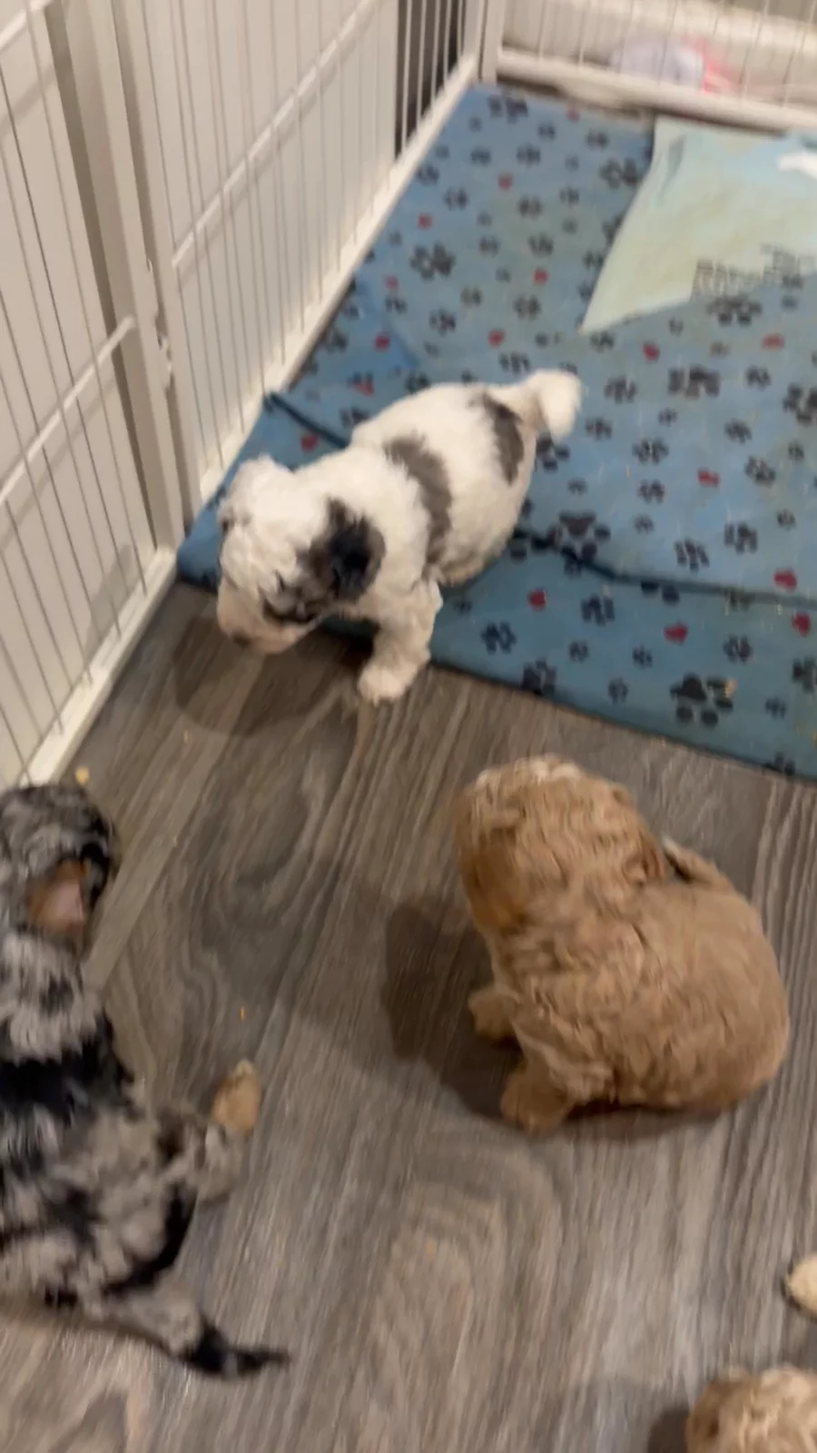 We are five weeks old. Time is flying and we are growing and changing every day. We are starting to eat hard food and drink water but still prefer mom. We love to bark, fight, play and make messes. We have been wormed twice and are learning to use our litter box. We go in one week for our vet check up and first shots and third worming. It's hard to believe that we only have two more weeks of these dumb photo sessions that we hate until we go home. We will contact everyone when the babies are seven weeks old to set up times to pick your babies up. 💜