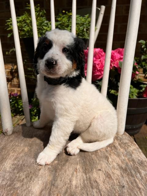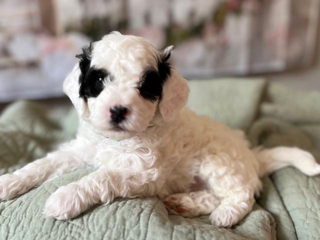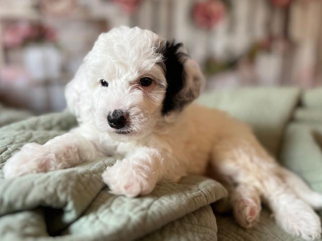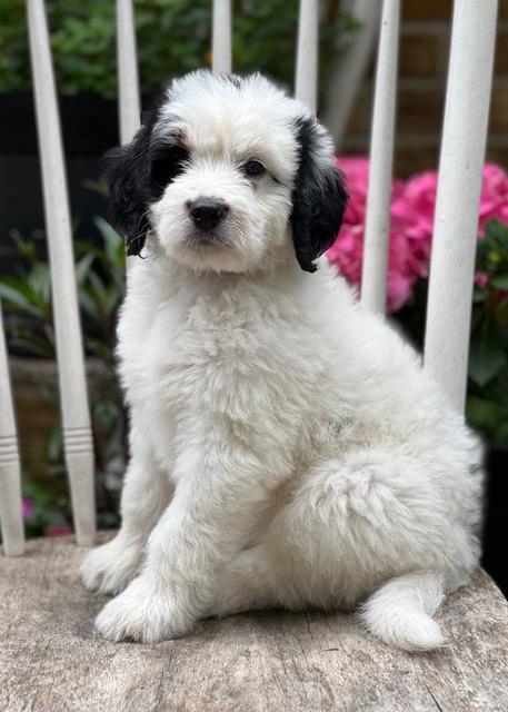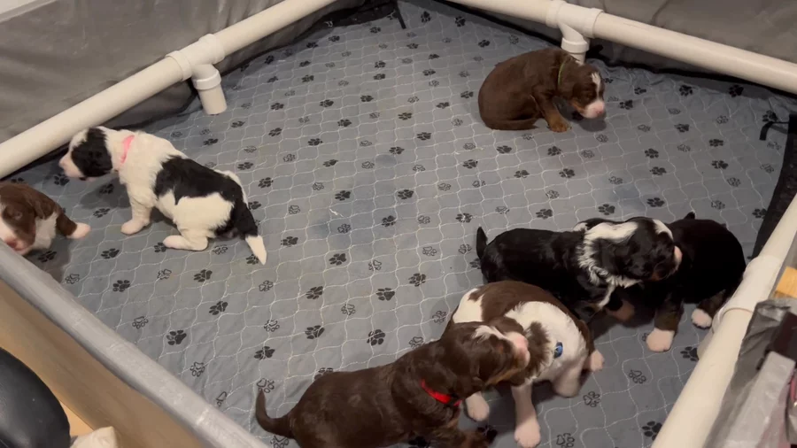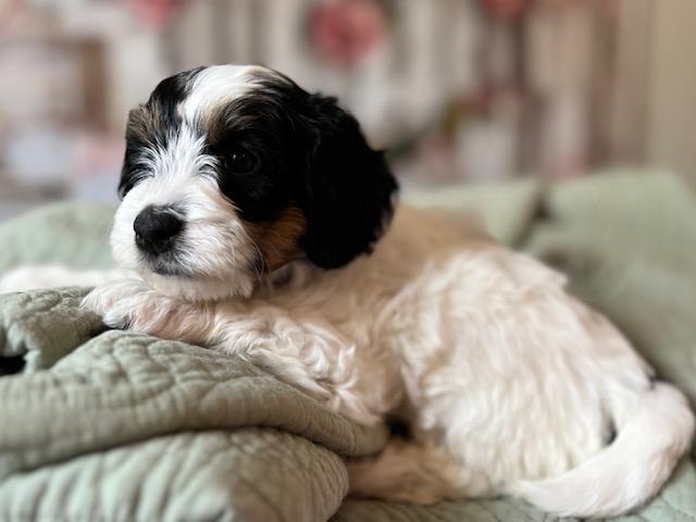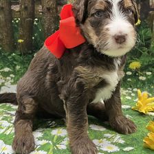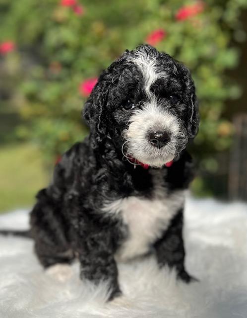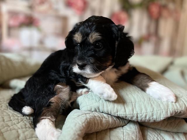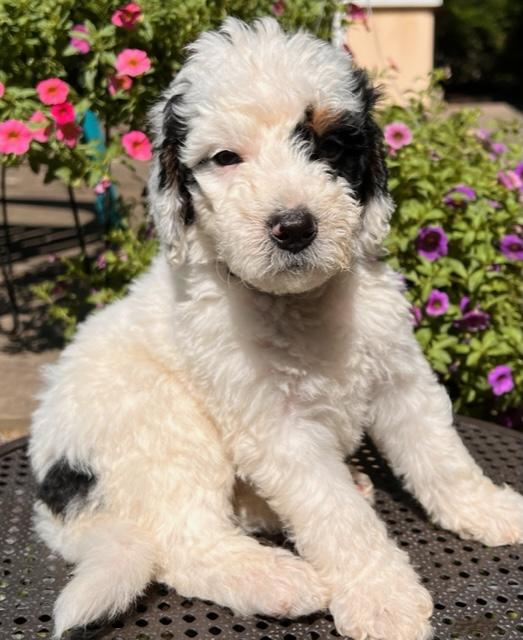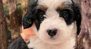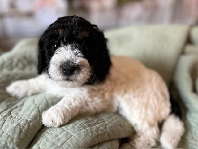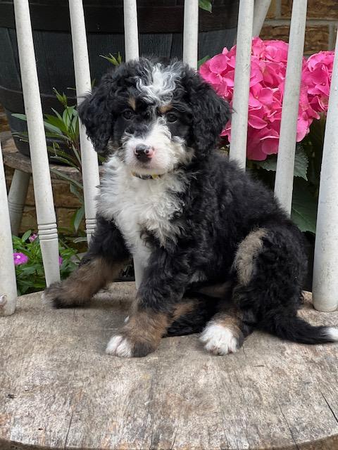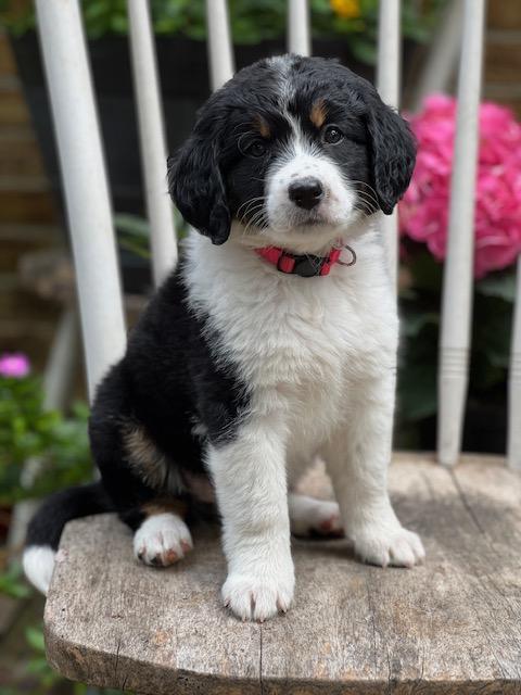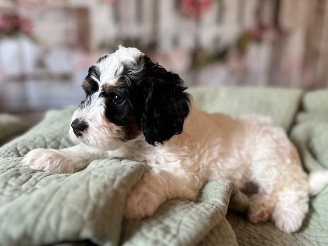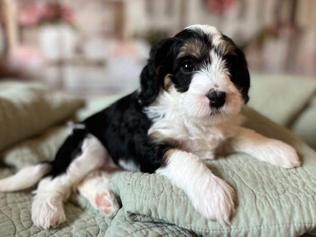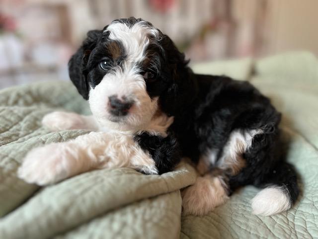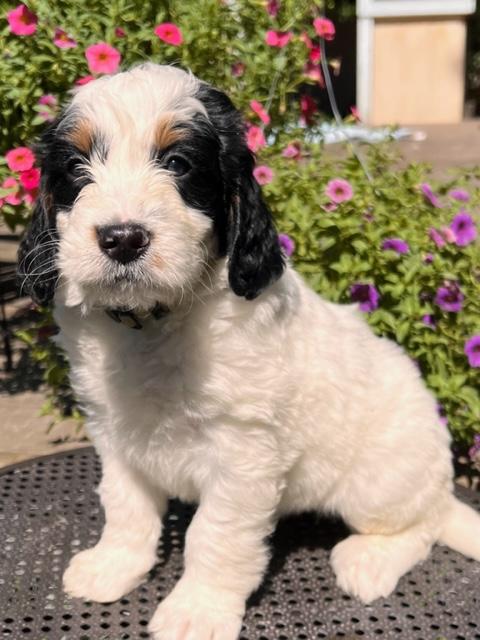 Our Bernedoodle puppies include black and white and tri-color. Goldendoodle puppies include cream, apricot, and parti. Colors will vary depending on the parent dogs.