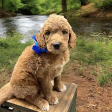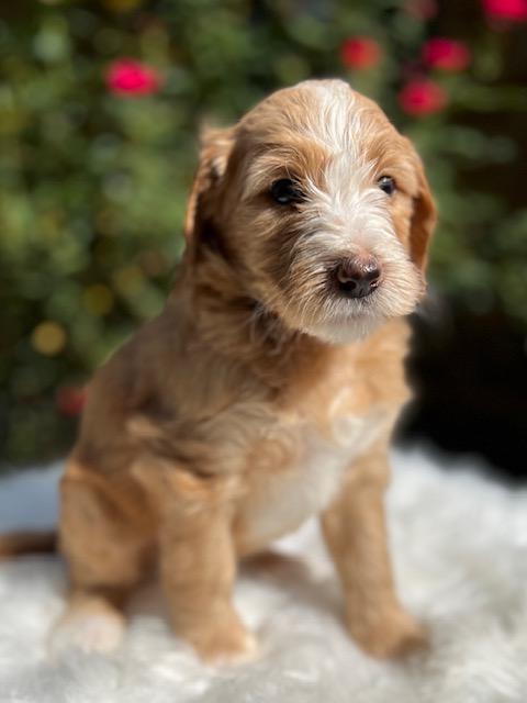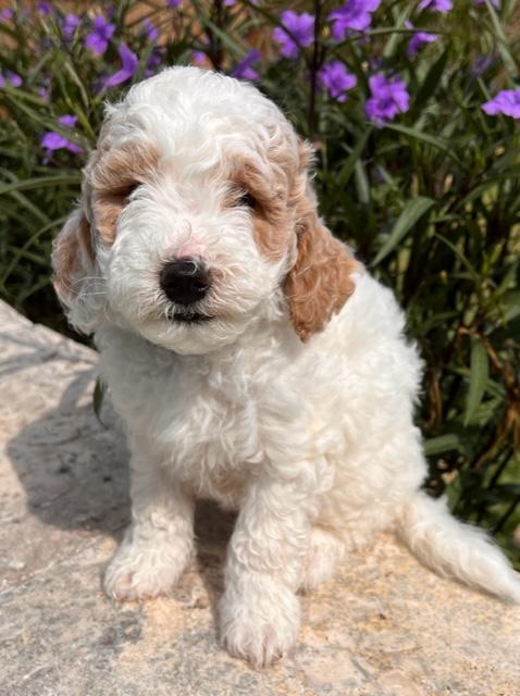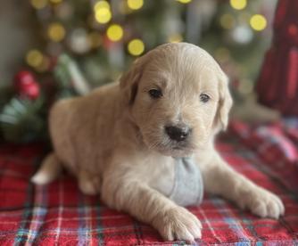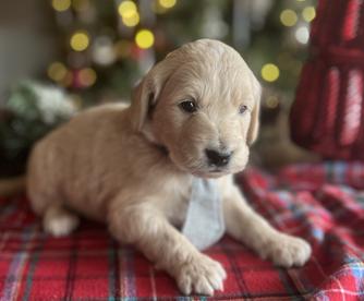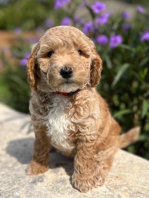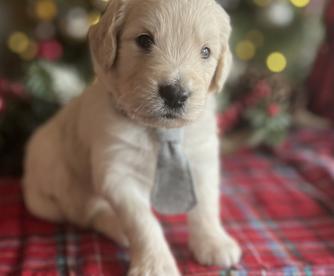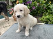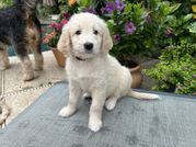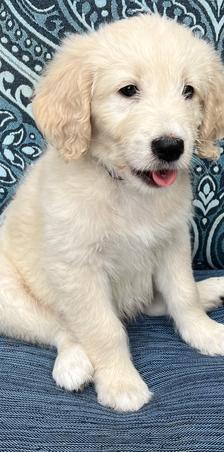 Denver is the sweetest most laid back puppy ever! He is a standard F1 English Goldendoodle. He will weigh 60-70 lbs and have a beautiful wavy/curly coat. Perfect family dog!
