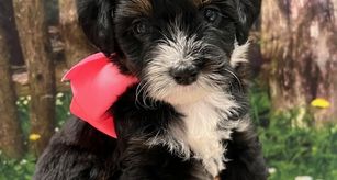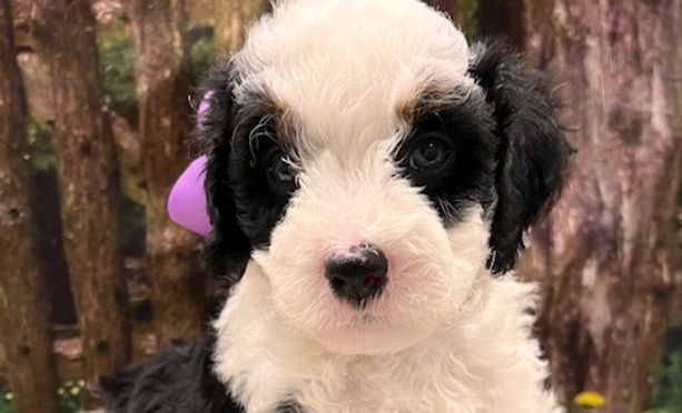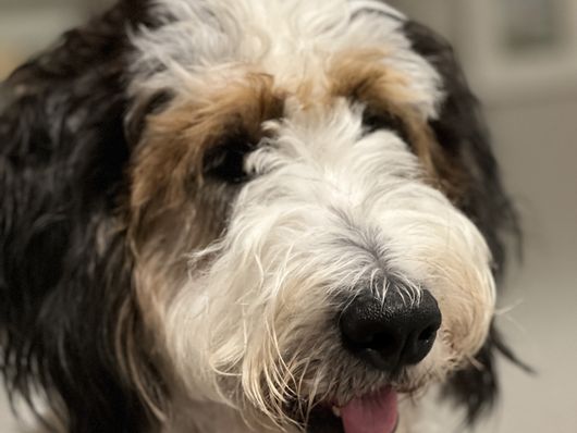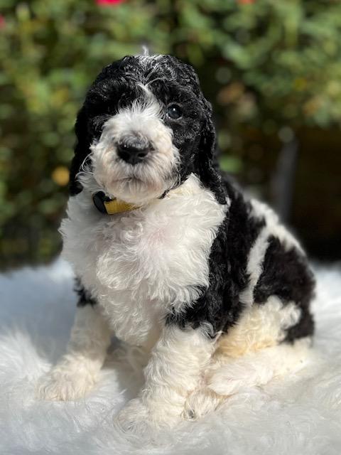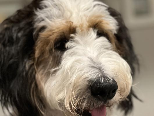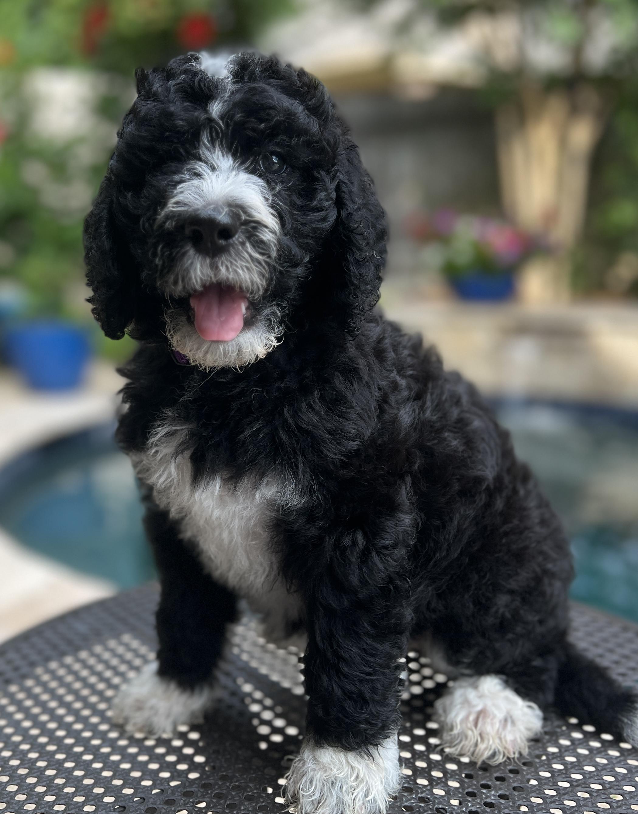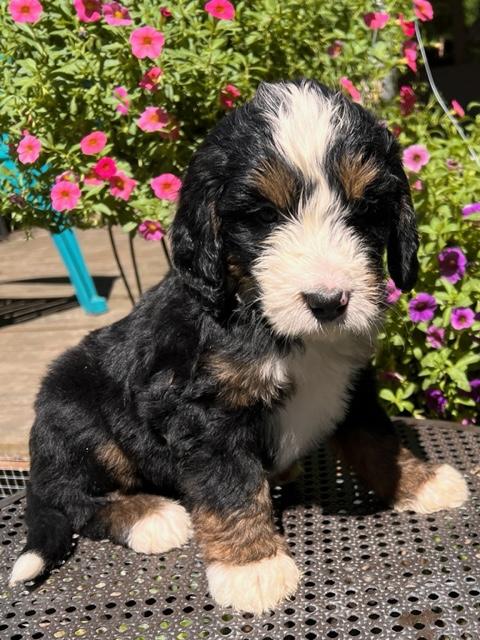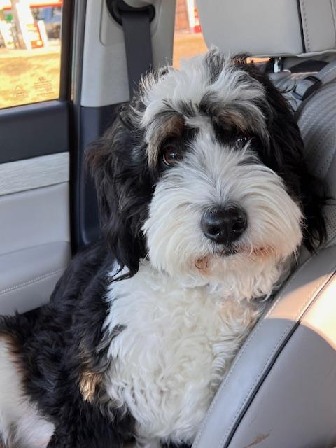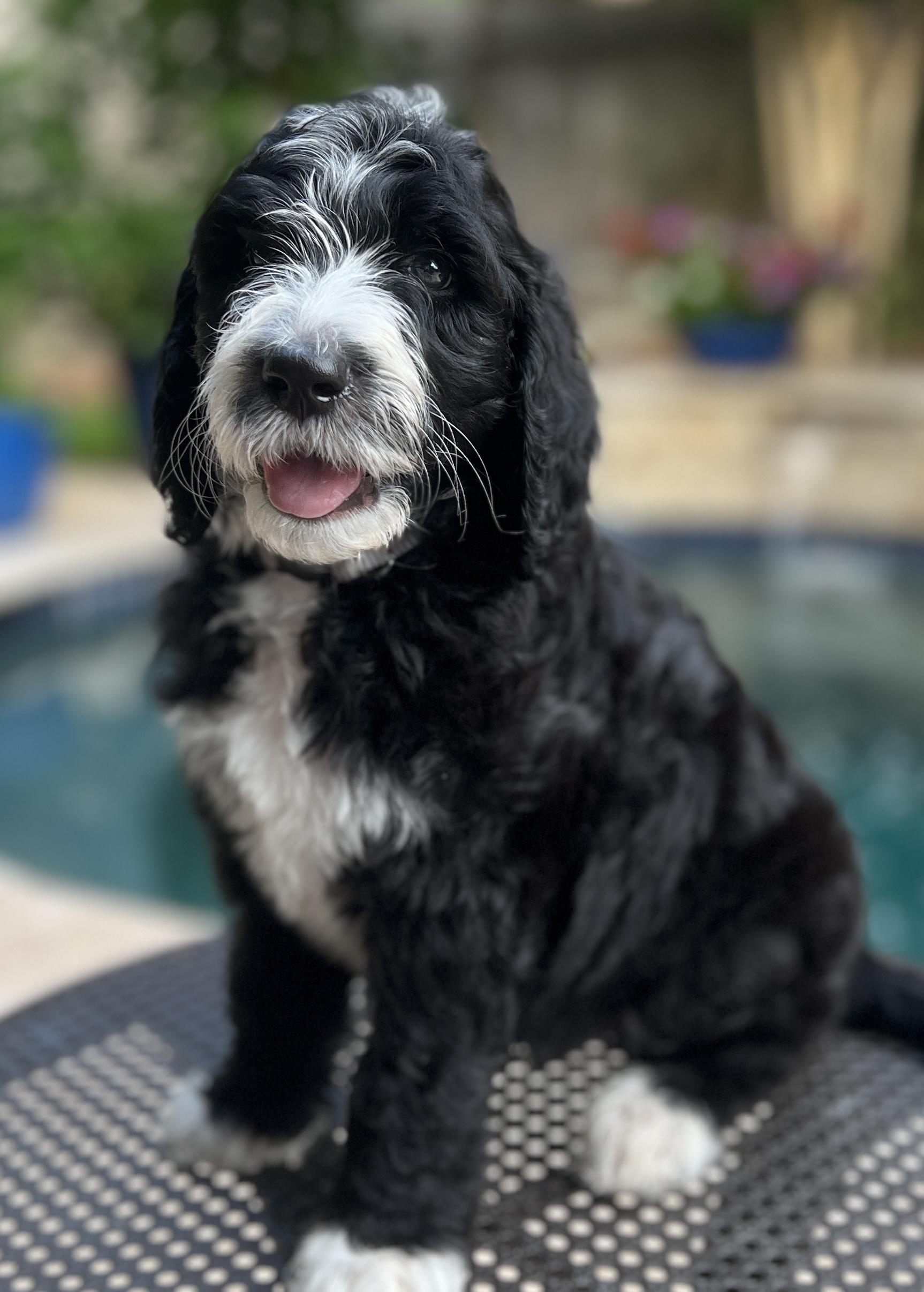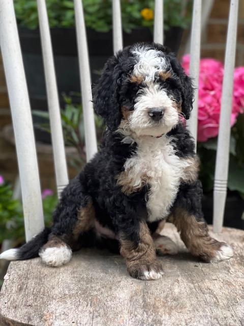 Pebbles is a precious tri-color Mini Bernedoodle. She is the perfect size dog weigh in at 38 lbs, not too big and not too small! She is so much fun and always happy with her tail wagging all the time. She is the light of my daughter's eye.