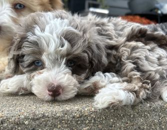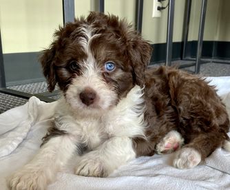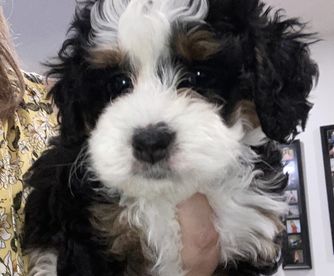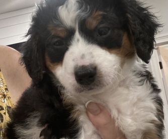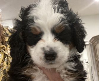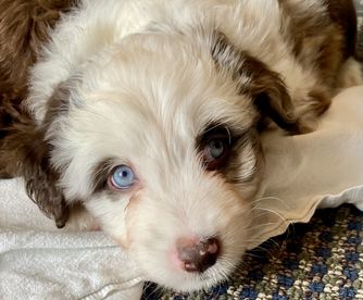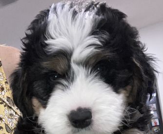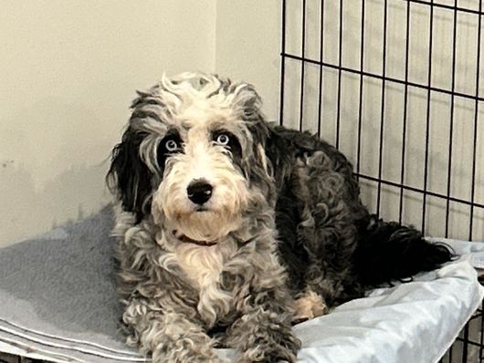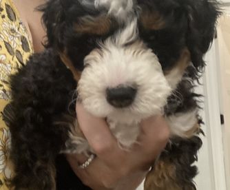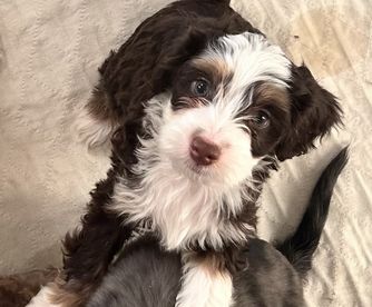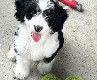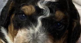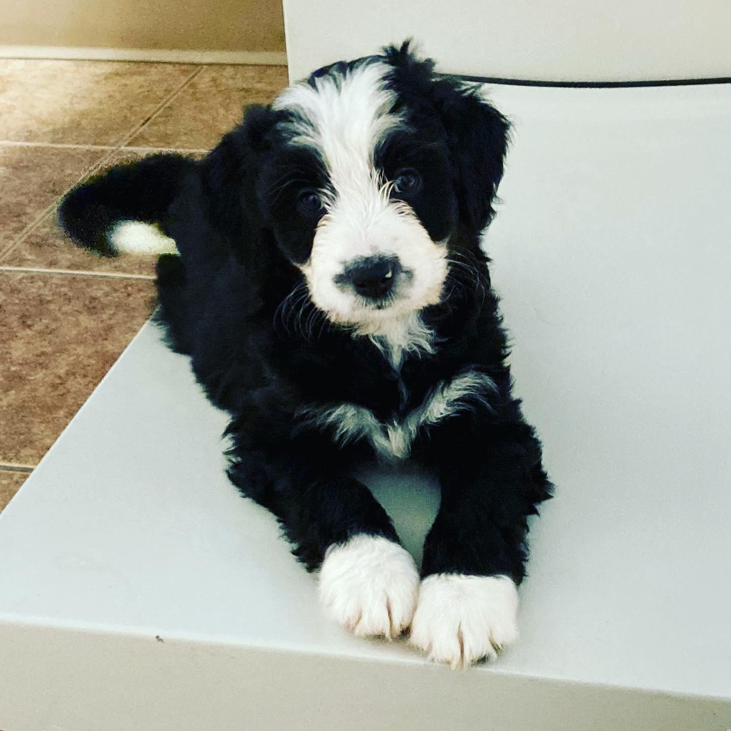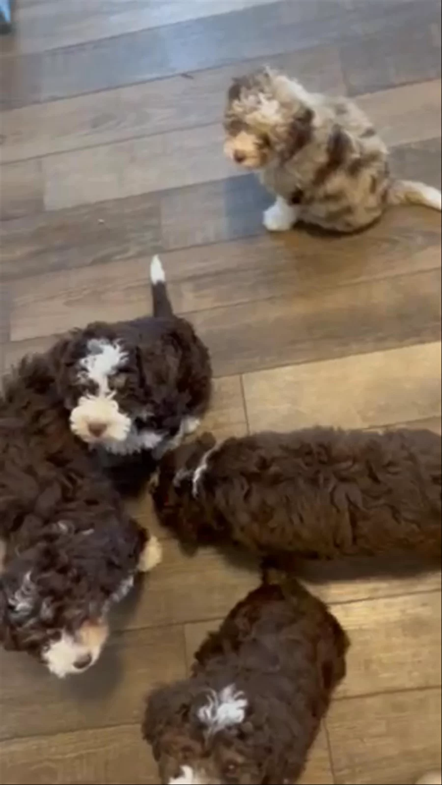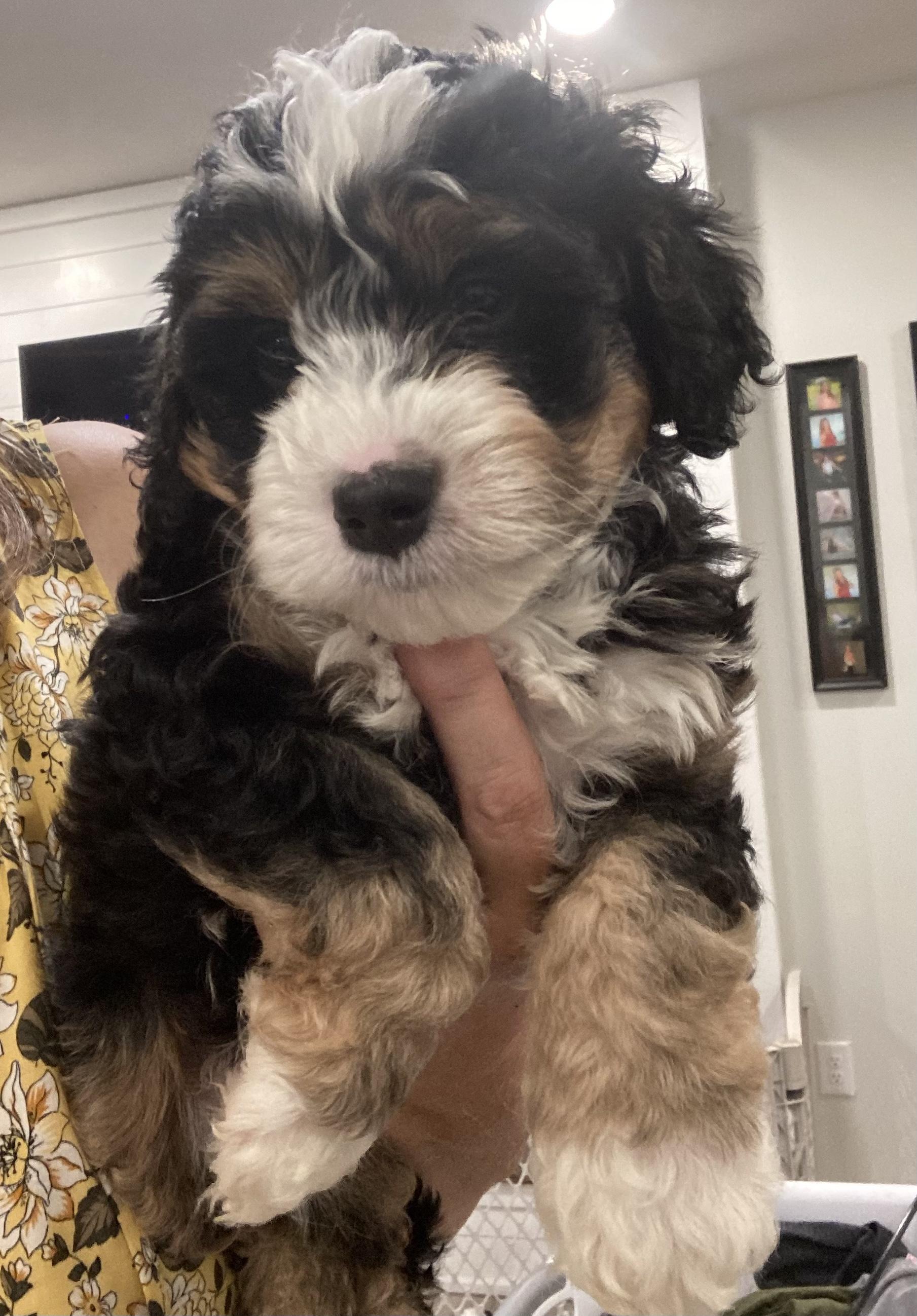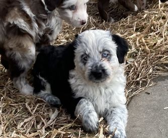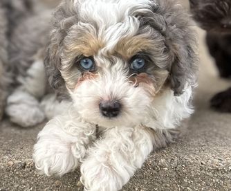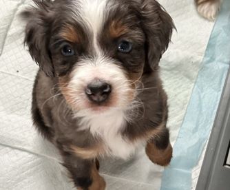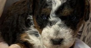 Our Bernedoodle puppies include sable, tri-color, and phantom. Aussiedoodle puppies include blue merle, red merle, black and white, black tri-color, and red tri-color. Colors will vary depending on the parent dogs.
