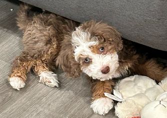 Mia is a female Aussiedoodle. Carefully selected as a great representative of her breed, Gretchen decided to make her part of their program. Gretchen has passed Good Dog’s screening process, which involved a review of their breeding practices, environment, and the mental and physical health of their dogs.