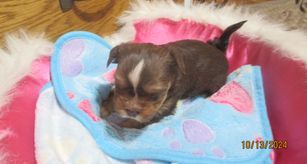Gizmo is a AKC Chocolate Parti Yorkie that has gorgeous long silky hair. He loves his toys and always carries one with him everywhere he goes. He loves to try to sneak his inside toys outside. He has a very mellow temperament and loves to play with his yorkie friends and us humans too.