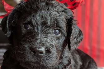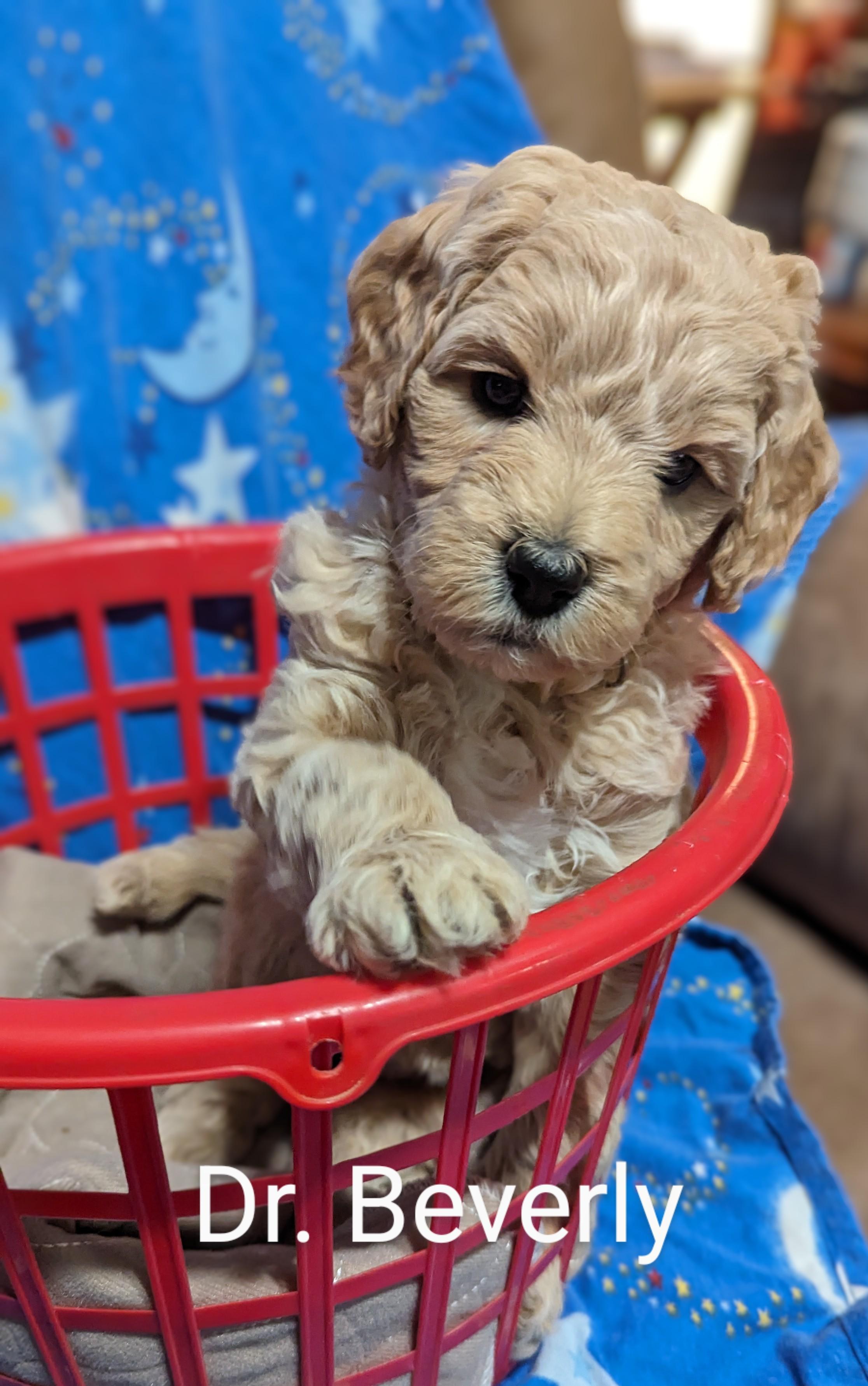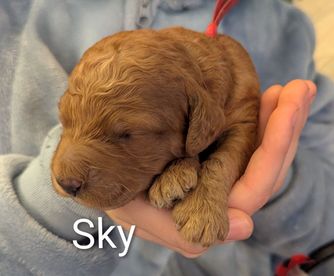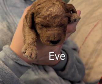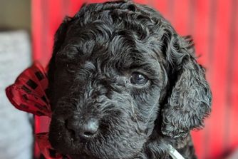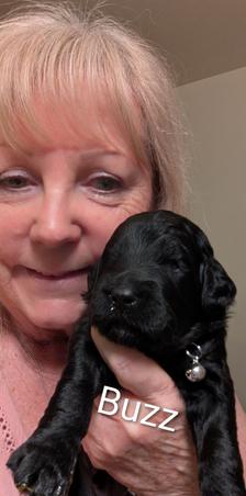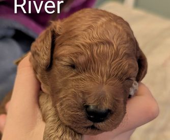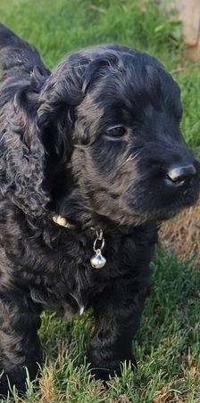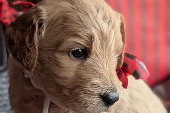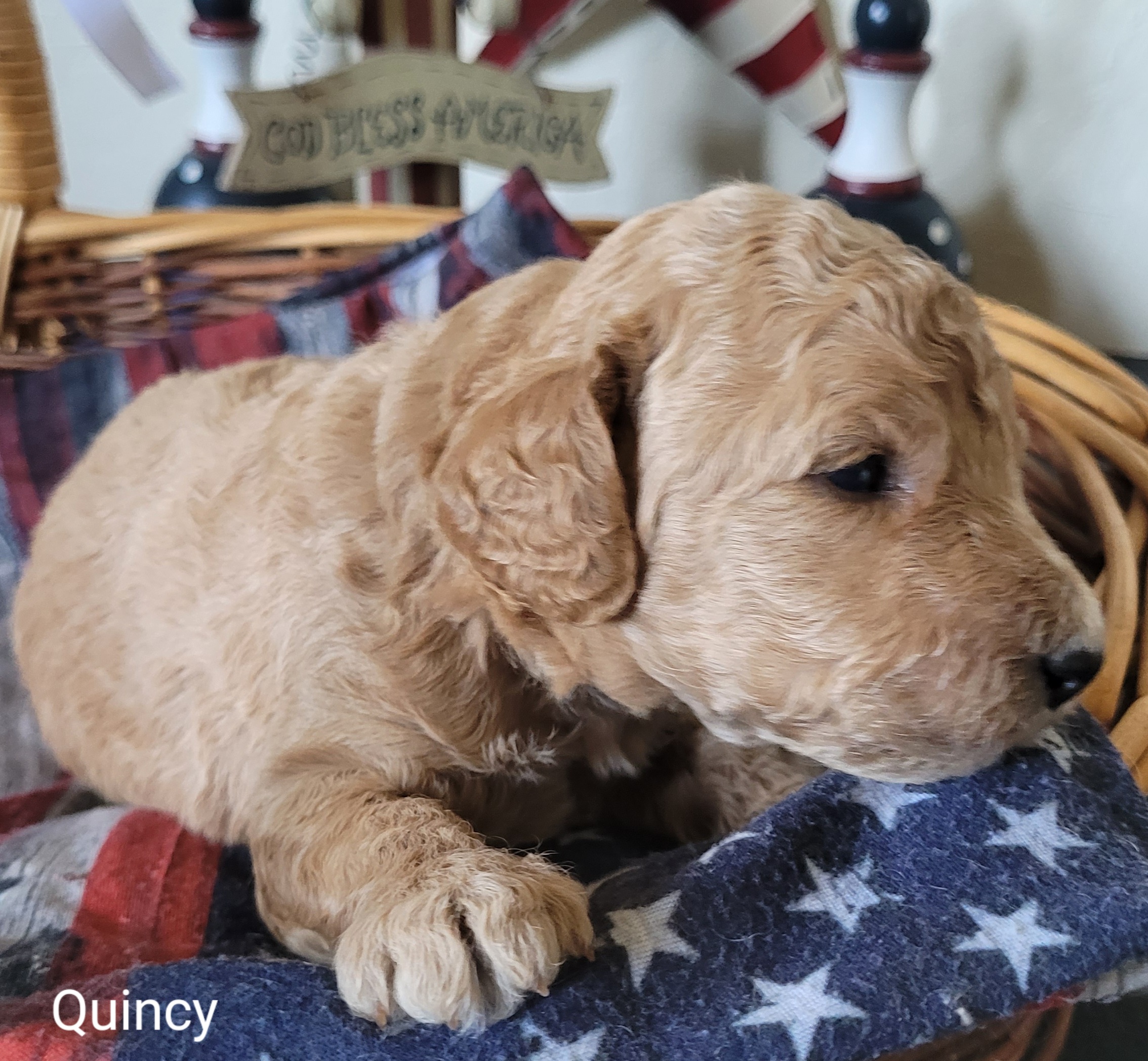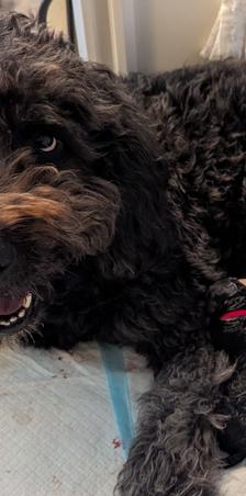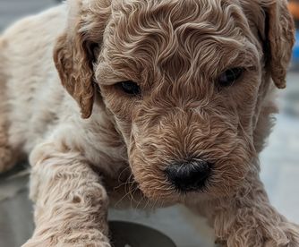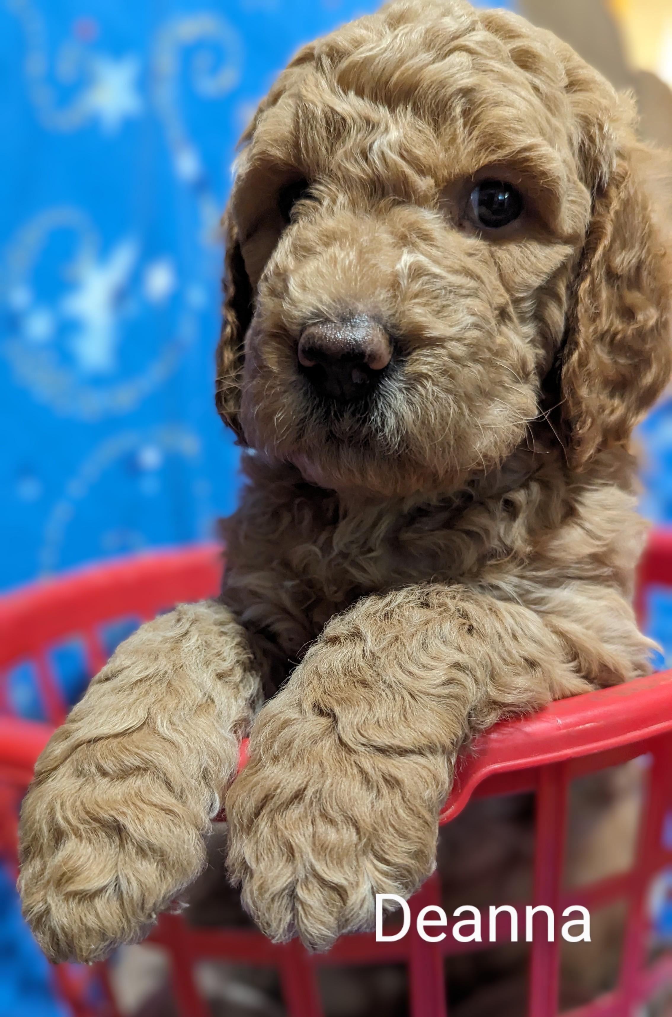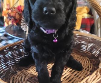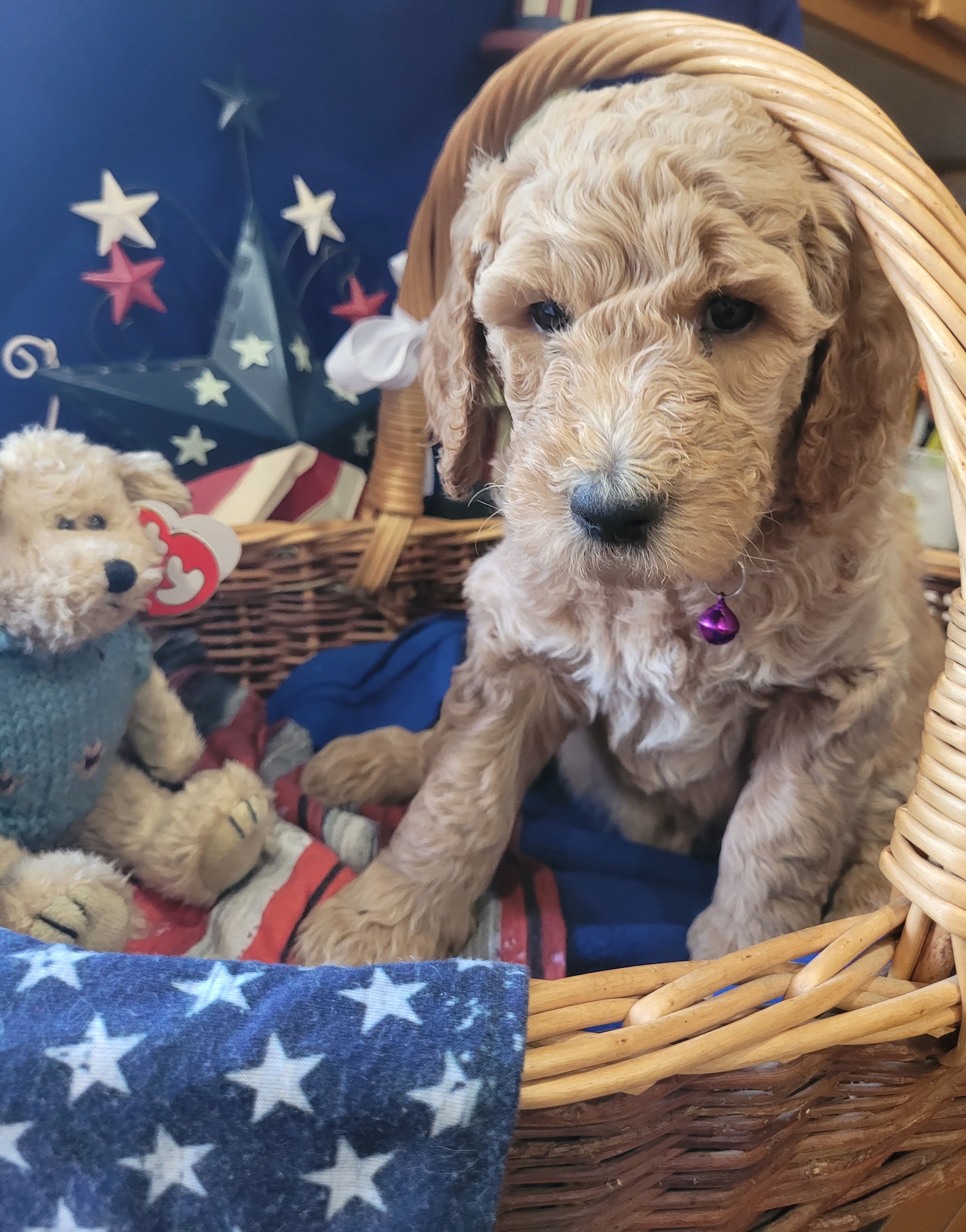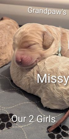 Lizzie is a "Blue" F1 Goldendoodle. Her hair is soft and wavy. She is a wonderful mama! She is so loving and loves playing with her sister Sadie. She thinks she is a lap dog and loves being right with one of us.