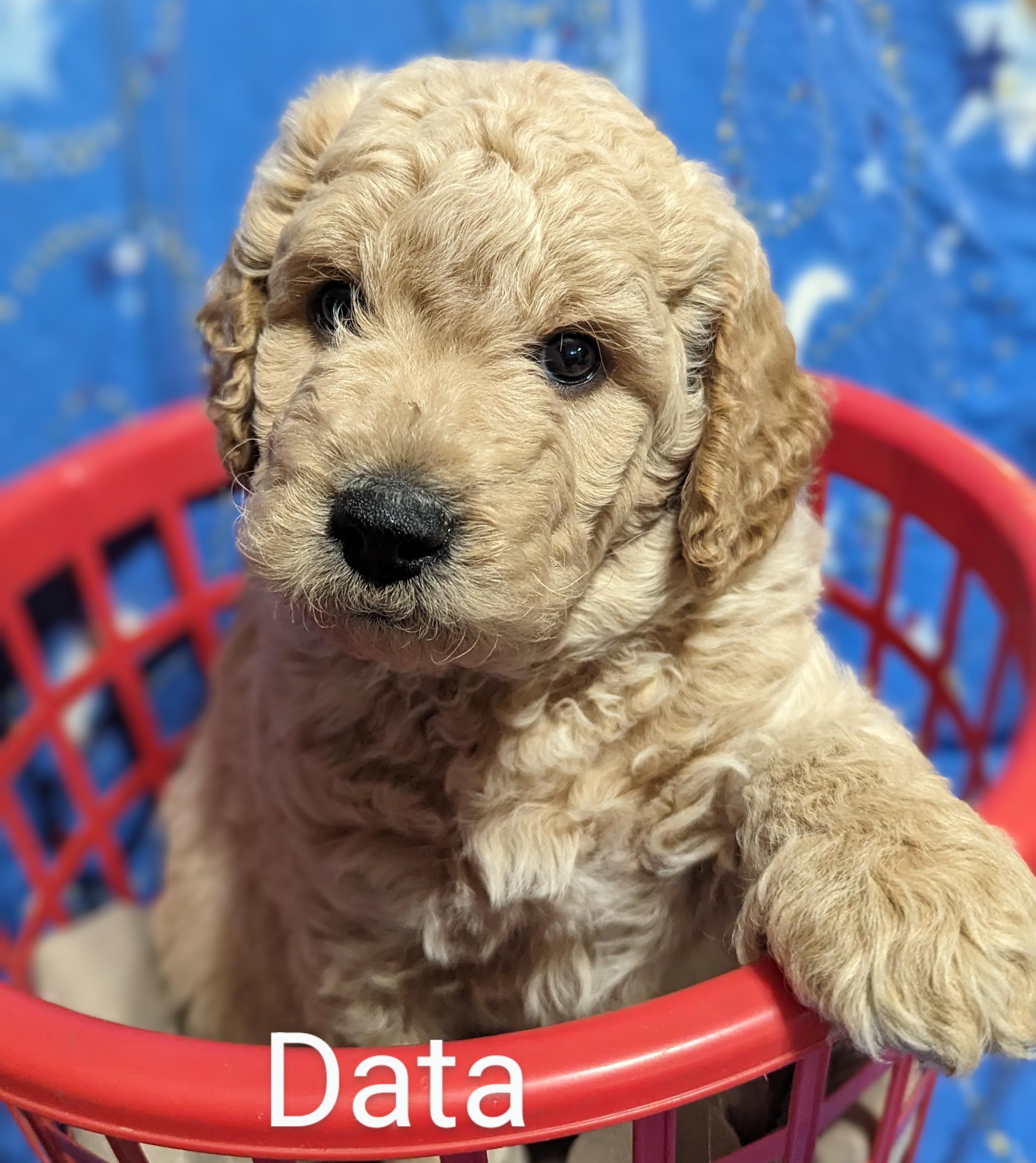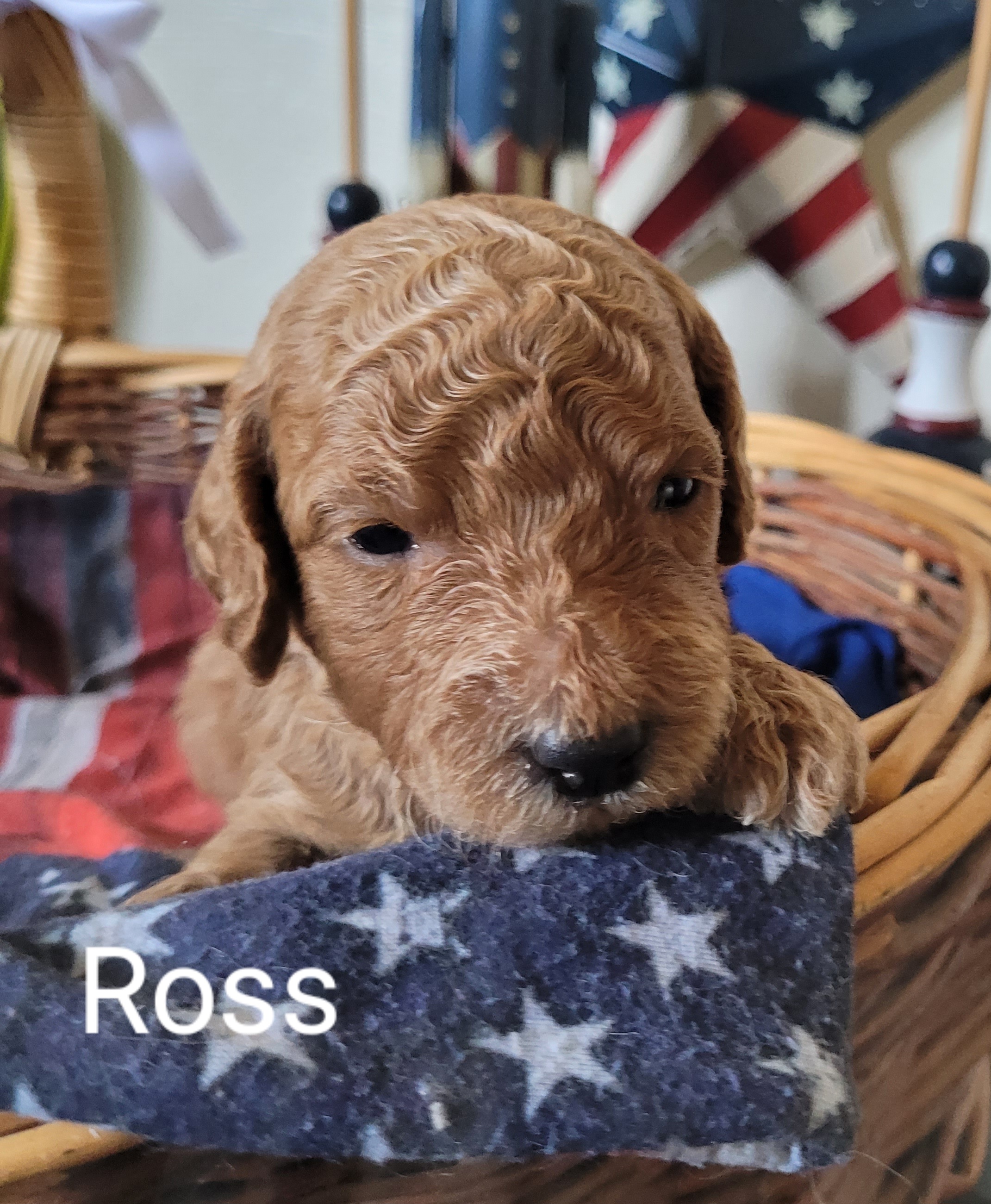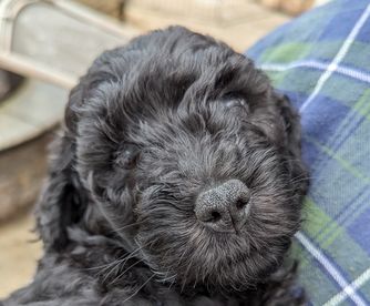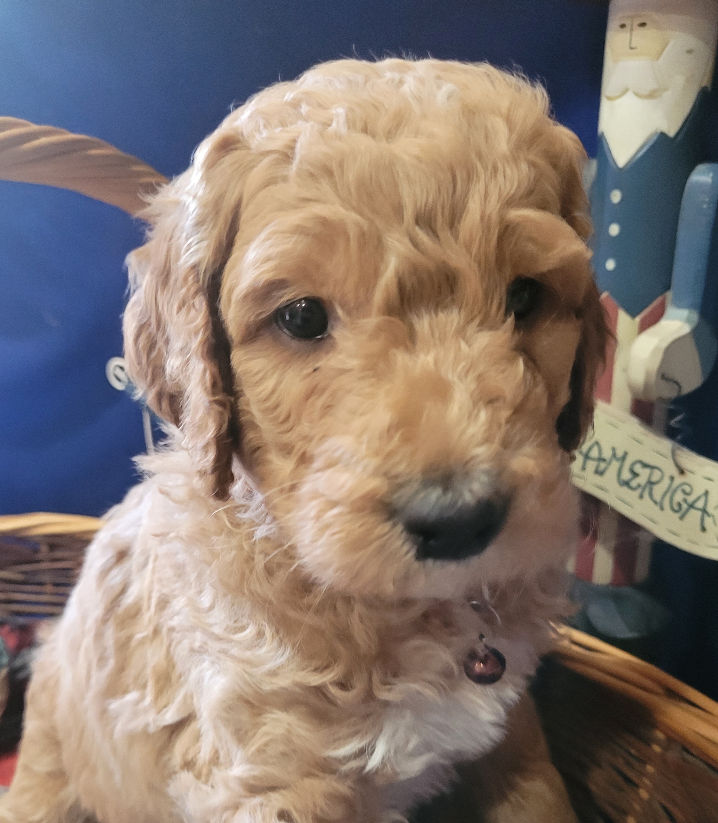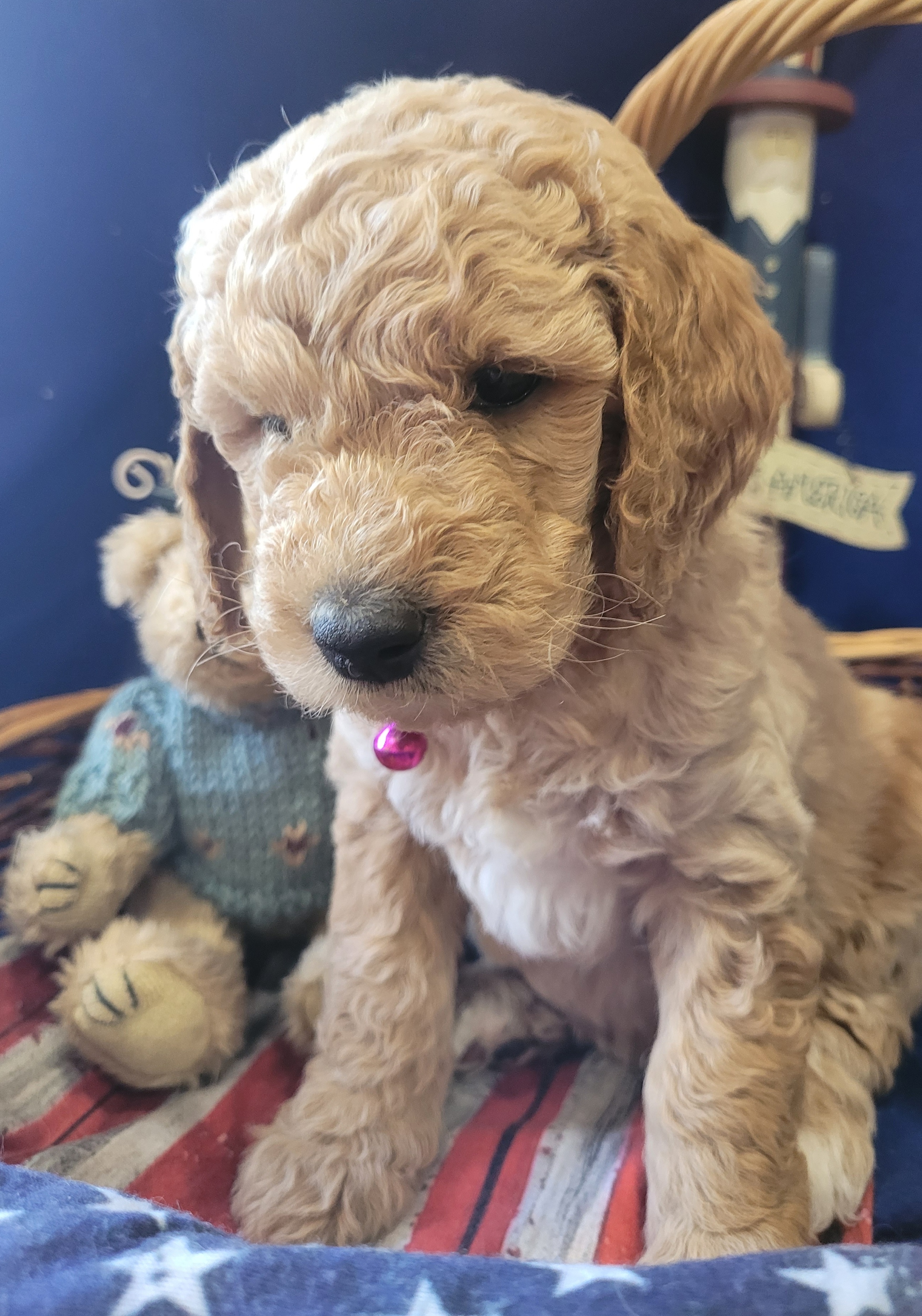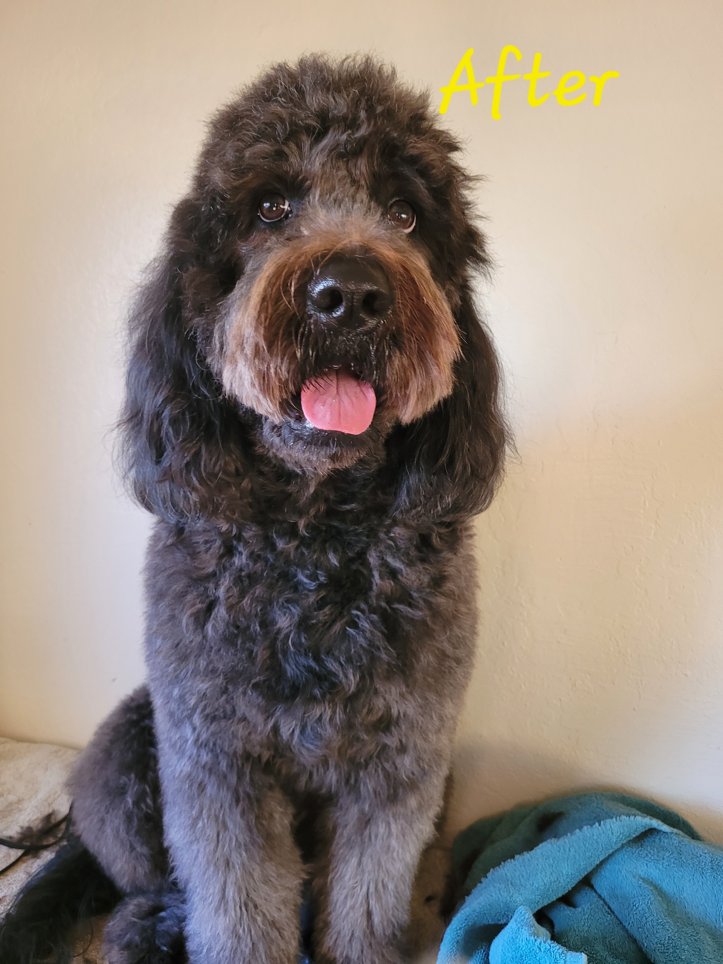 Lizzie is a "Blue" F1 Goldendoodle. Her hair is soft and wavy. She is a wonderful mama! She is so loving and loves playing with her sister Sadie. She thinks she is a lap dog and loves being right with one of us.
