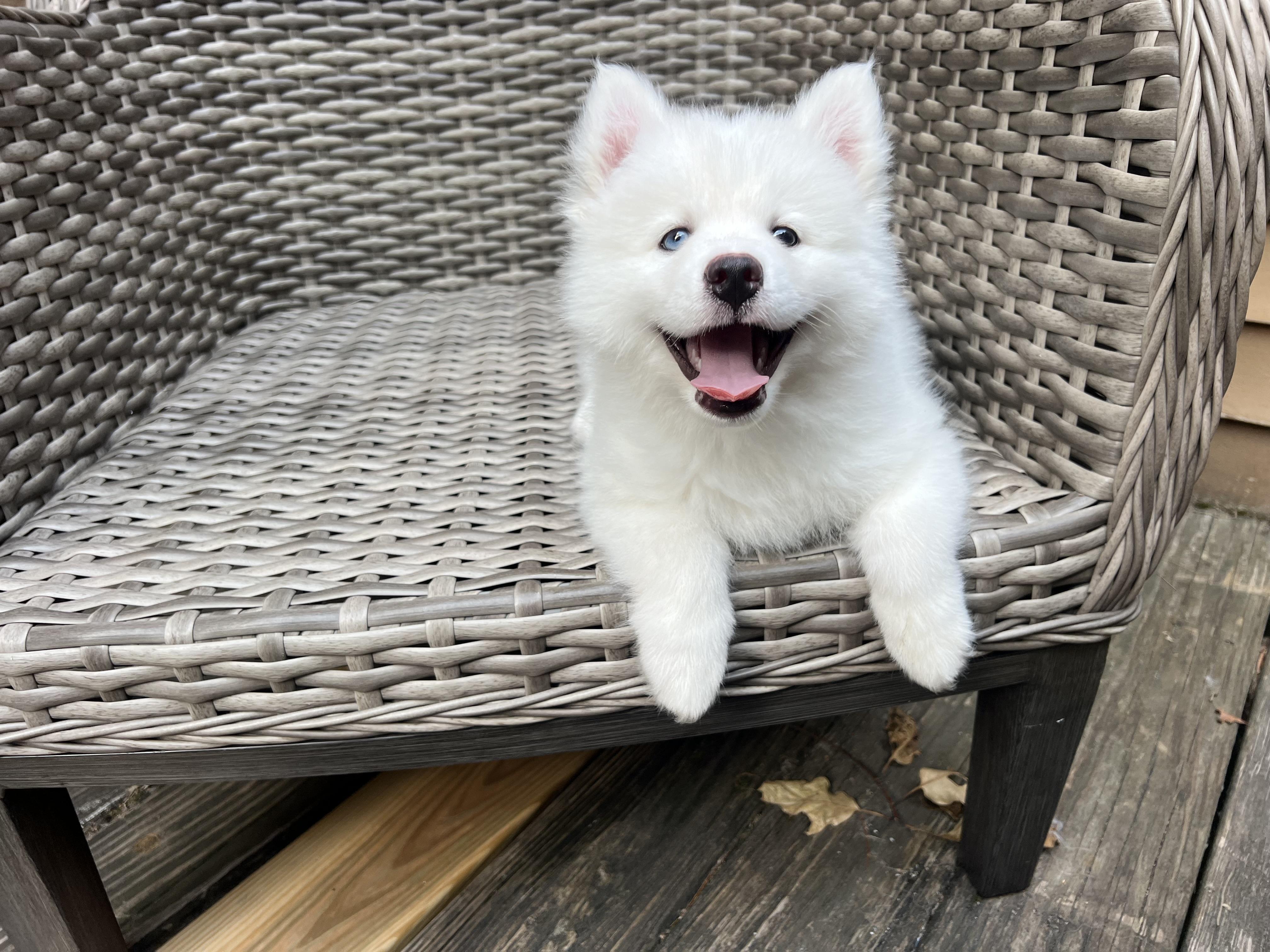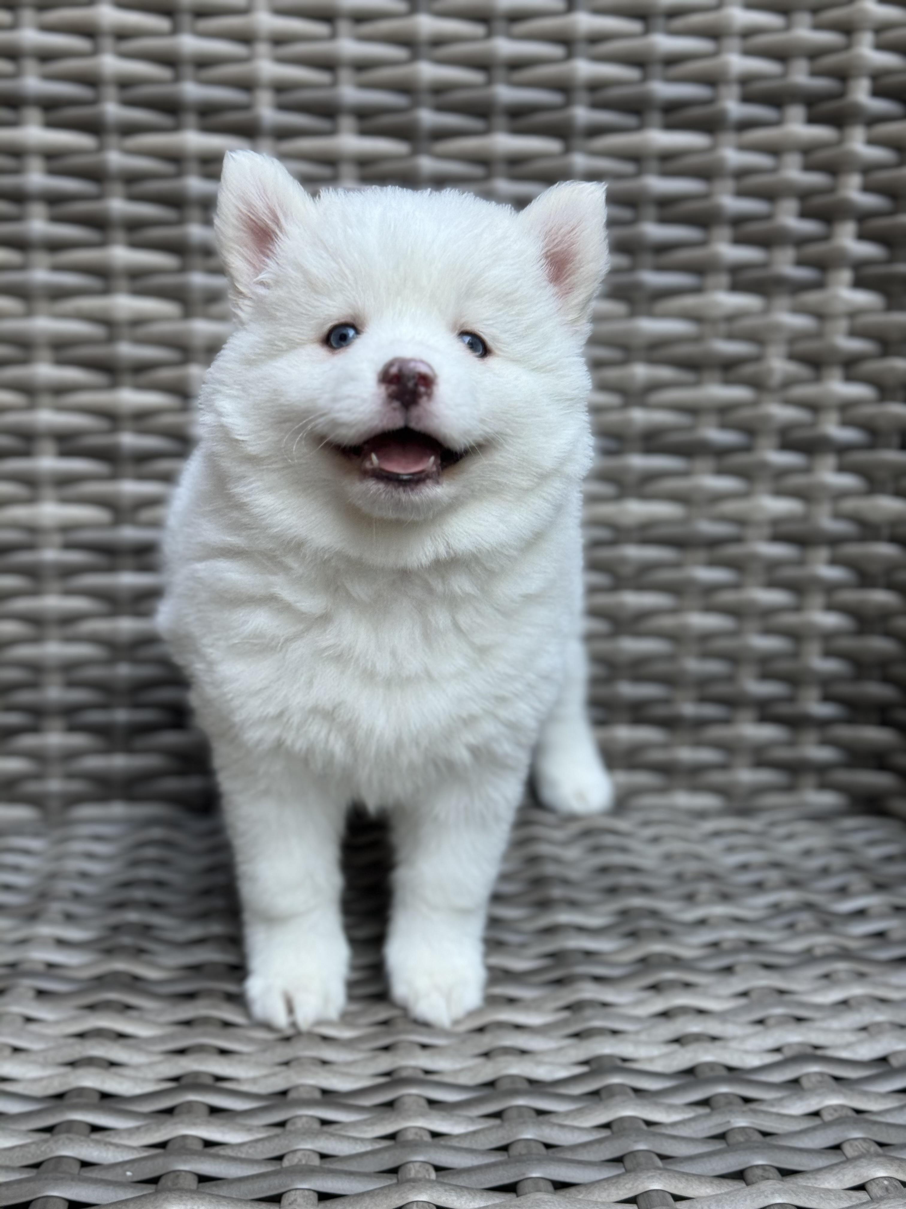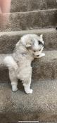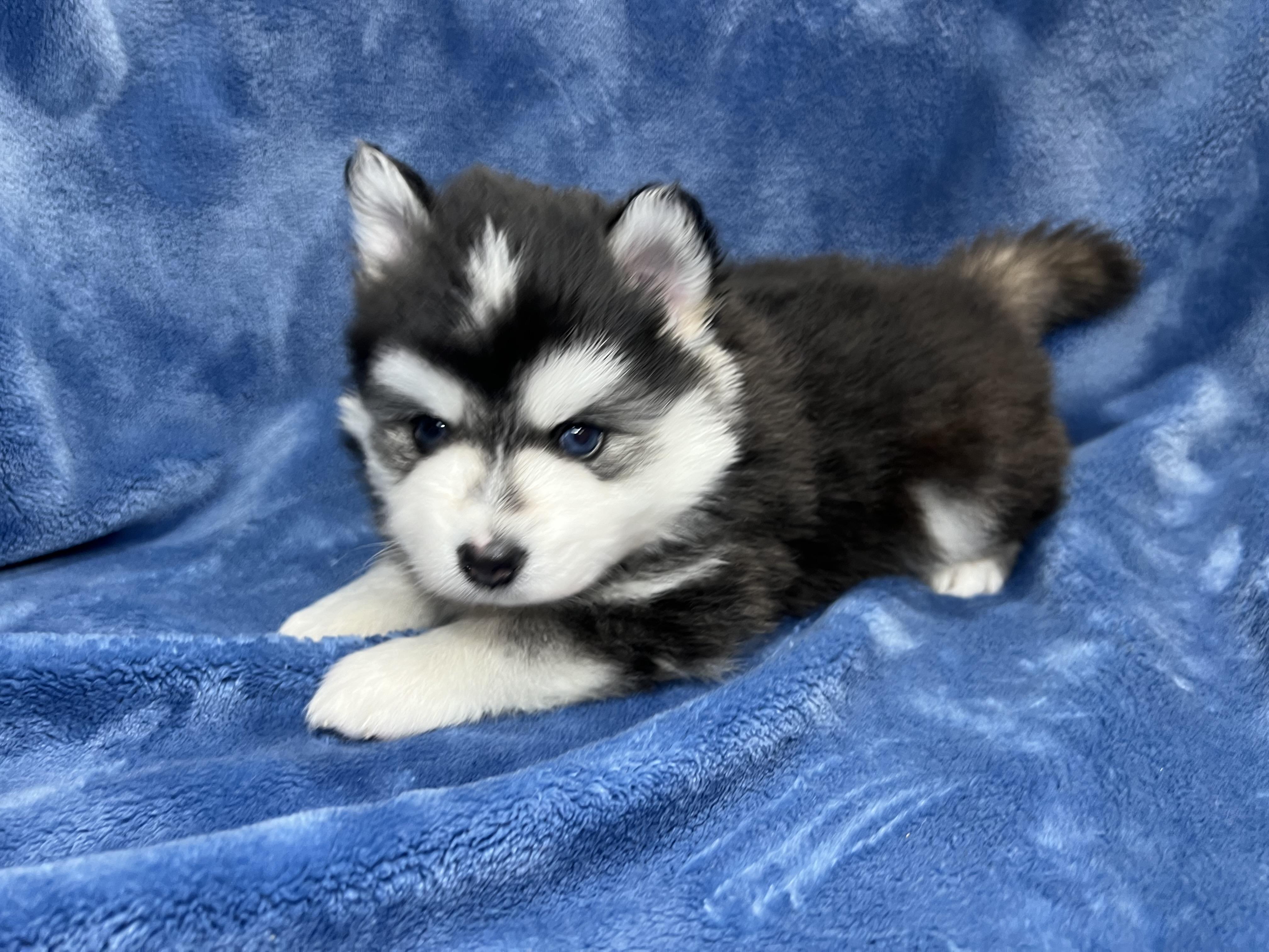 Bella shows the smaller Pomeranian side of Pomskies. We call her our Princess with an attitude. She struts around with that gorgeous fluffy tail and behind like she is queen of the house. She absolutely lives for and expects belly rubs. She loves to play tug of war with her toys. We are all smitten with her and couldn't imagine our family without her.