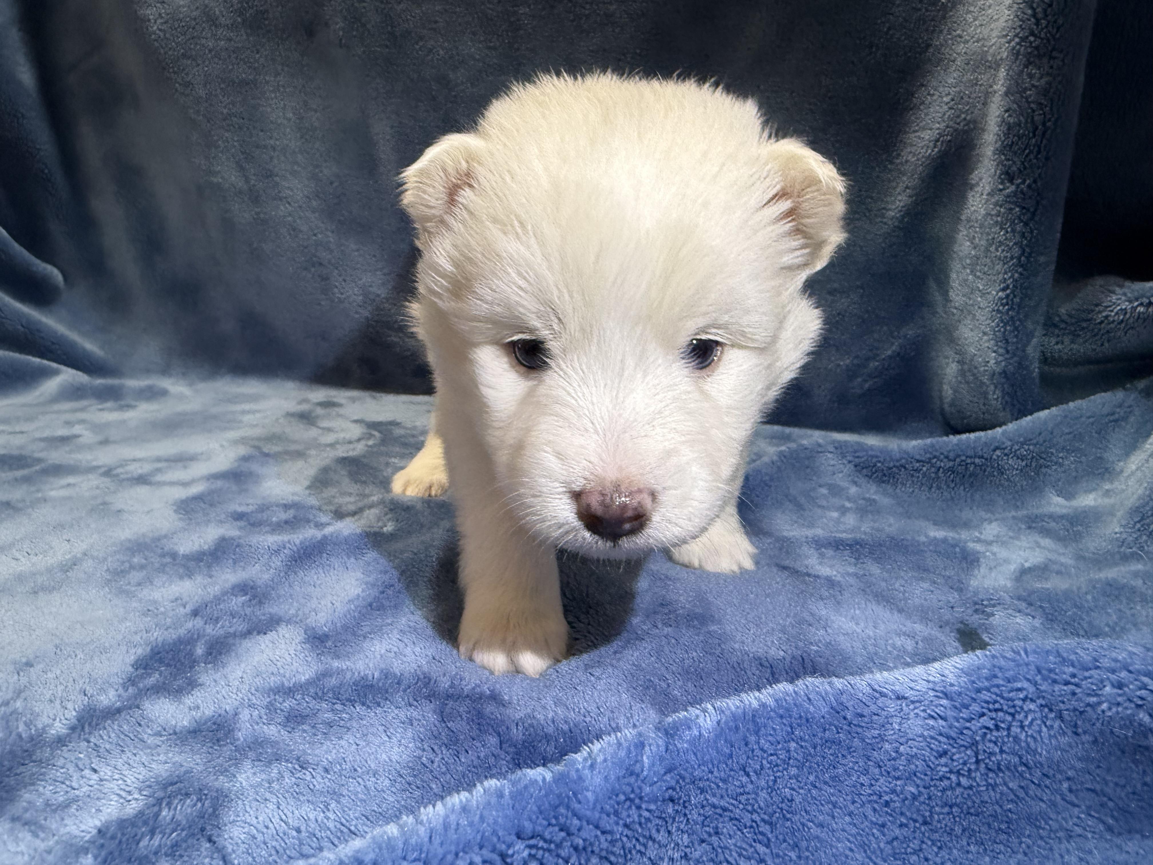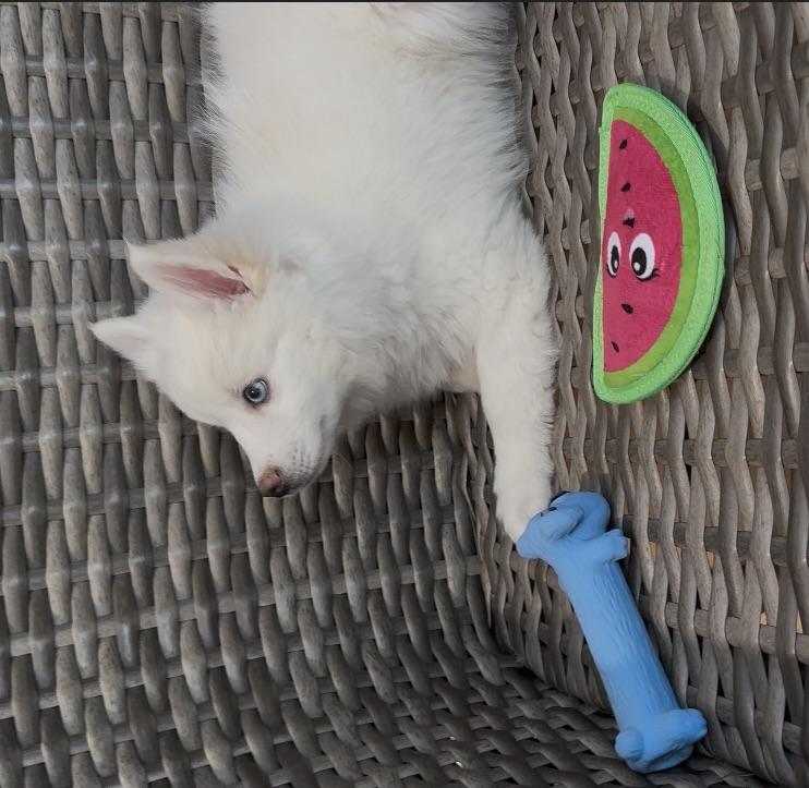 Penny has excellent conformation, and is a wonderful example of the Pomsky breed. She is gentle, loves belly rubs, and enjoys playing with squeaky balls as well as chewing her elk antlers. Penny is a loved, and beloved member of our family.