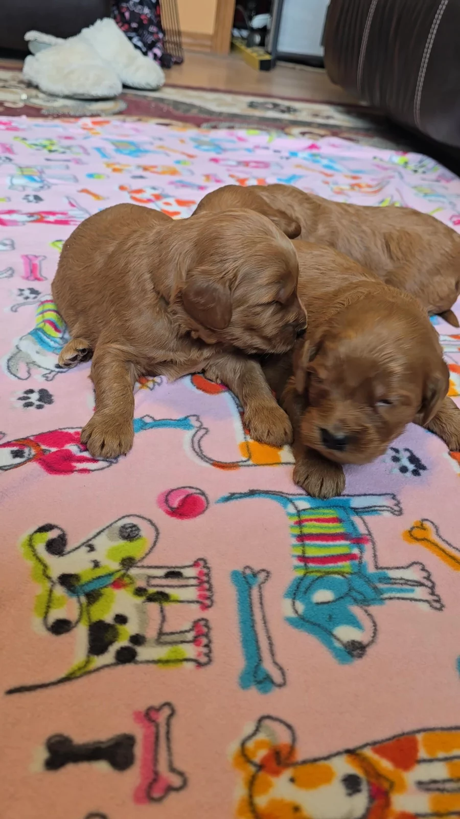 Sally and Rufus' F1 medium/small standard size goldendoodle puppies are 3 weeks old. They are starting to toddle around and have little puppy barks at each other. 😂🐾😍 Just 3 of the boys are waiting for their families to find them. ❤️❤️❤️ The rest have families already loving and waiting for them. ❤️❤️❤️❤️ Goldendoodles org