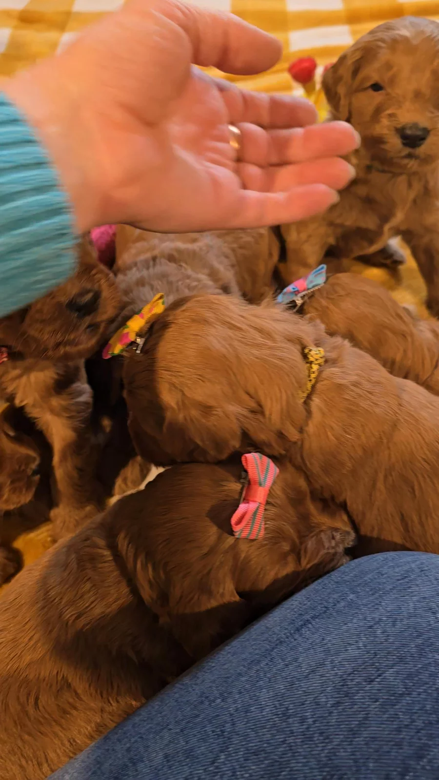 Tallulah's goldendoodle babies are five weeks old. They're getting cuter and more adventurous all the time! Sweet, funny little honeys make us smile! Just a few of the girls are still waiting for their families. The rest all have families loving and waiting for them. 😍 Goldendoodles.org