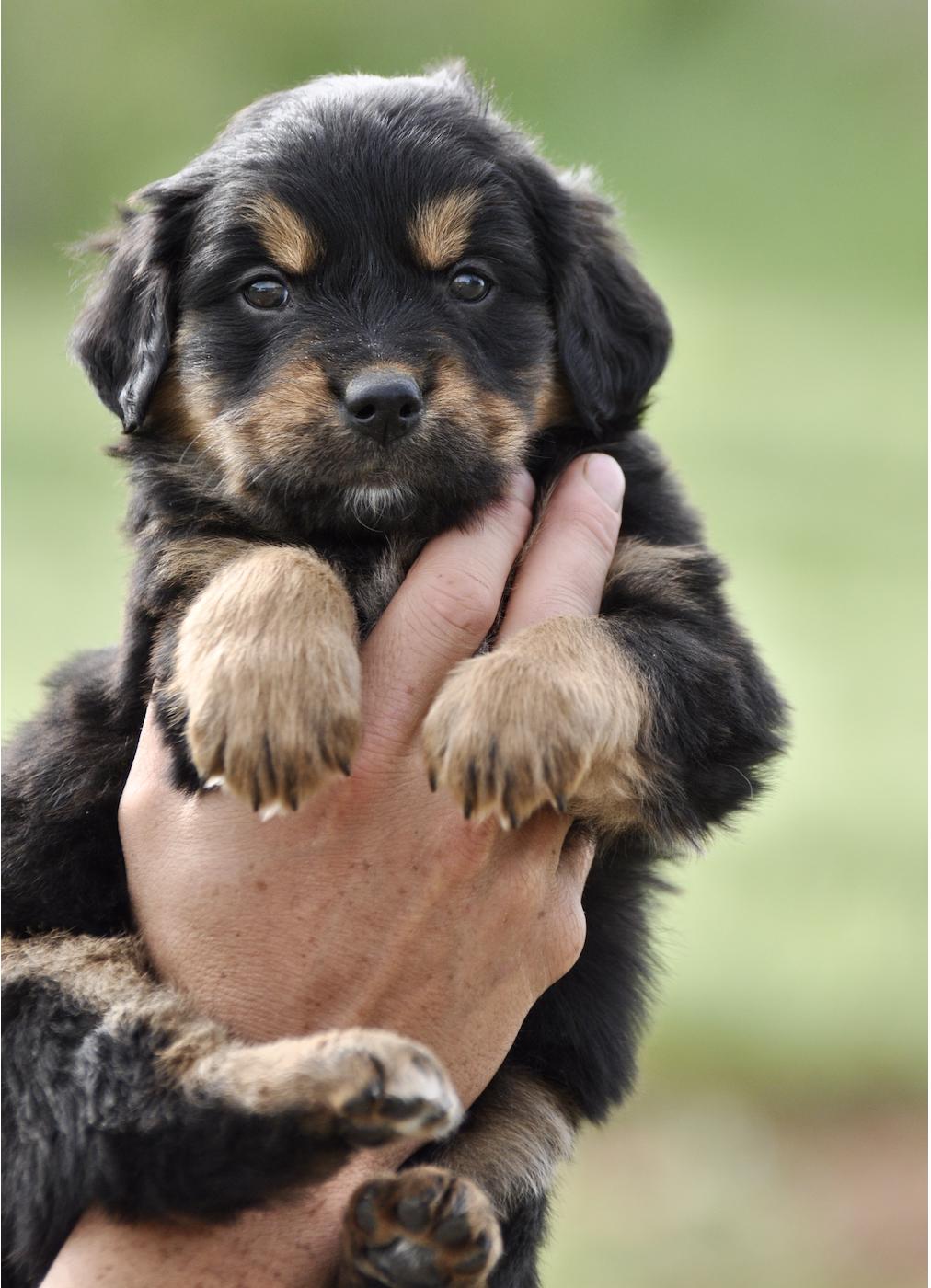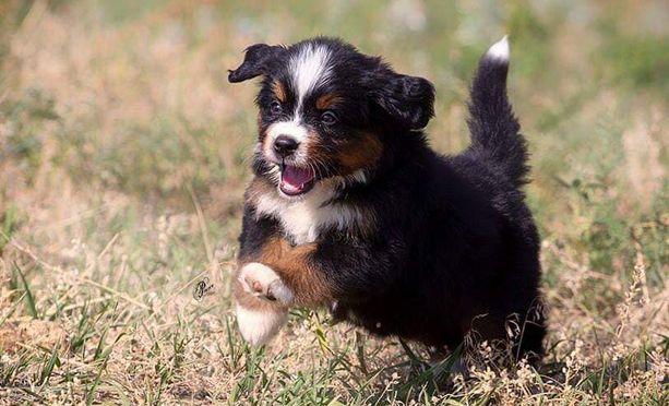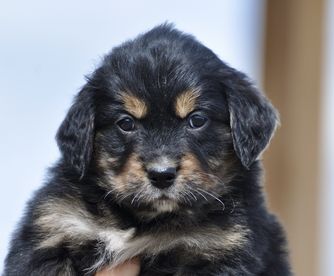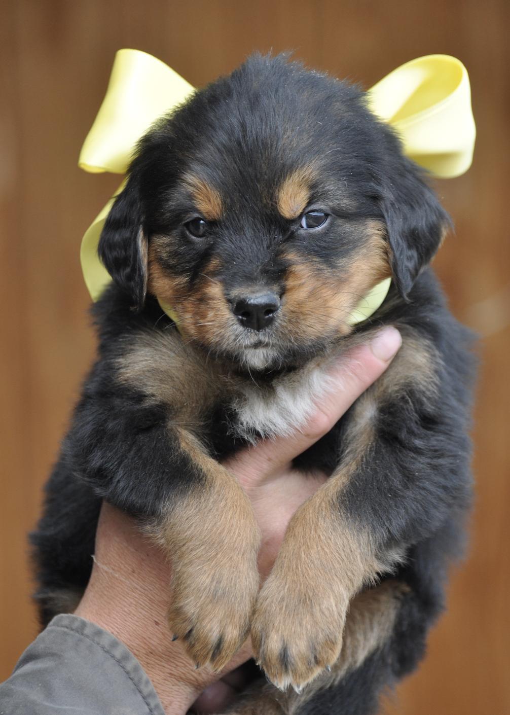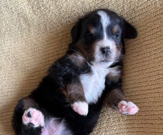 Our Bernese Mountain Dog puppies are tri-color. Golden Retriever puppies are light golden. Colors will vary depending on the parent dogs.