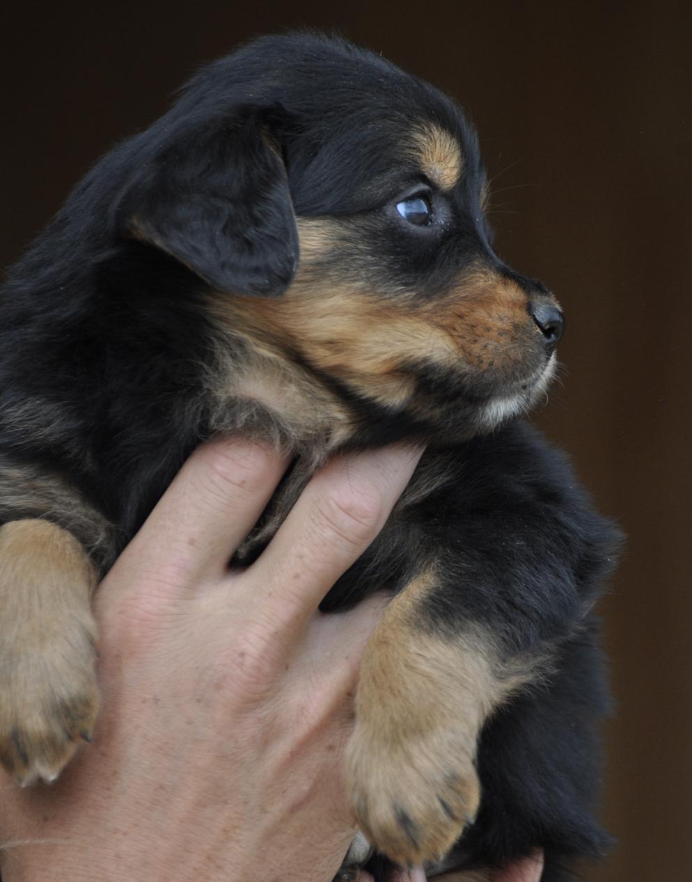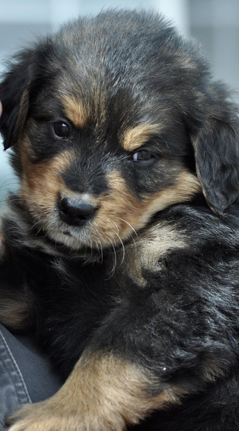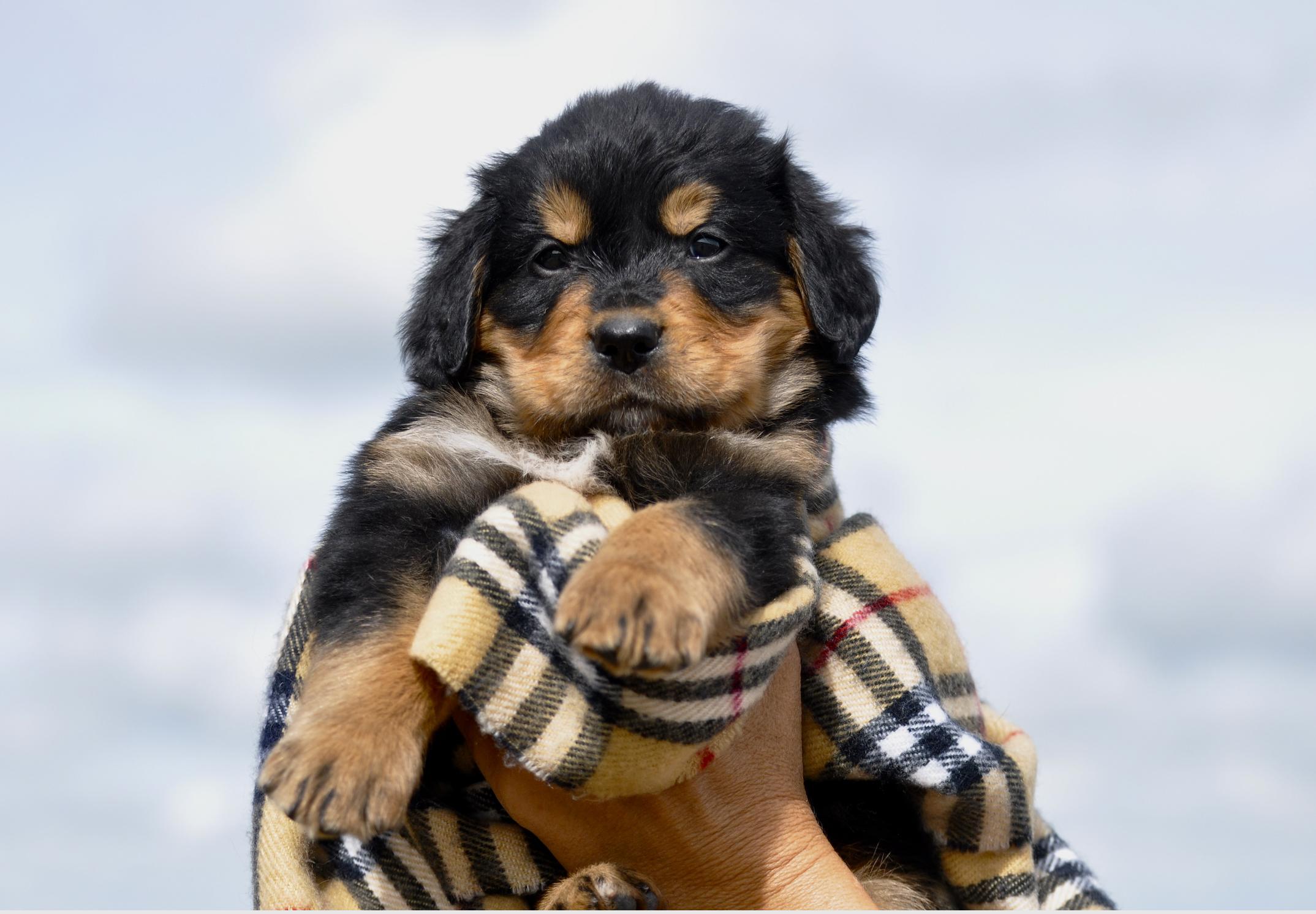 Our Bernese Mountain Dog puppies are tri-color. Golden Retriever puppies are light golden. Colors will vary depending on the parent dogs.