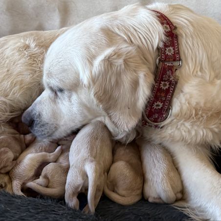 Grateful Bernese & Gage’s Goldens were absolutely wonderful to work with. She’s a beautiful golden mountain dog. You could tell she cared so much about the puppies. Our puppy is happy and healthy and I definitely recommend this breeder! Maggie is getting along with her GSD & Golden sisters