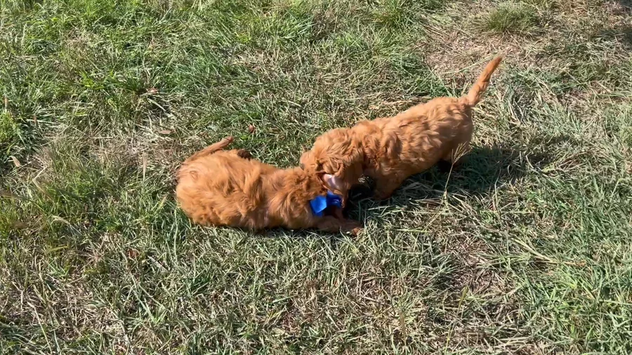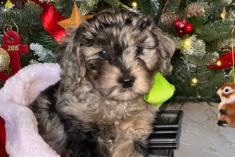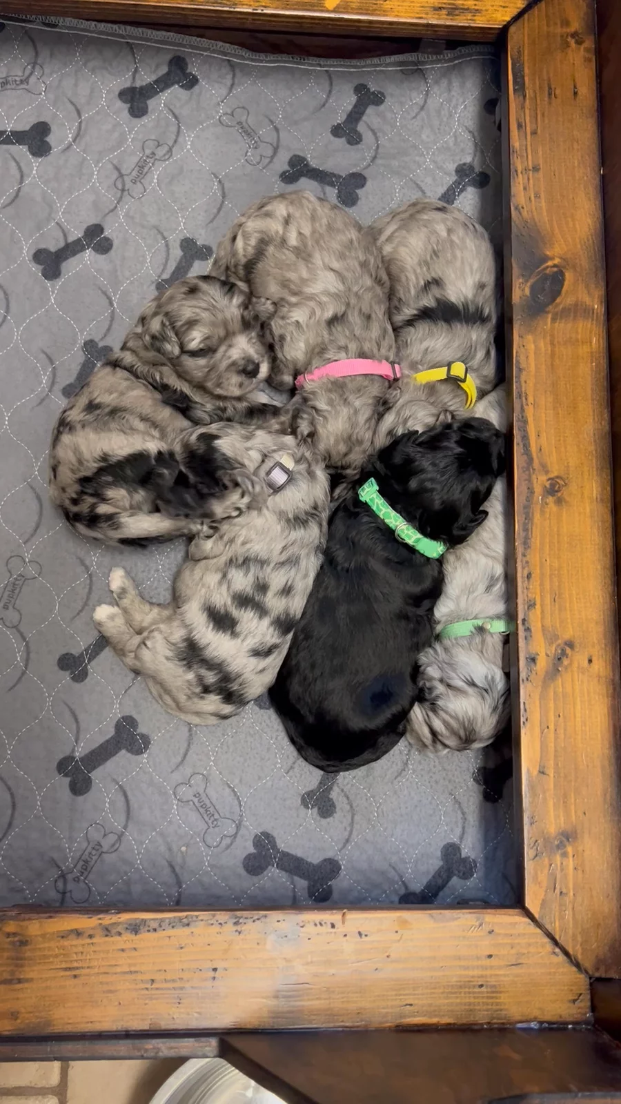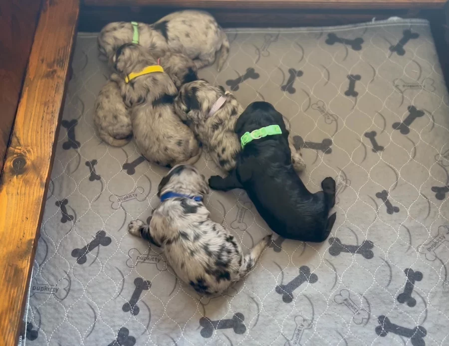 Our Aussiedoodle puppies include blue merle, red merle, and black and white. Goldendoodle puppies include apricot and red. Colors will vary depending on the parent dogs.