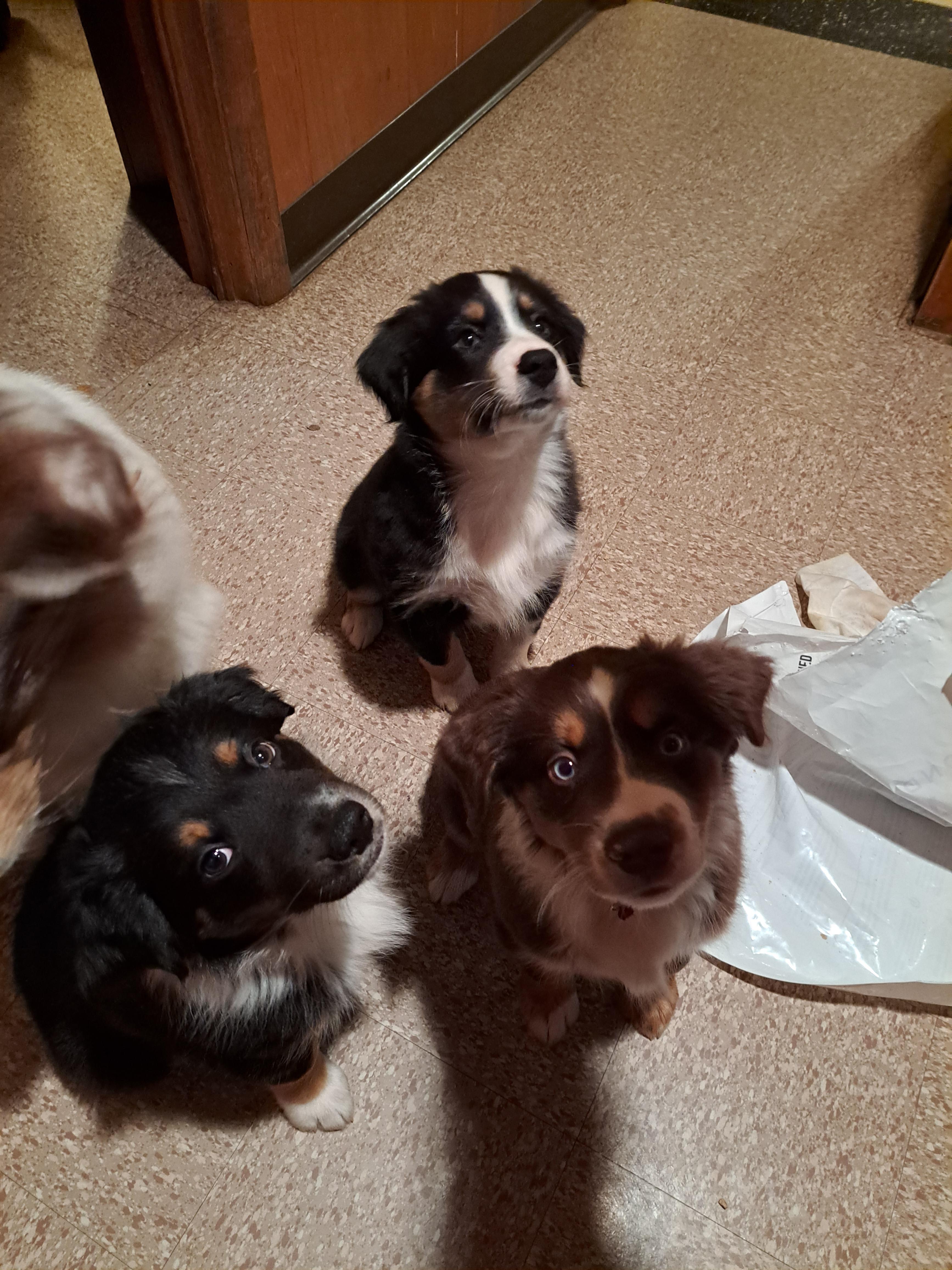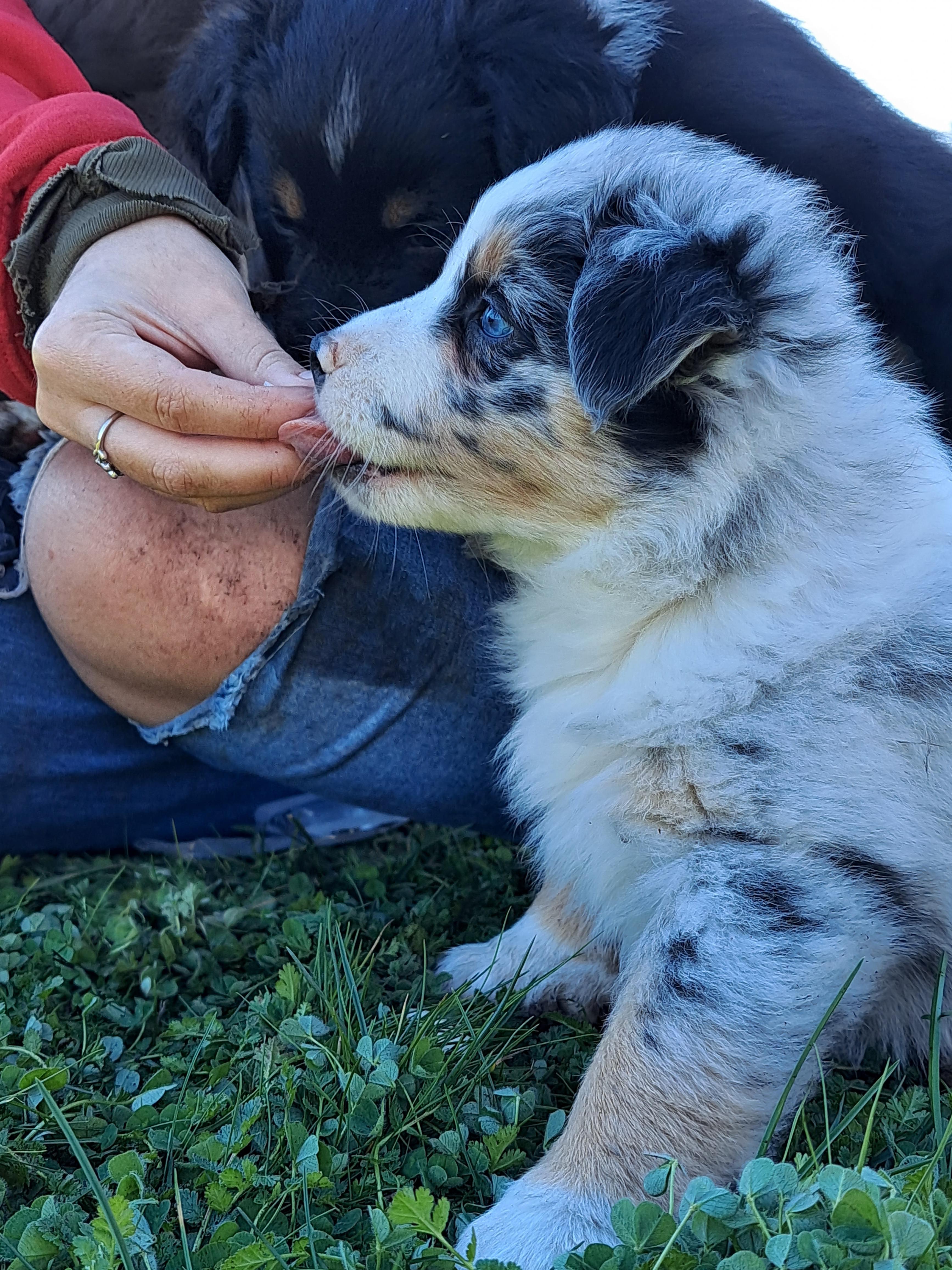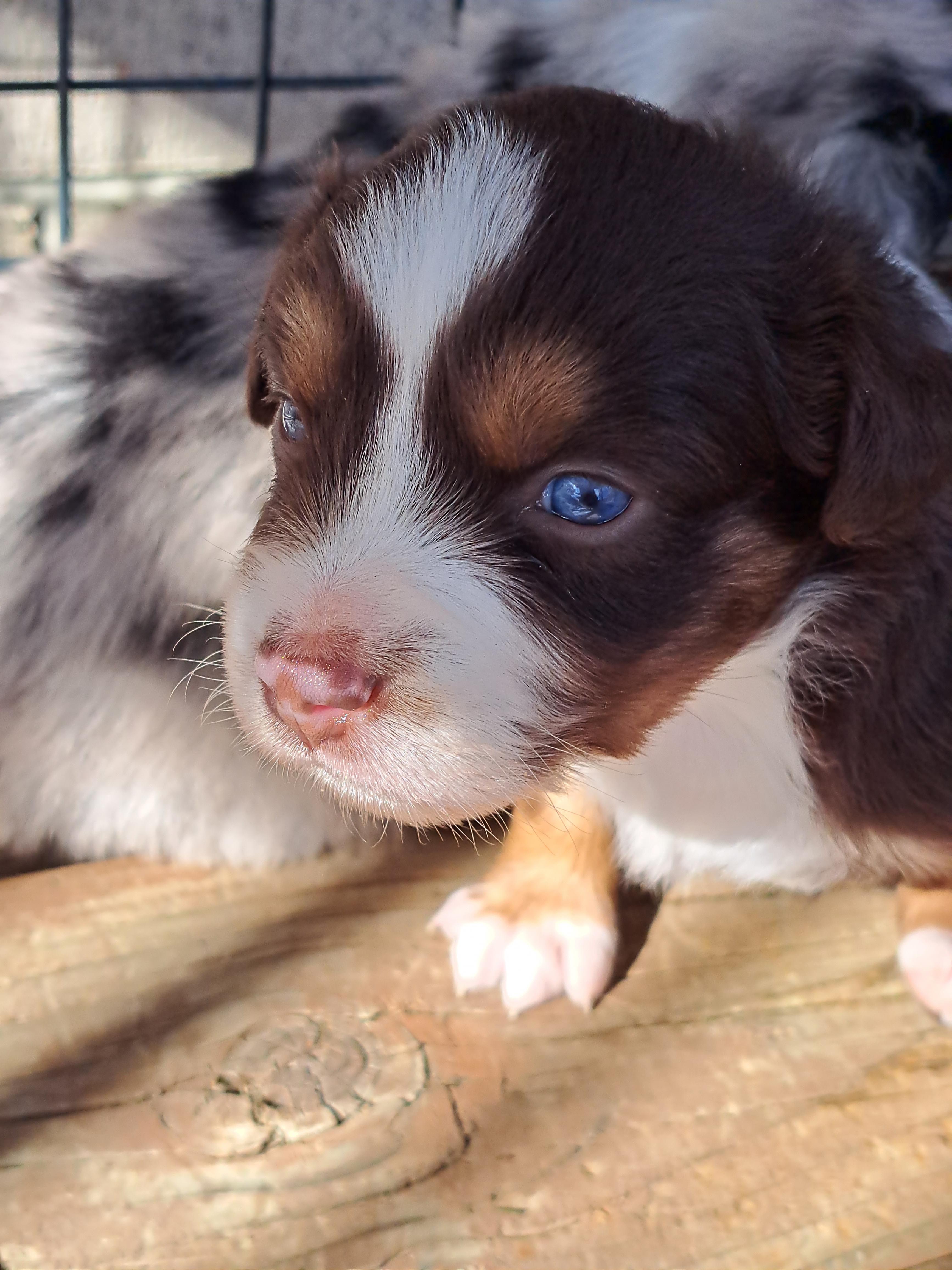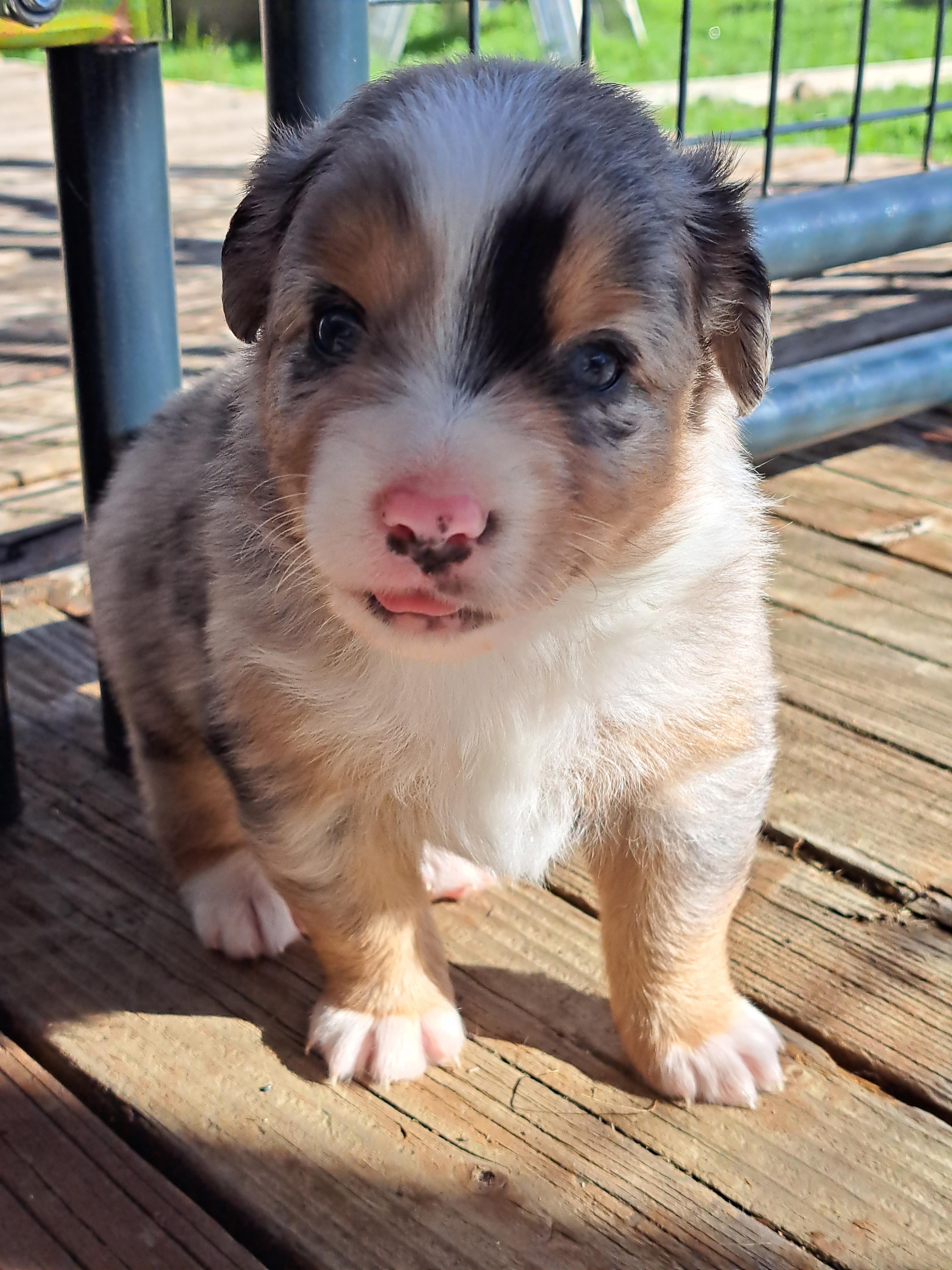 Our Australian Shepherd puppies include red merle and blue merle. Miniature Australian Shepherd puppies are black tri. Colors will vary depending on the parent dogs.