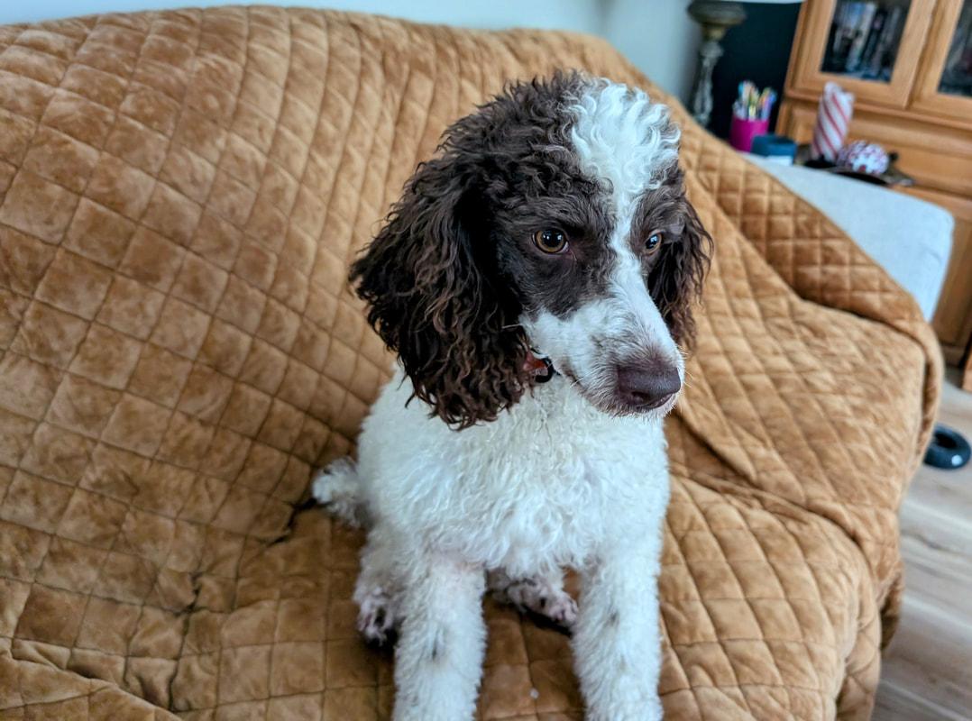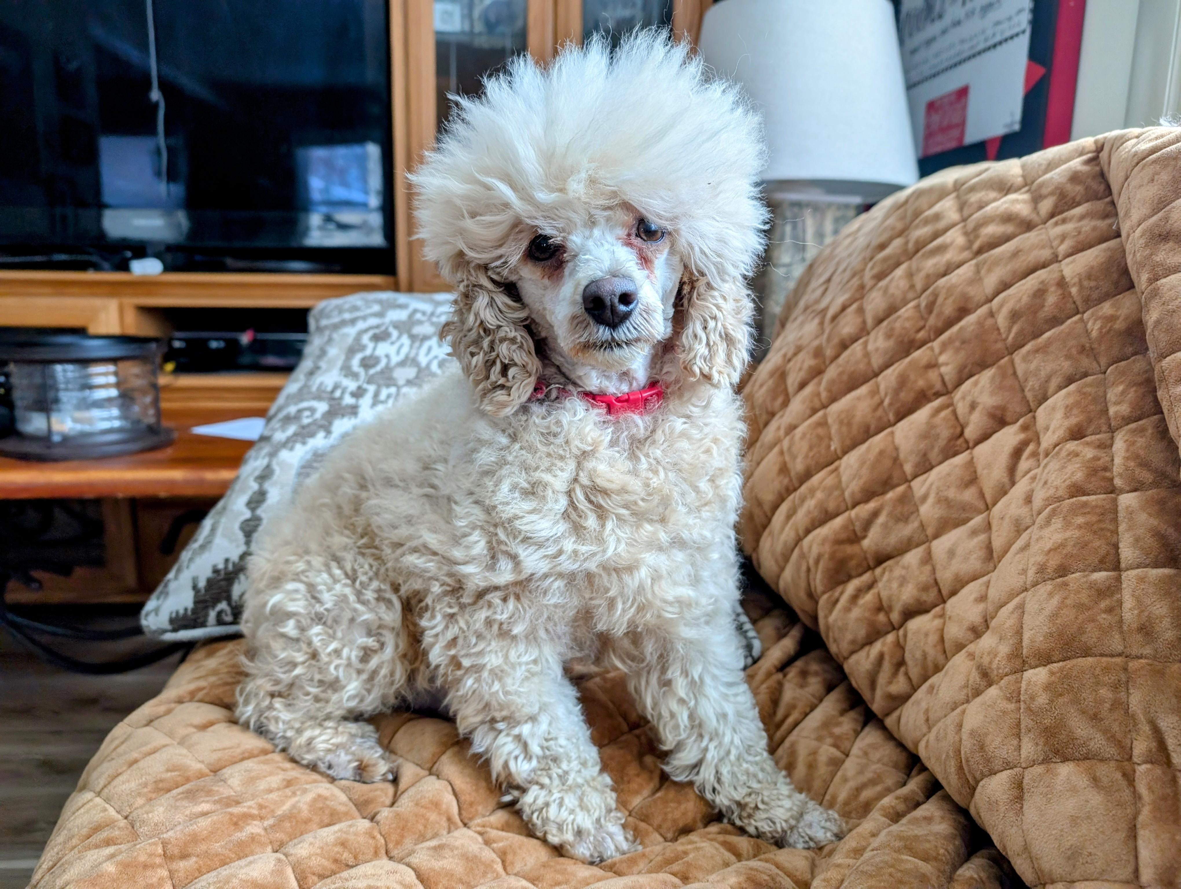 Essi is a chill poodle who enjoys being with her family. She loves laying on the couch and greeting everyone when they come home. I affectionately call Essi a couch potatoe. Oh! She is big on smiles. She will flash a toothy grin when walking up to you.