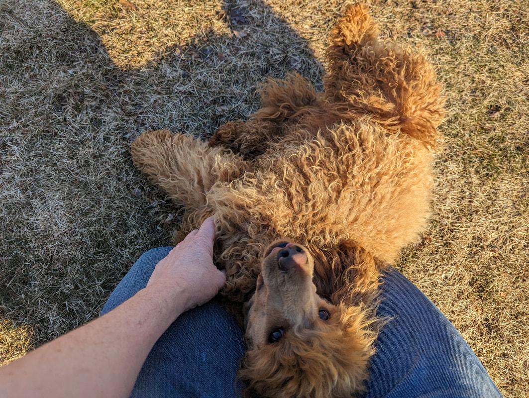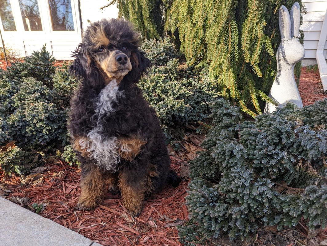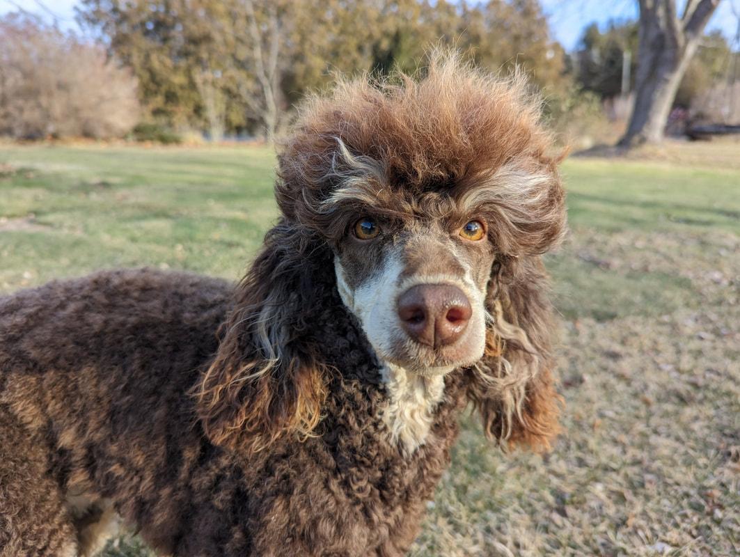 Michigan Mittens is my "shadow" dog. Wherever I go, there she is not too far behind. I love her immensely! She is a great listener and aims to please--like most poodles do. She is easy-going; she is not dominant and doesn't exhibit prey drive--squirrels don't faze her.