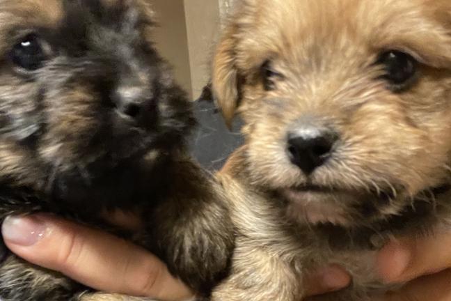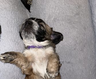 Our Shih Tzu puppies are black and white. Shorkie puppies are black gold and white. Yorkshire Terrier puppies are blue and gold. Colors will vary depending on the parent dogs.