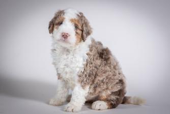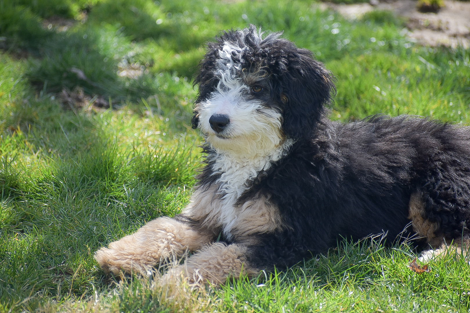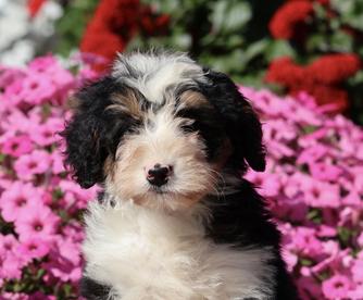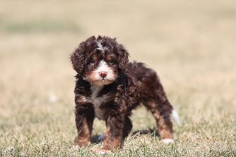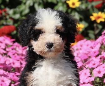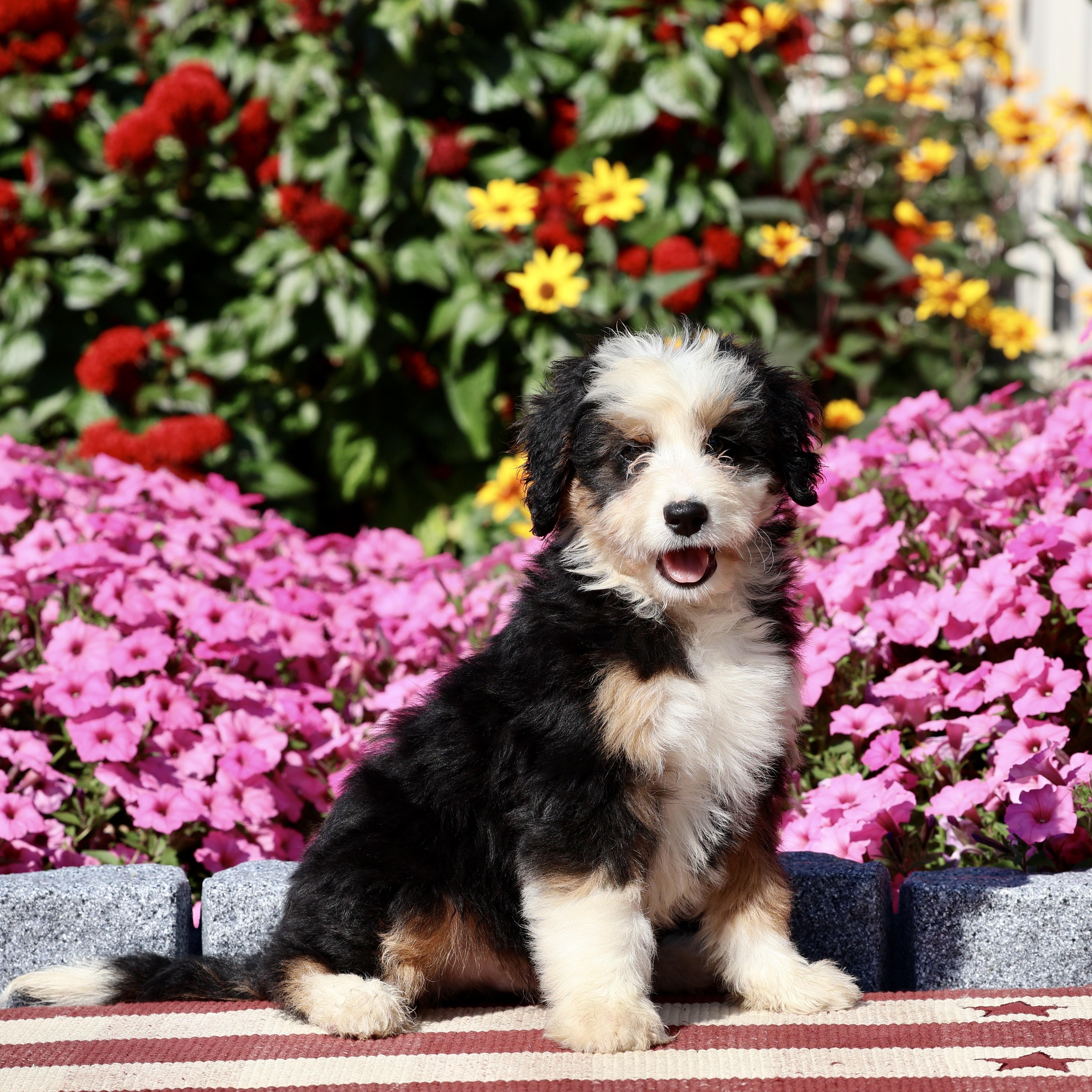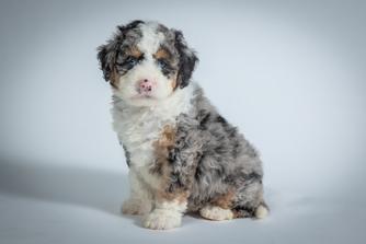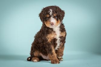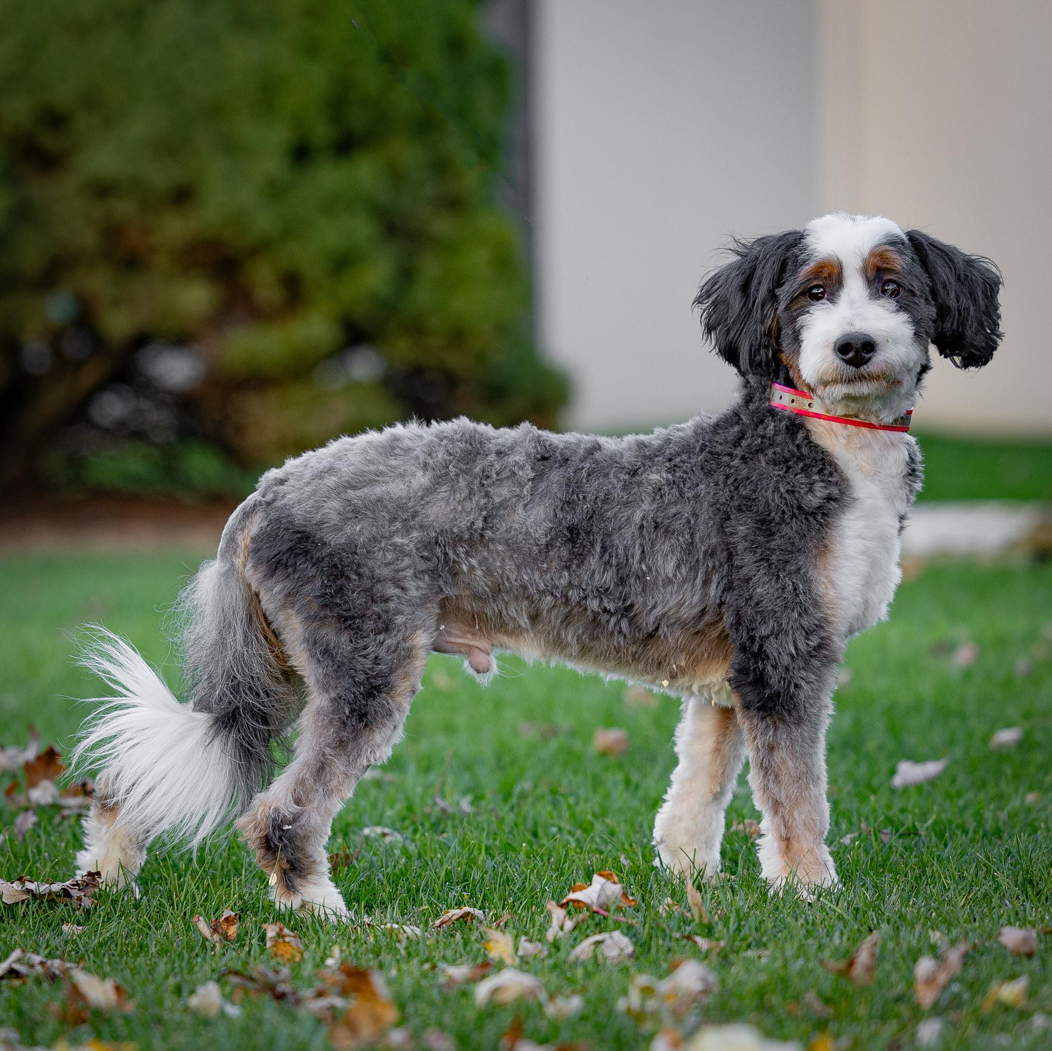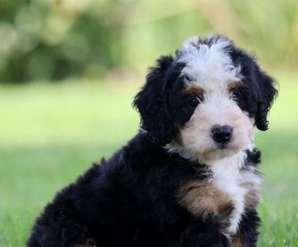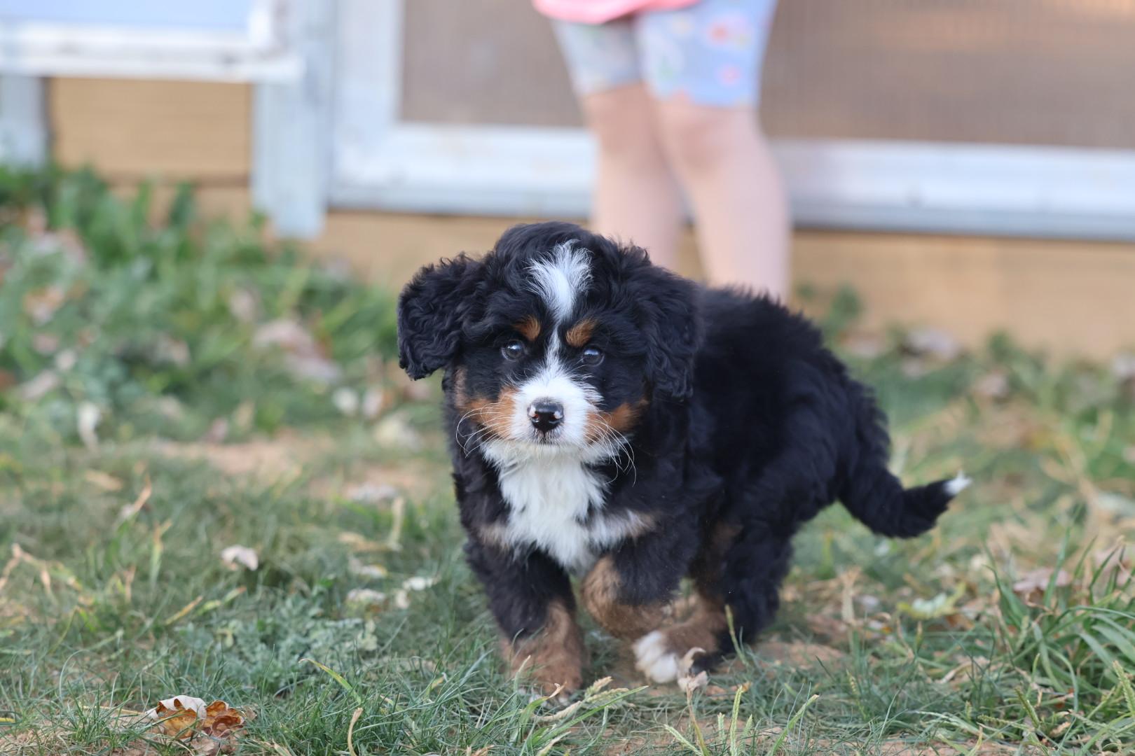 This exquisite mini Bernedoodle female showcases a stunning tricolor coat, a beautiful tapestry of rich hues that highlights her graceful build. Her gentle, expressive eyes reflect the intelligence and affectionate nature characteristic of her breed. As a dam, she possesses a nurturing spirit, exhibiting a natural tenderness towards her potential offspring. Her compact size and balanced conformation make her an ideal example of the mini Bernedoodle, blending the best traits of her Bernese Mountain Dog and Poodle heritage.
