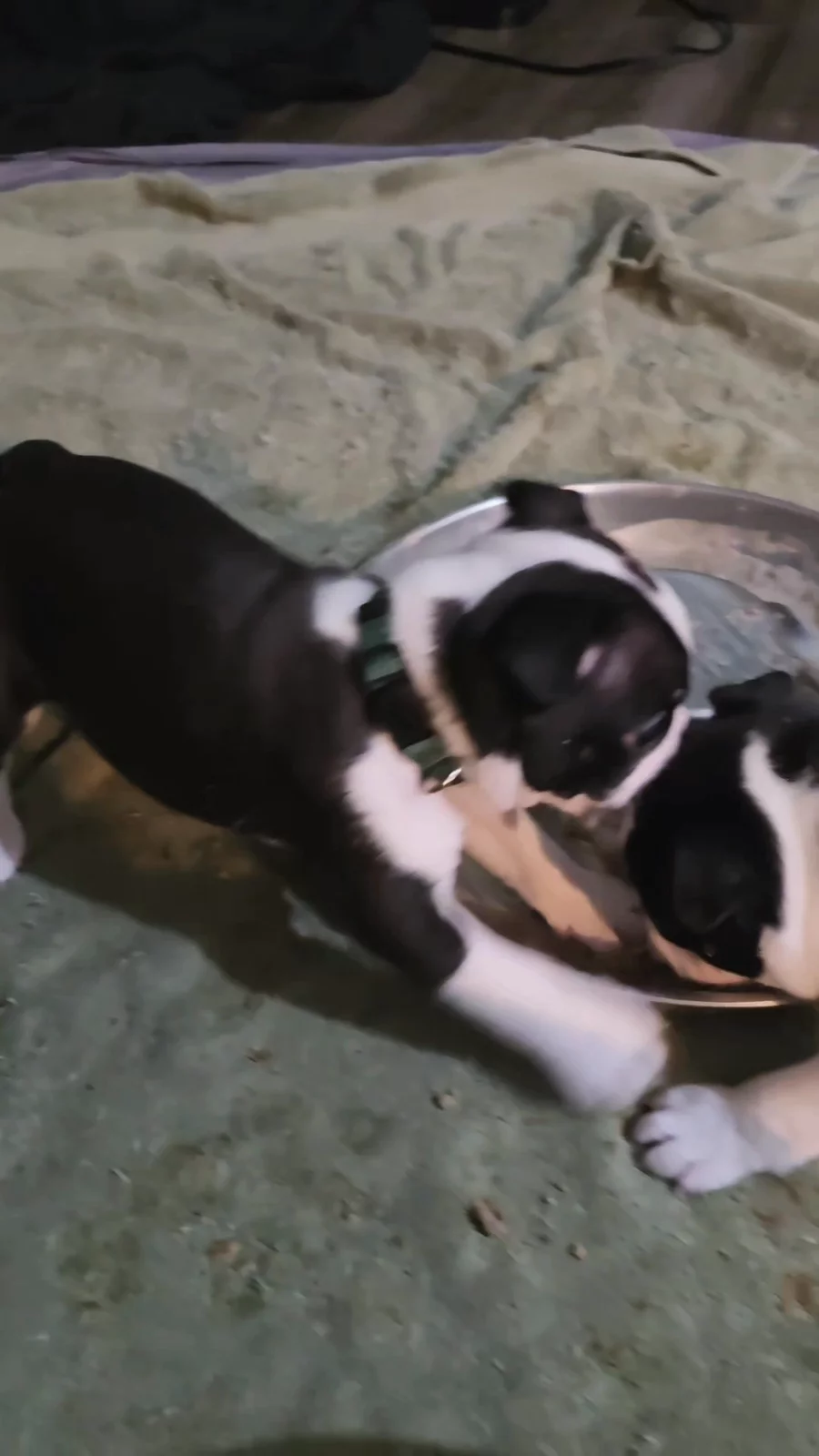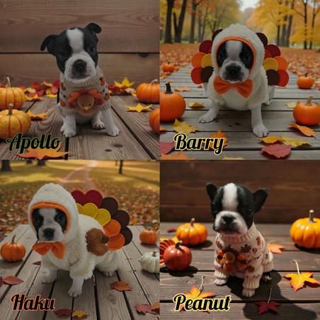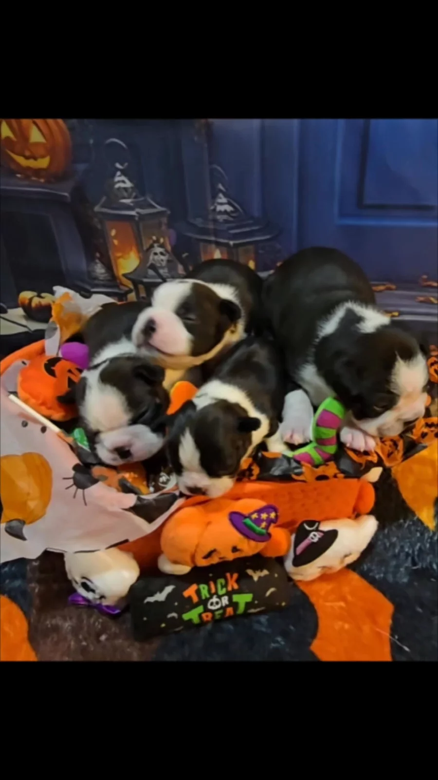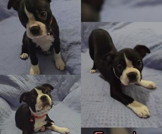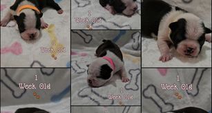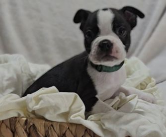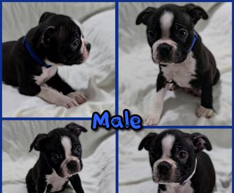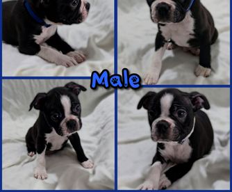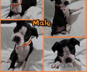 Our American Bully puppies include blue, fawn, blue fawn, and black. Boston Terrier puppies are black and white. Colors will vary depending on the parent dogs.
