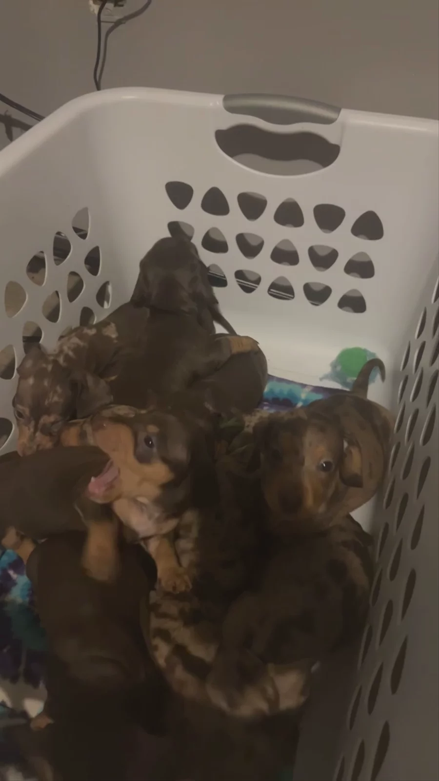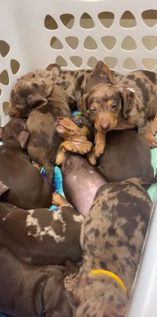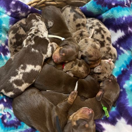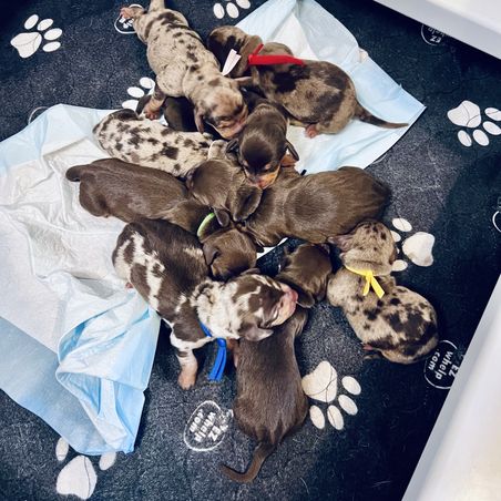 Our puppies include piebald, fawn (isabella), chocolate and tan, and dapple. Colors will vary depending on the parent dogs.