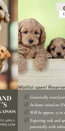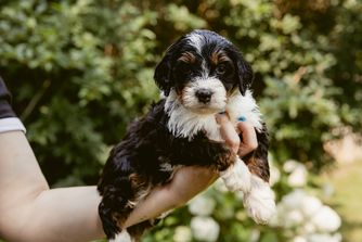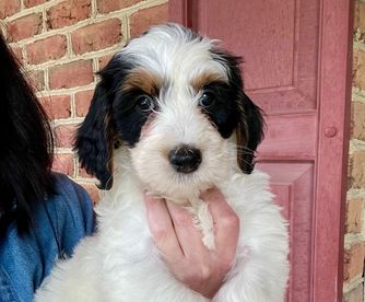 Our Bernedoodle puppies include red, sable, and tri-color. Cockapoo puppies include red and white, red, and cream. Assorted Doodle Crosses puppies include merle, red, parti, cream, chocolate, and apricot. Colors will vary depending on the parent dogs.