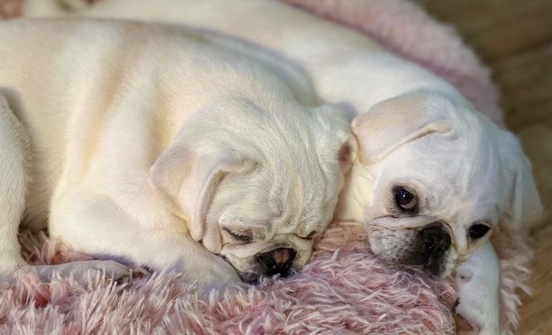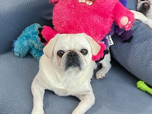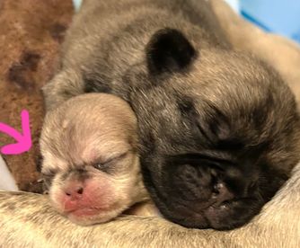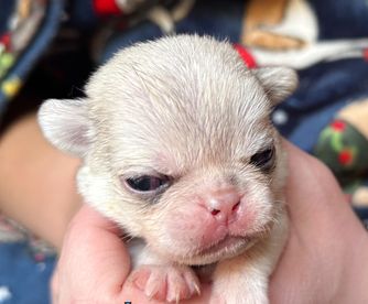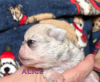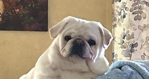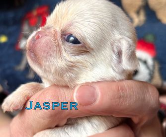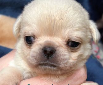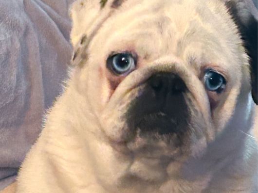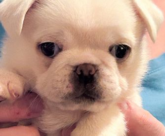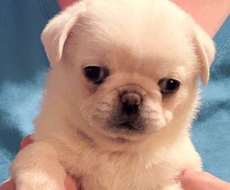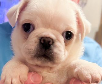 Beautiful maskless Fawn. She has sparkling light blue eyes. Very petite and boxy frame. Double curl tail and double coat. She loves her people and other dog and kitty roommates. She desperately wants to play with our free range chickens but my poultry refuse😉