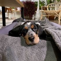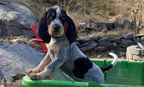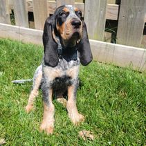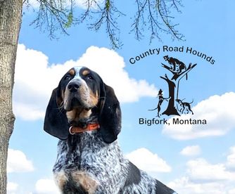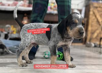 Our Bluetick Coonhound puppies are blue ticked and tan. Colors will vary depending on the parent dogs.