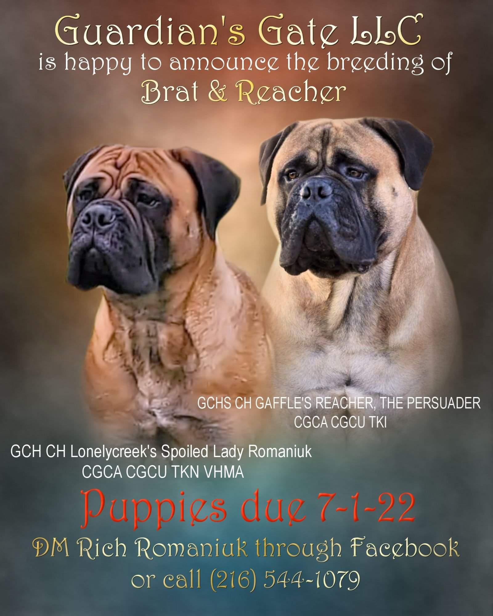 I'm Rich R., the breeder behind Guardian's Gate located in Windham, OH. We focus on breeding healthy, high-quality Bullmastiff puppies. We enjoy showing our dogs and care deeply about this breed. We built our program with care and intention in every step. We are passionate about the health and well-being of this breed, and it is our goal to provide each dog that comes from our program with a solid foundation of good health, neurological development, and loving care.